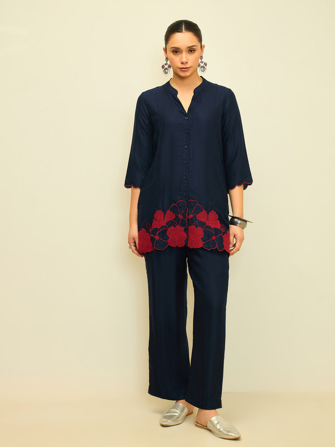 A refined take on statement denim, this co-ord blends fluid tailoring with intricate contrast detailing....
