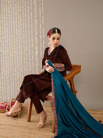 Drape yourself in elegance with this luxurious brown velvet kurta set. Designed with a classic...