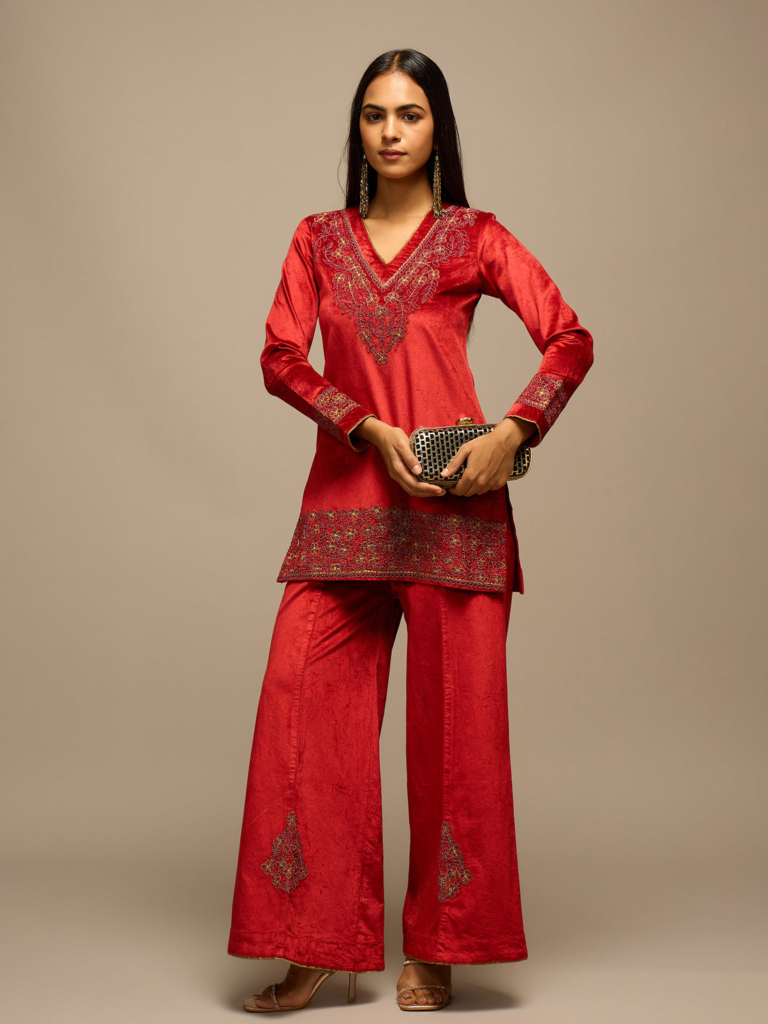 Add a festive charm to your wardrobe with this elegant red velvet short kurta set....