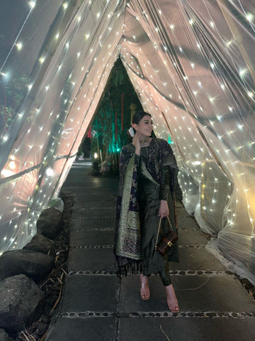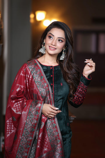 Turn heads this festive season with this exquisite dark green sharara set, crafted from luxurious...