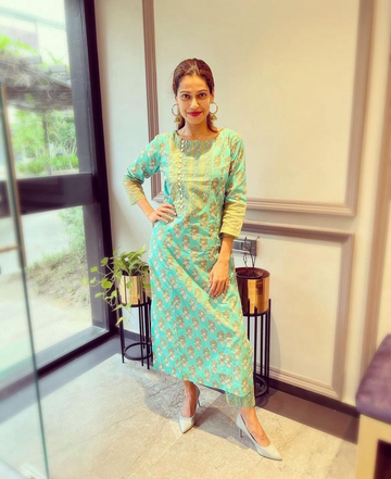 Add a refreshing touch to your everyday ethnic wear with this pea green checked kurta...