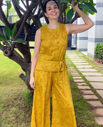 Turn heads this festive season with this yellow palazzo set crafted in luxurious viscose velvet....