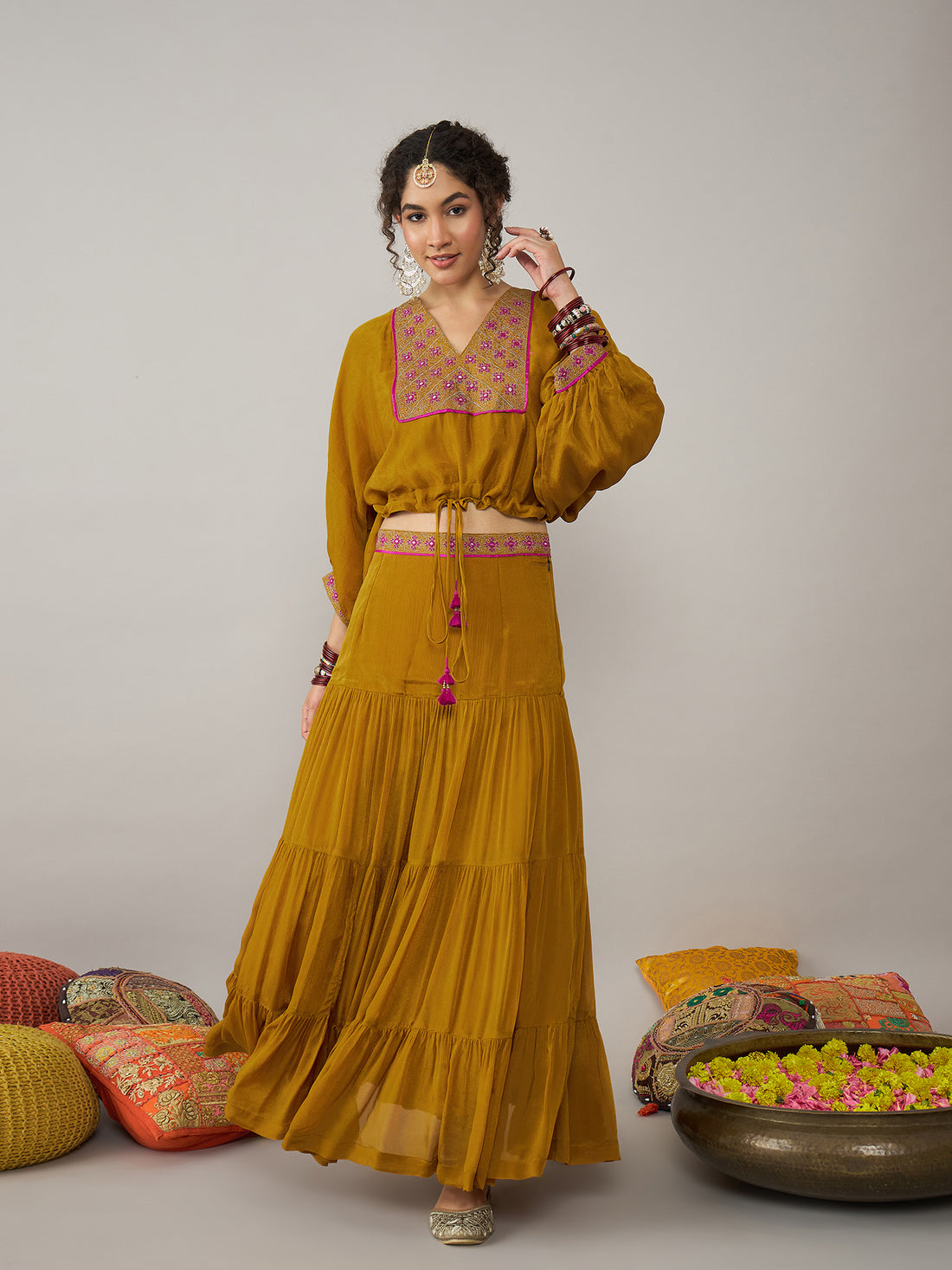 This Mustard Skirt Set effortlessly combines elegance with a playful touch. Featuring a flattering Ban-V...