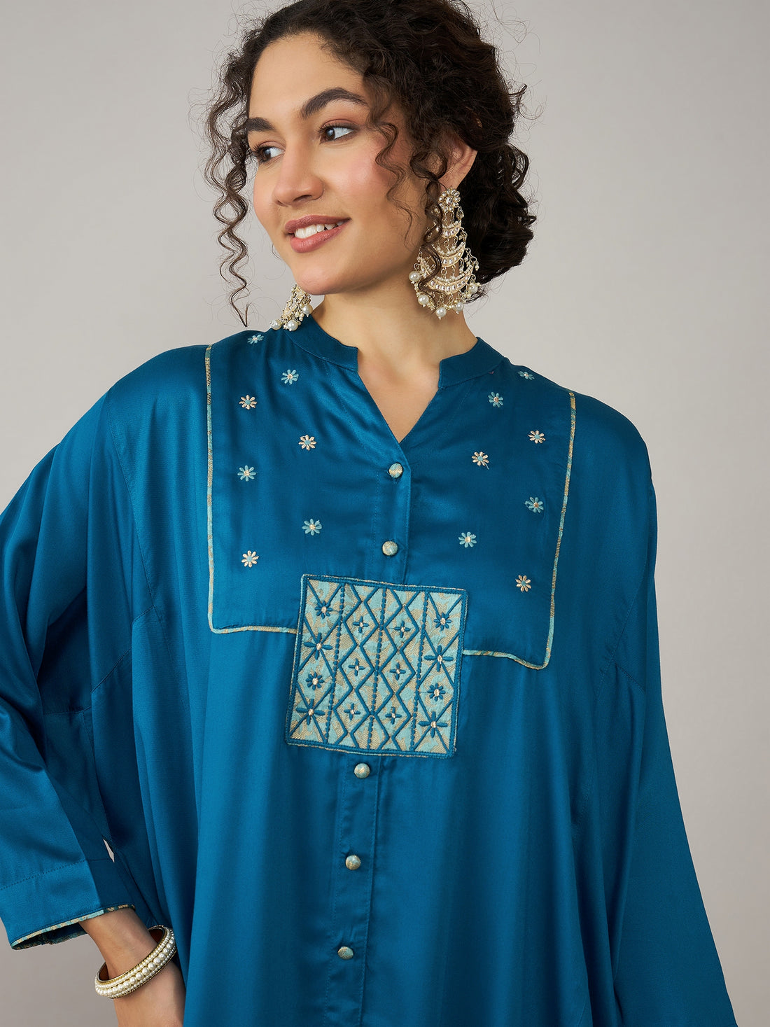 The Ferozi Kurta Set exudes an elegant charm with its Ban-V neckline and front button-down...