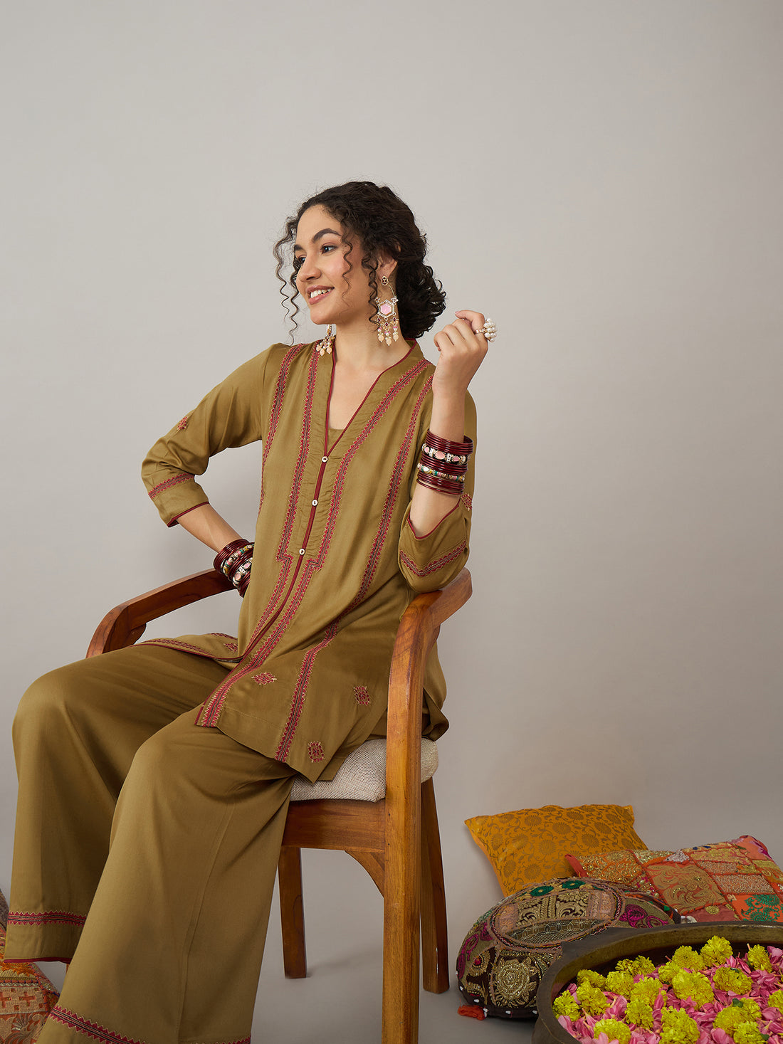 This vibrant mustard co-ord set radiates effortless elegance with its ban neck V-neckline and button-down...