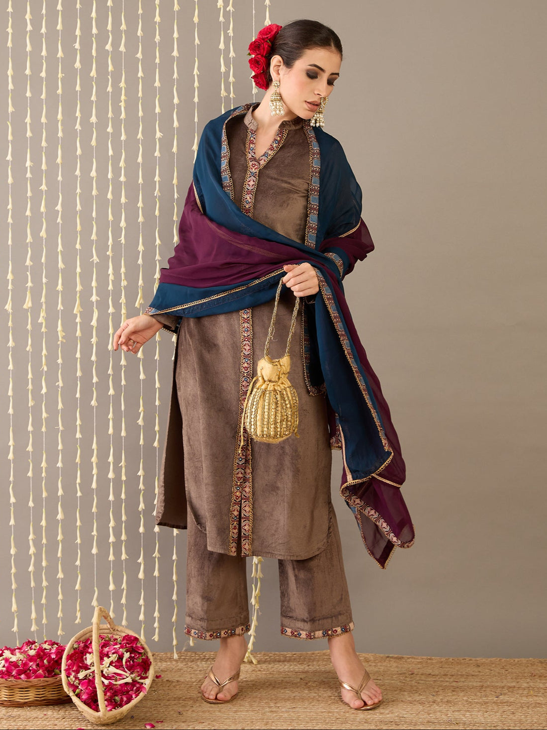 The BrownΒ Velvet Kurta Set blends traditional artistry with contemporary elegance. Featuring a flattering V-neck with...
