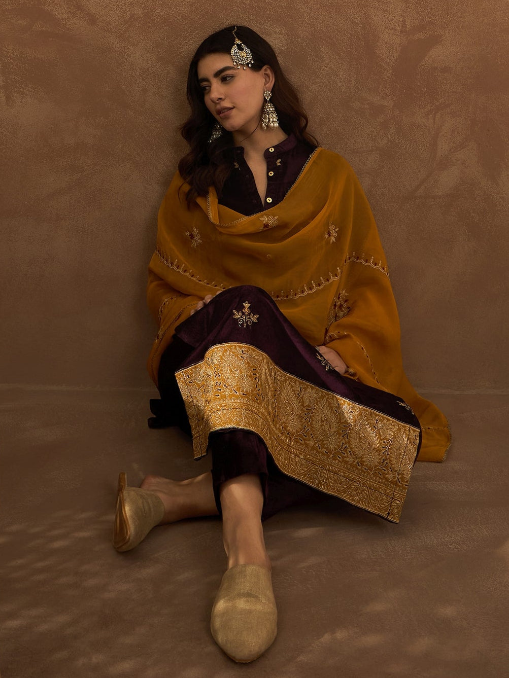 Exude timeless grace in this elegant Wine Velvet Kurta Set, designed with full sleeves and...