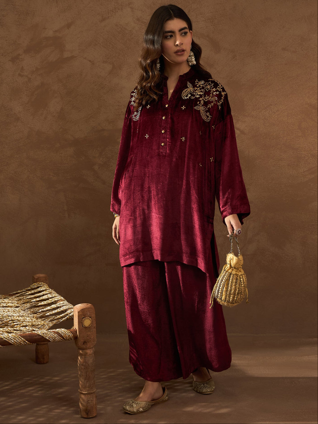 Channel quiet luxury with Ruhani, a deep maroon velvet palazzo set designed for timeless elegance....