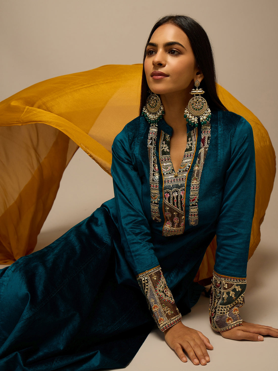 Elevate your festive wardrobe with this luxurious teal velvet kurta set, beautifully paired with a...