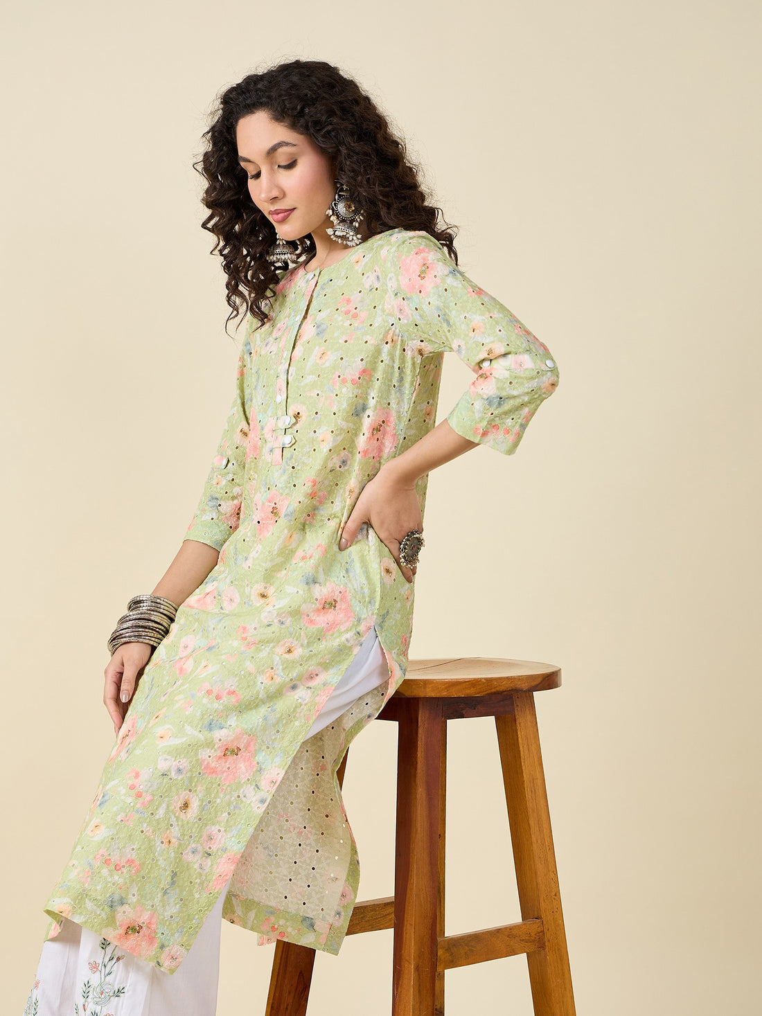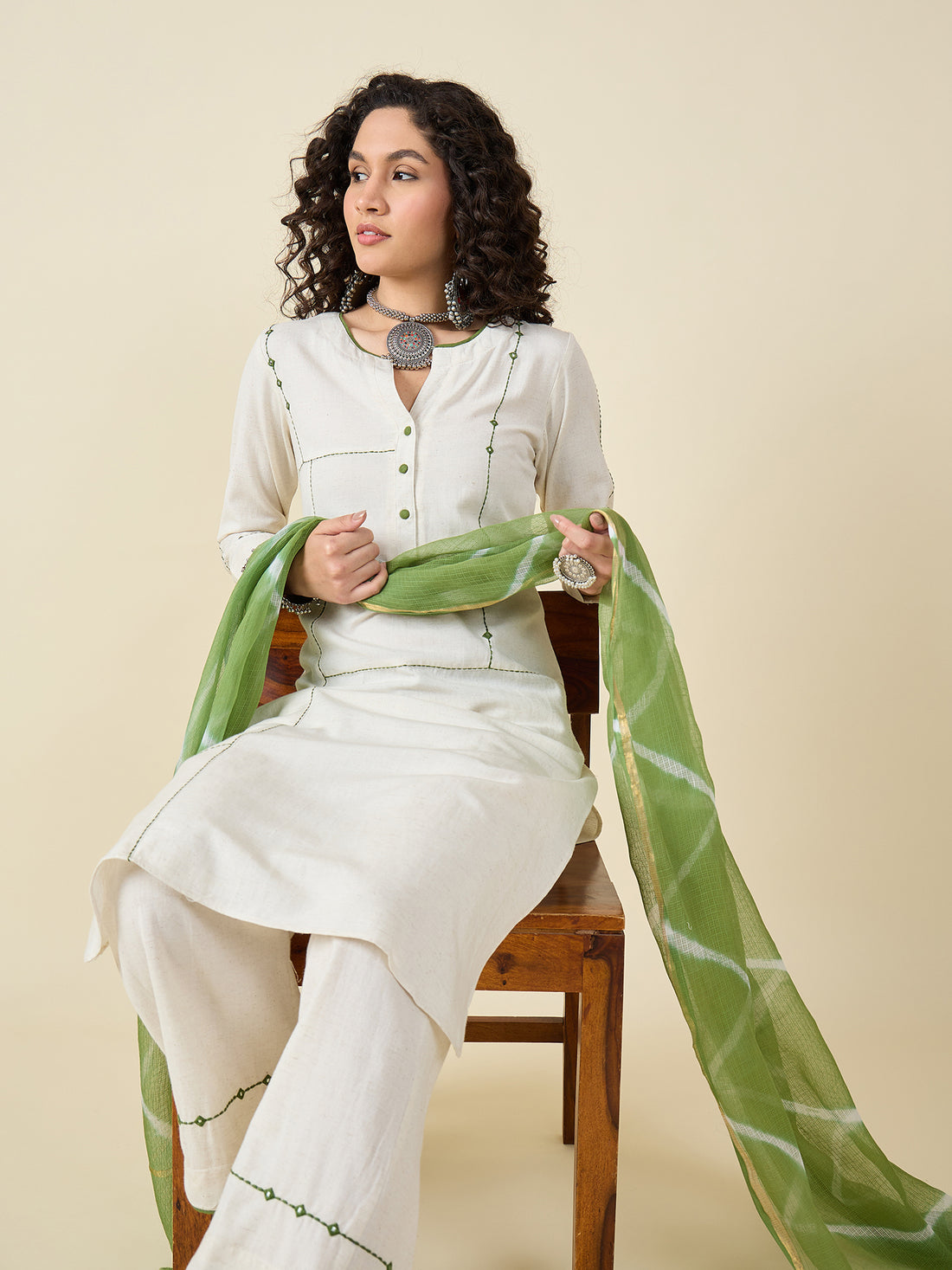 A refined blend of tradition and trend, this green kurta set features kaaj tanke-inspired embroidery...