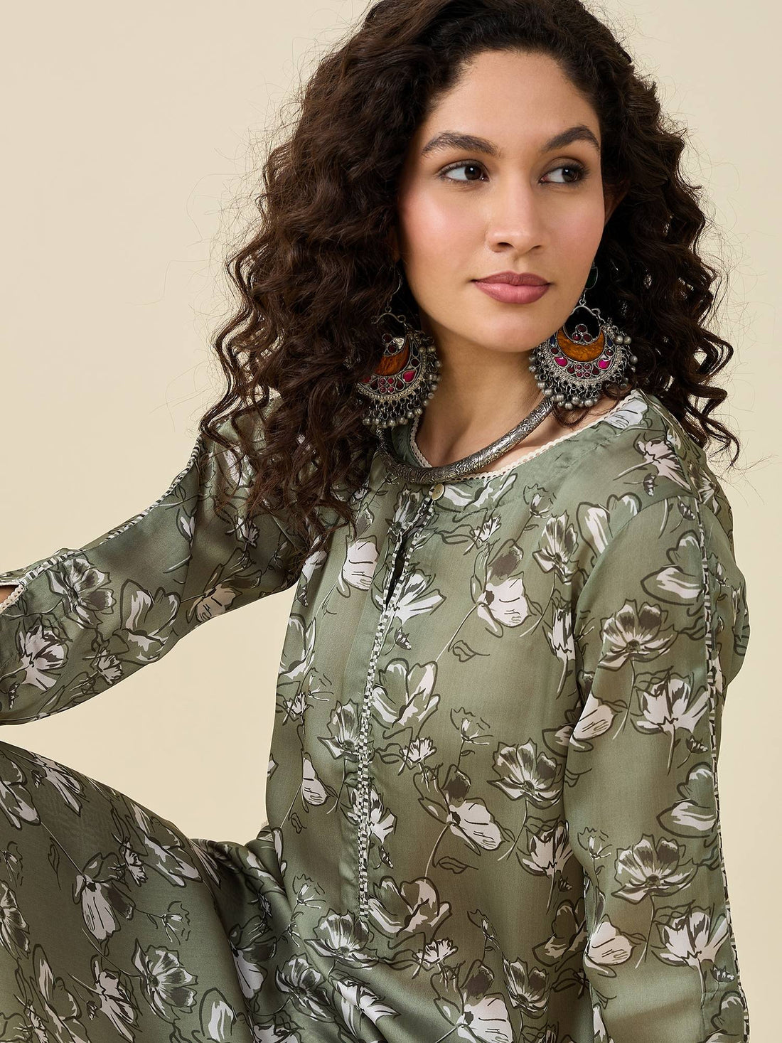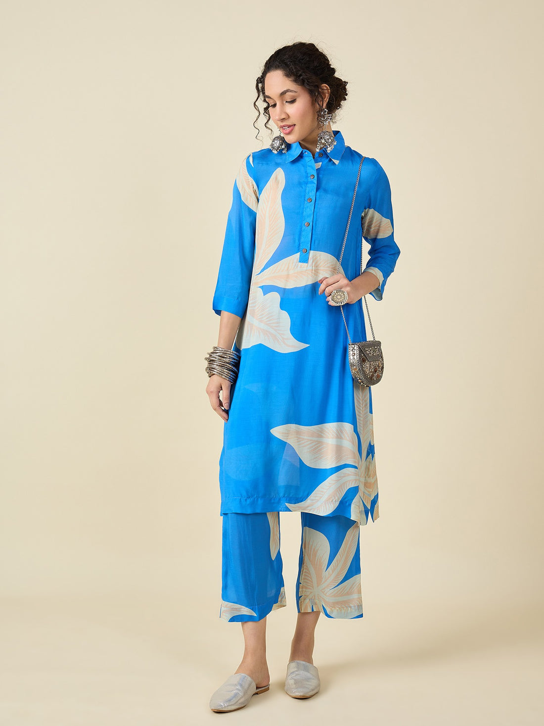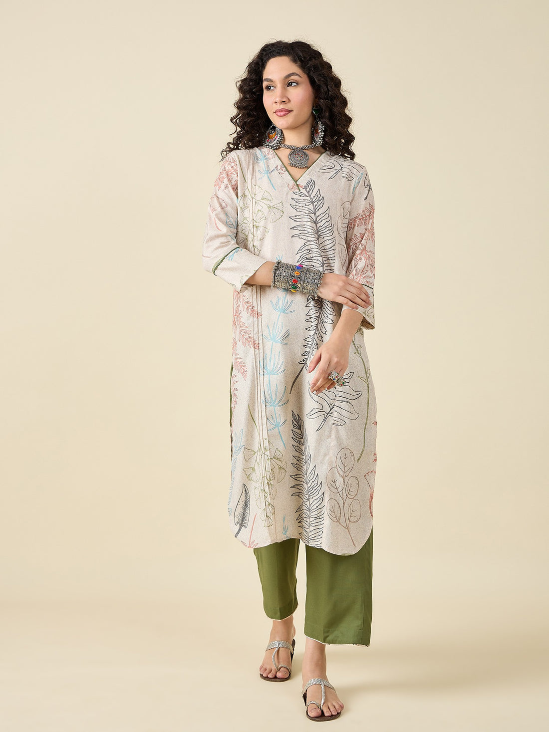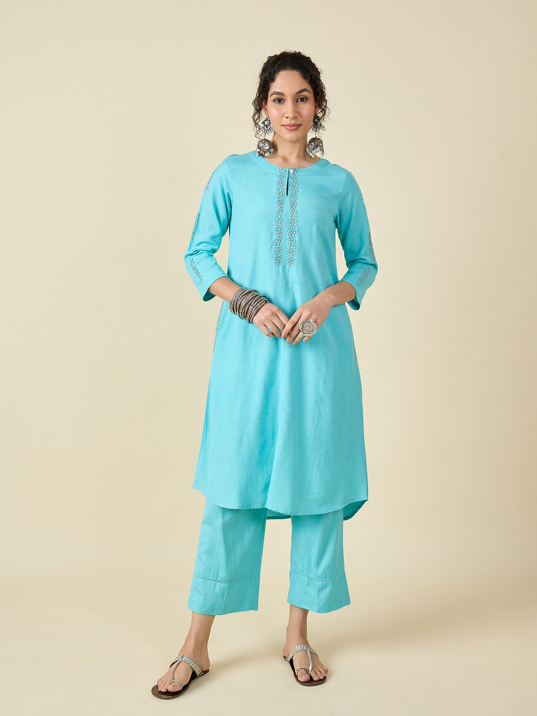 Elevate your casual style with this A-line kurta with straight pants, crafted from a soothing...