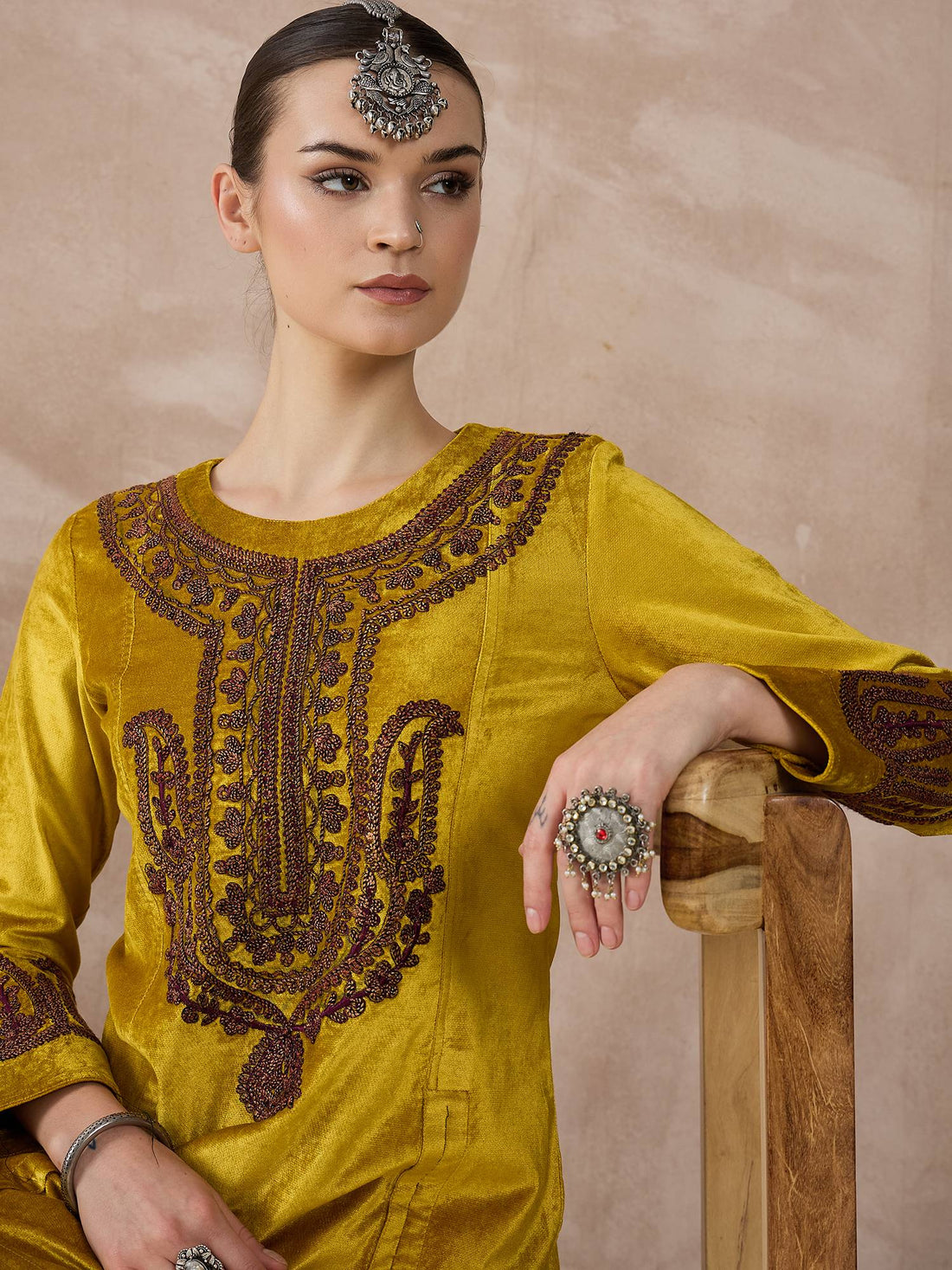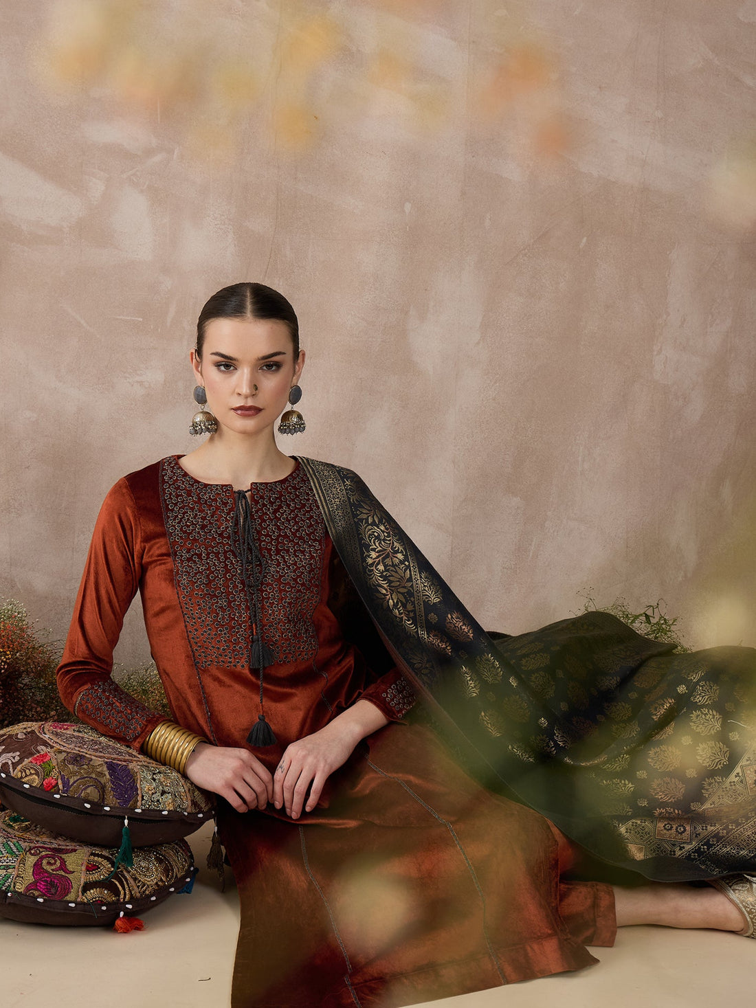 Step into the spotlight with this luxurious rust-colored viscose velvet kurta set, designed to combine...