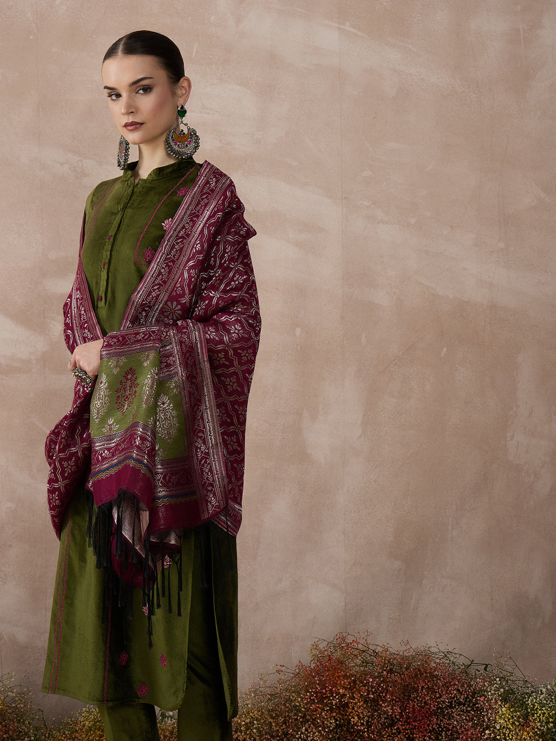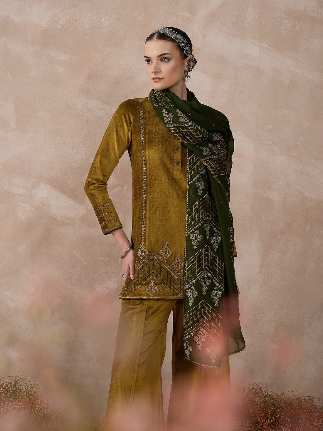 Step into elegance with this exquisite olive green viscose velvet kurta set, crafted in a...