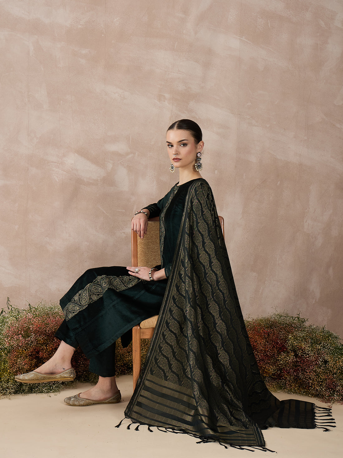 Make a sophisticated statement with this bottle green viscose velvet kurta set, ideal for festive...