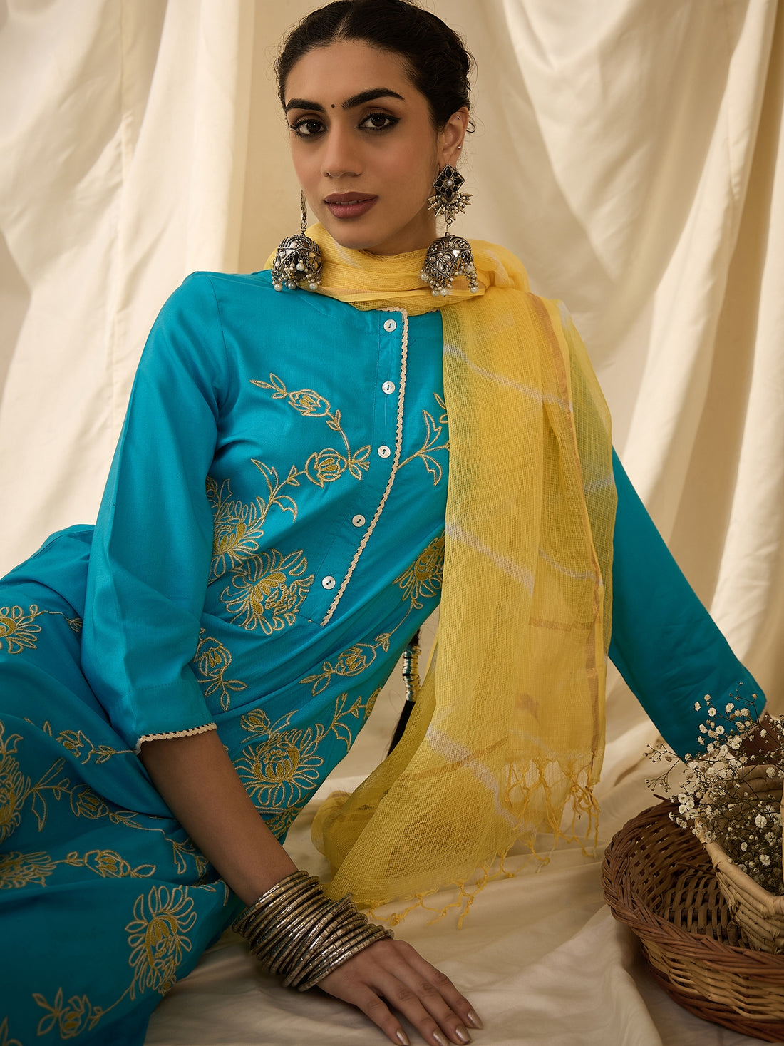 Elevate your style with this bright and elegant kurta set, featuring intricate and delicate embroidery...