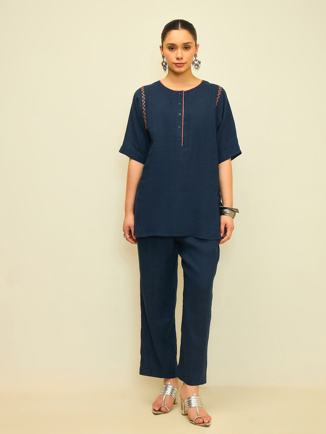 Clean lines meet subtle detailing in this refined linen co-ord set. The round neckline with...