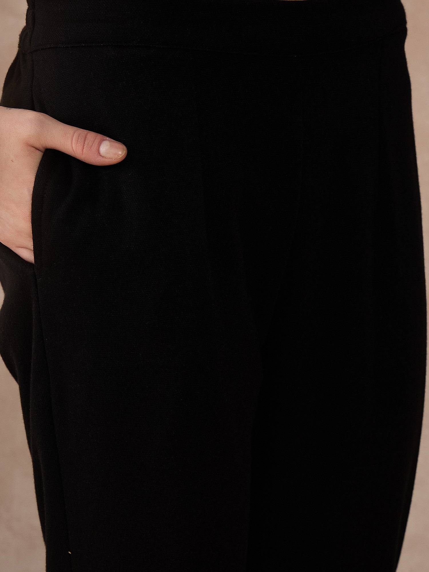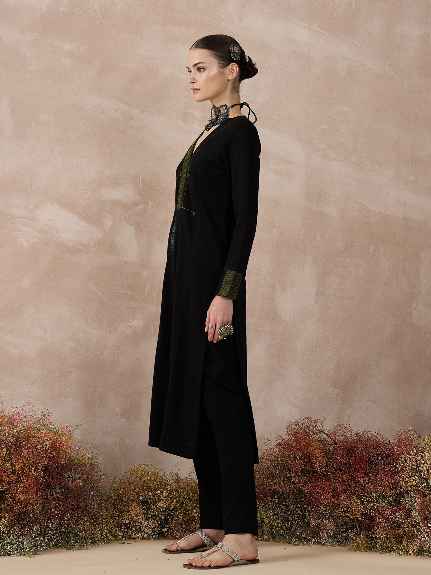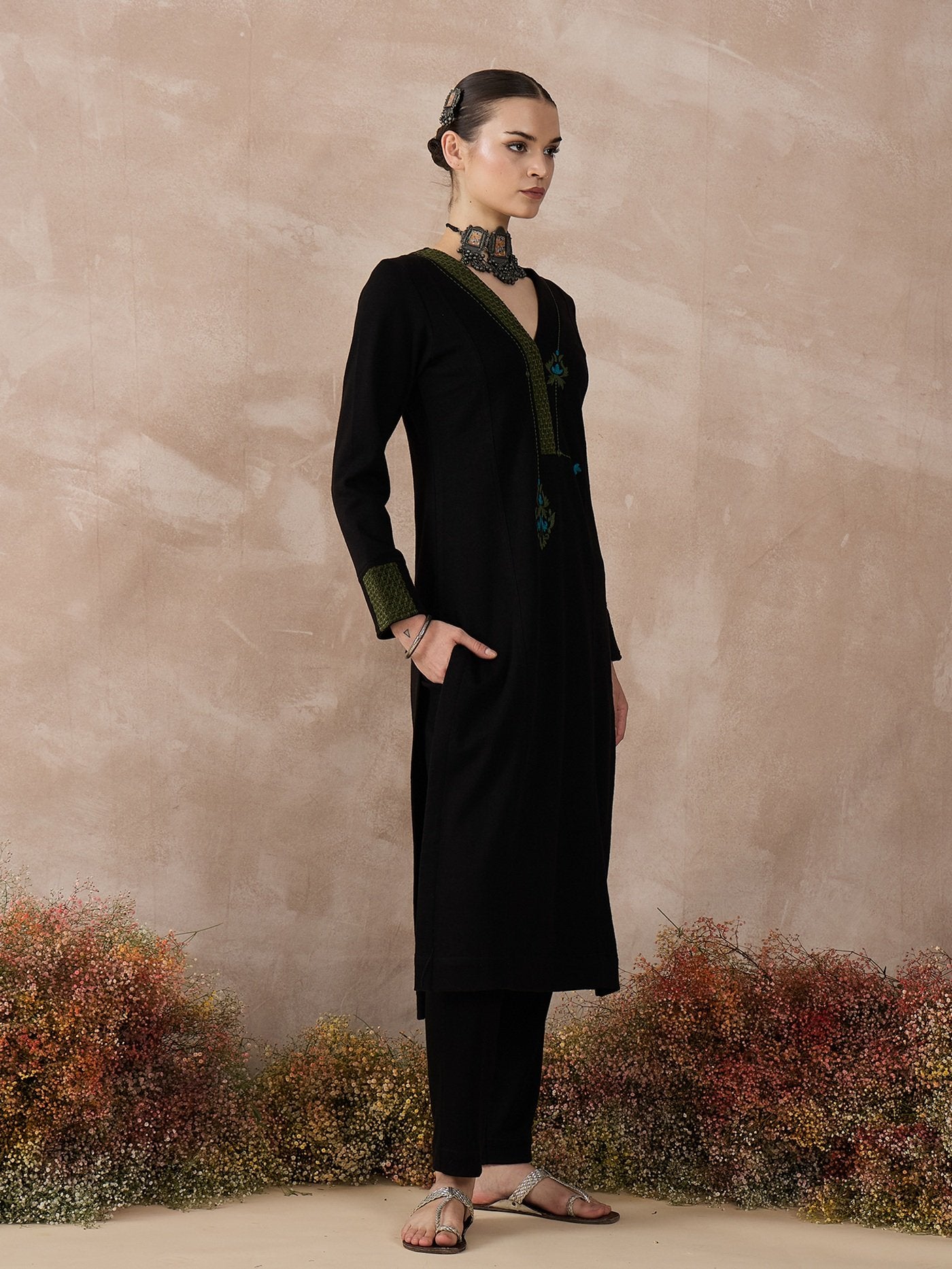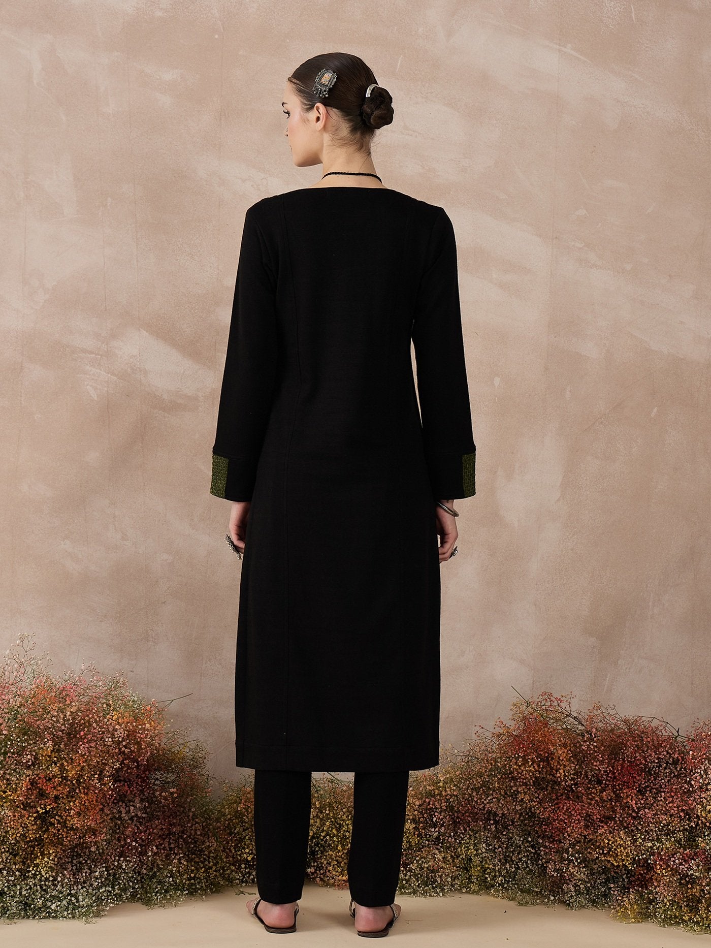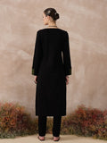 Step into comfort and style with this versatile black knitted kurta set, designed for semi-formal settings and smart workwear. The kurta features a modern blend of embroidery enhanced with velvet tweed finishings on the neckline and arms, giving it a chic yet polished look. Paired with regular fit pants, this set offers both warmth and ease, making it ideal for cooler days when you want to look elegant without compromising on comfort.