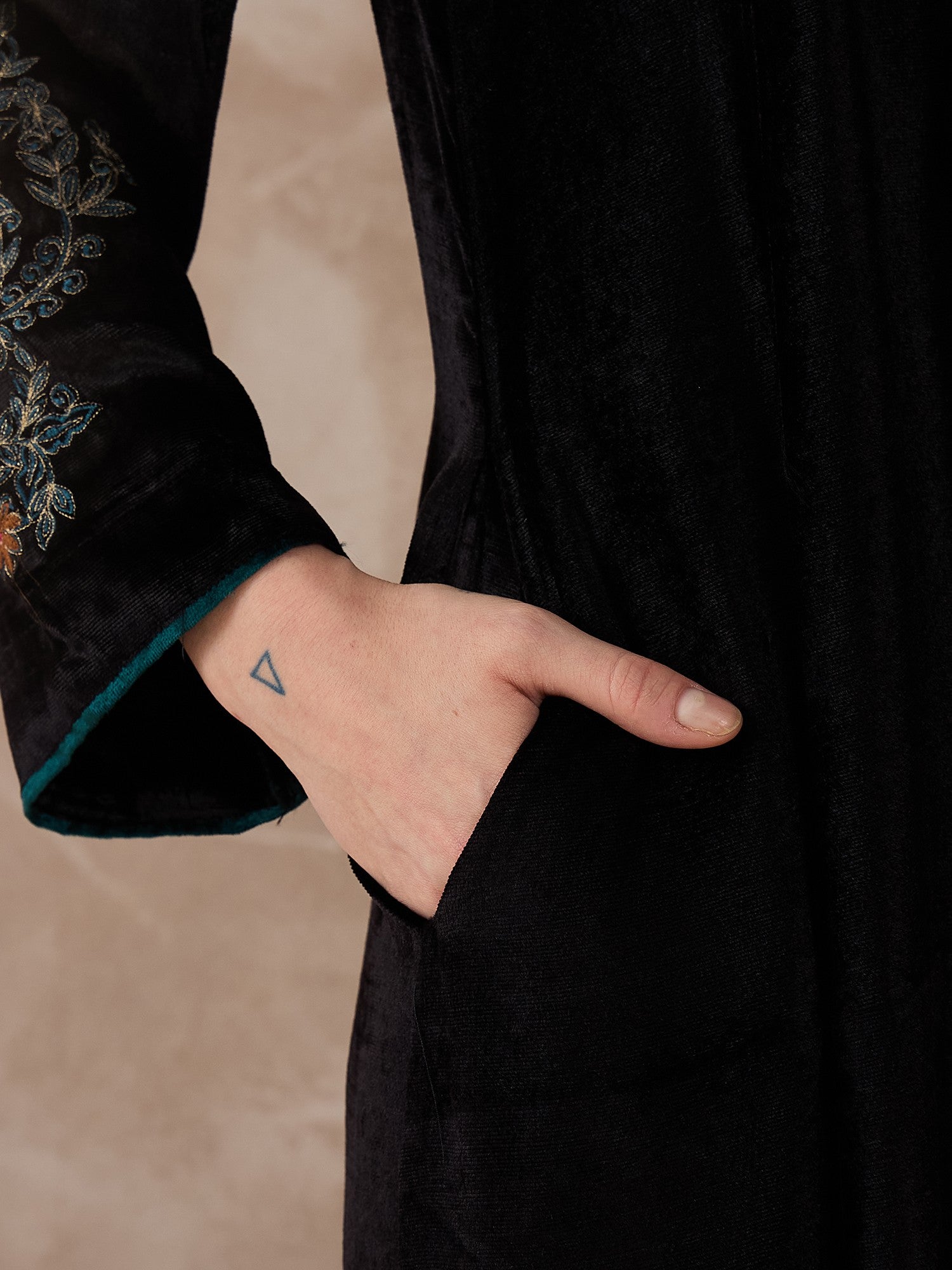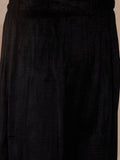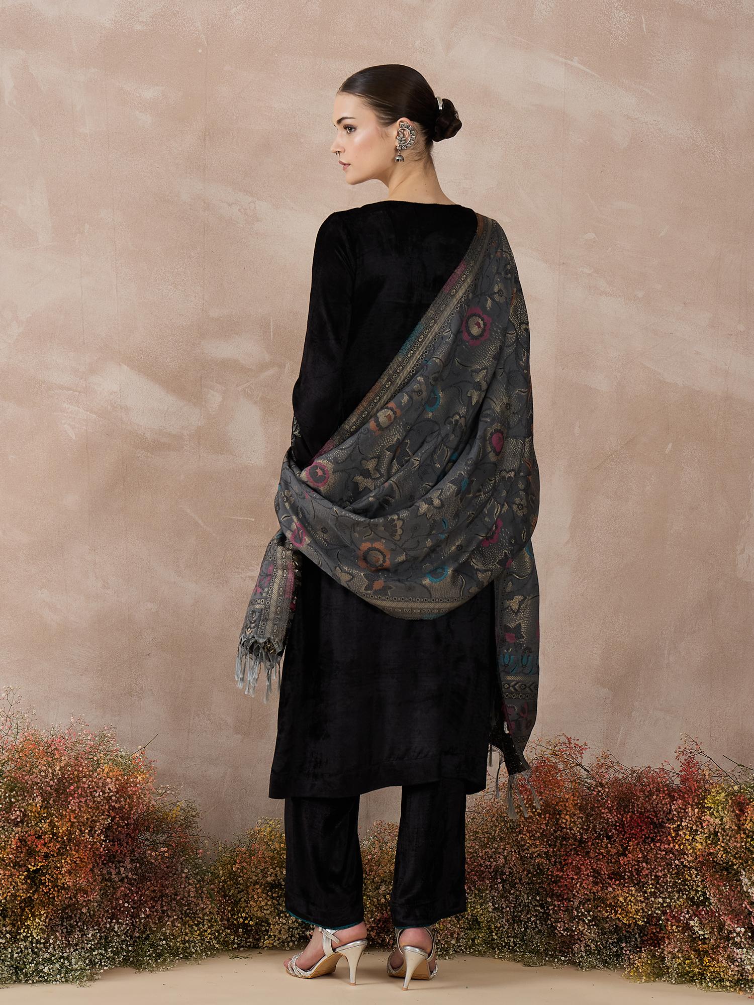 Drape yourself in regal elegance with this black silk velvet kurta set, cut in a flattering A-line silhouette and paired with sleek straight pants. The rich velvet canvas is elevated with intricate embroidery along the neckline and sleeves, adorned with delicate tassels and a traditional dori tie-up that adds movement and charm.