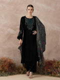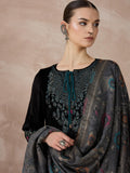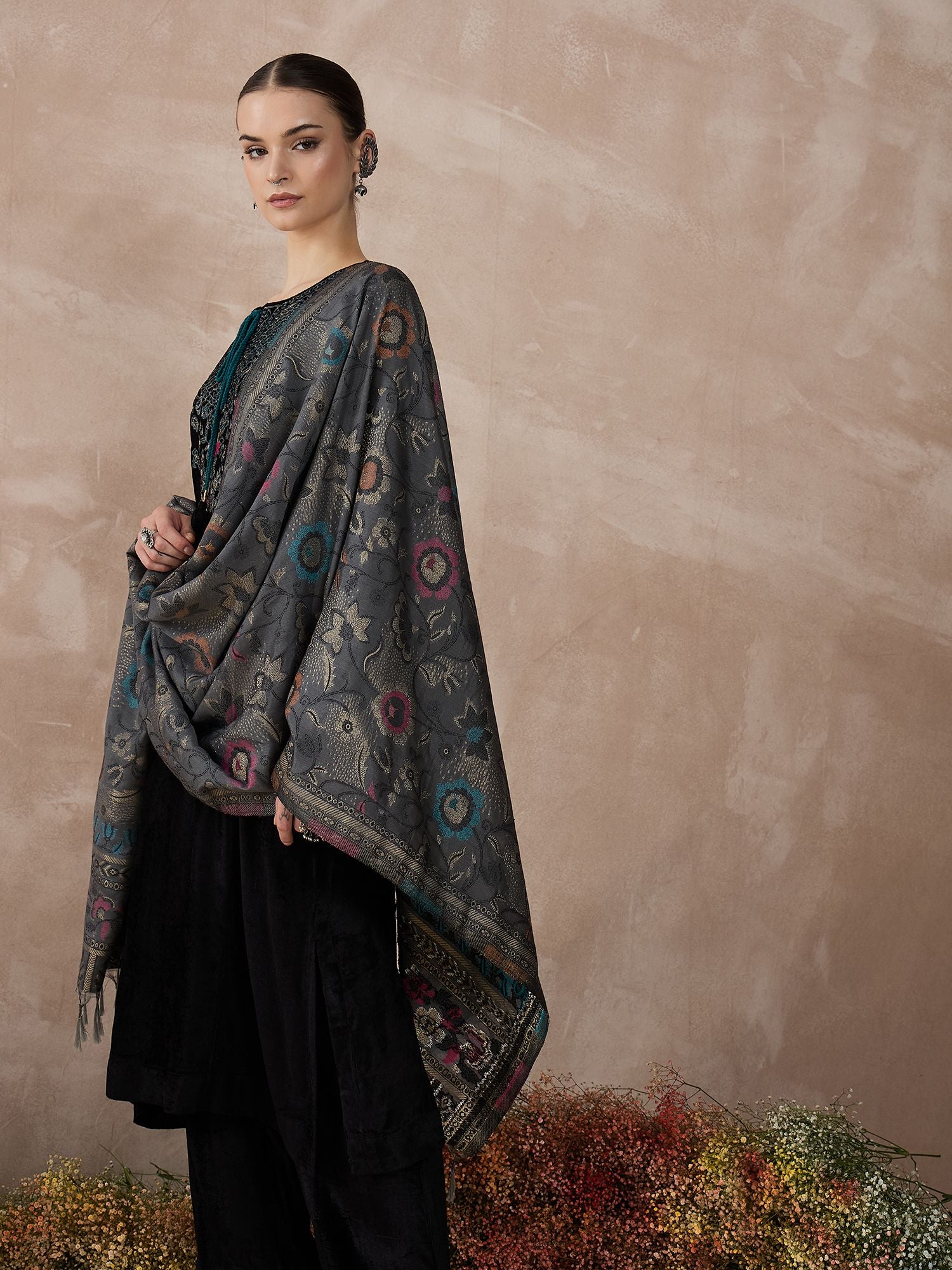 Balancing richness with subtlety, the ensemble is completed with a soft grey silk zari dupatta, blooming with understated floral motifs that beautifully contrast the deep black base.