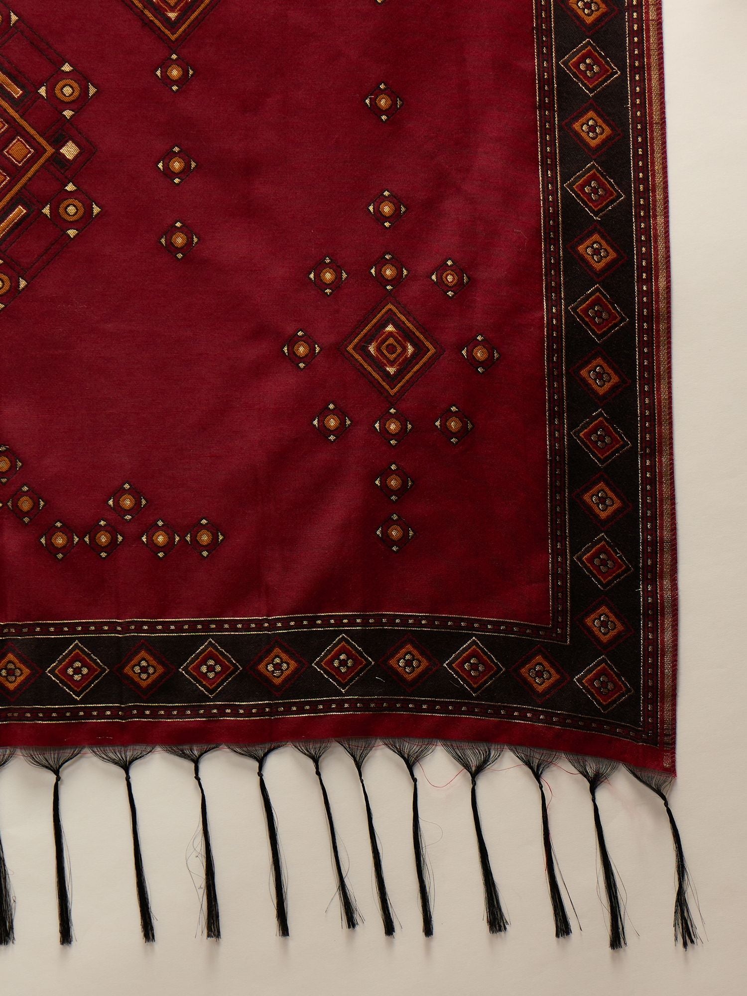 Paired with regular-fit pants and a vibrant multicolored ikat silk zari dupatta, the ensemble comes alive with rich textures and bold contrast. Perfect for festive celebrations and evening gatherings, this set is designed for those who appreciate detailed craftsmanship and standout elegance.