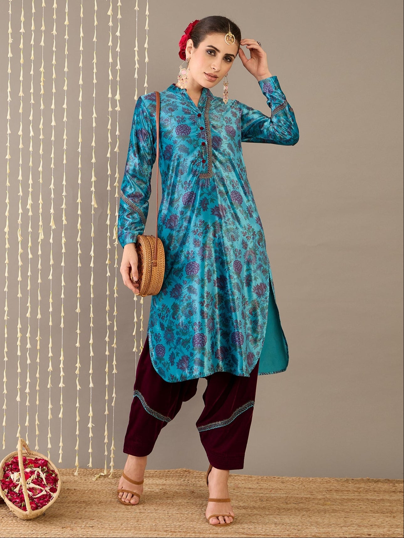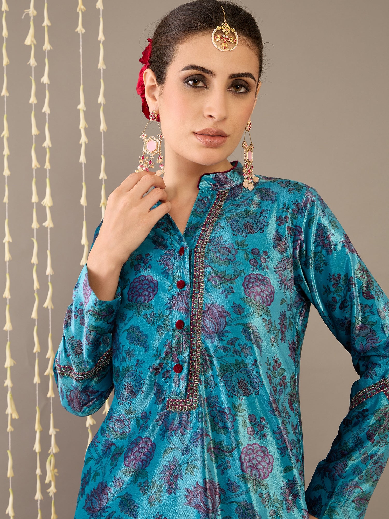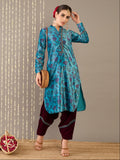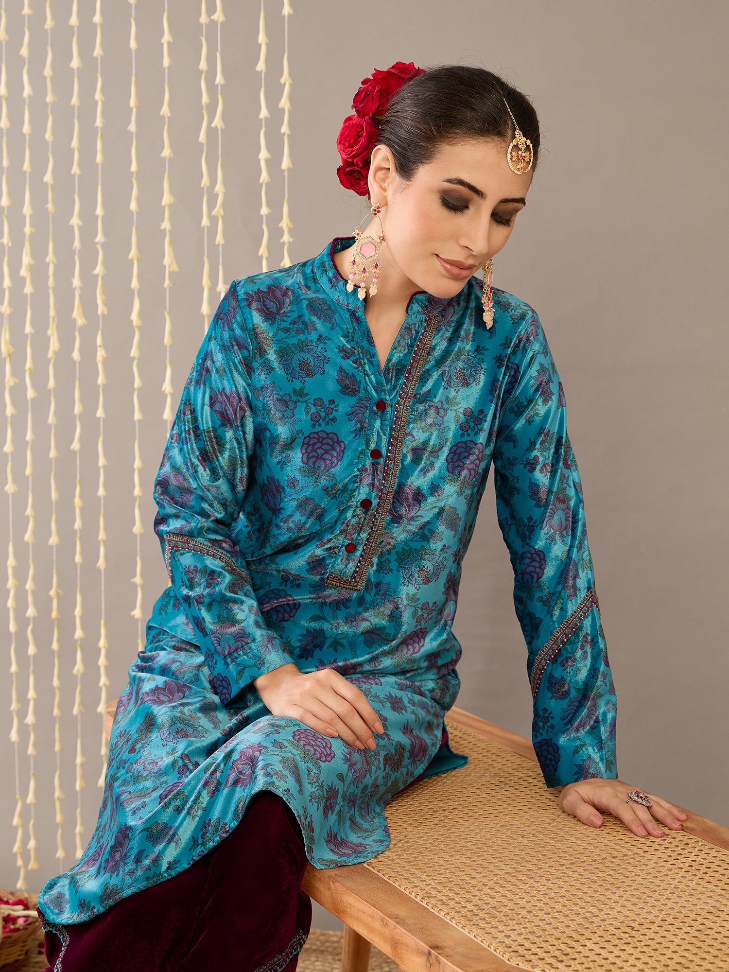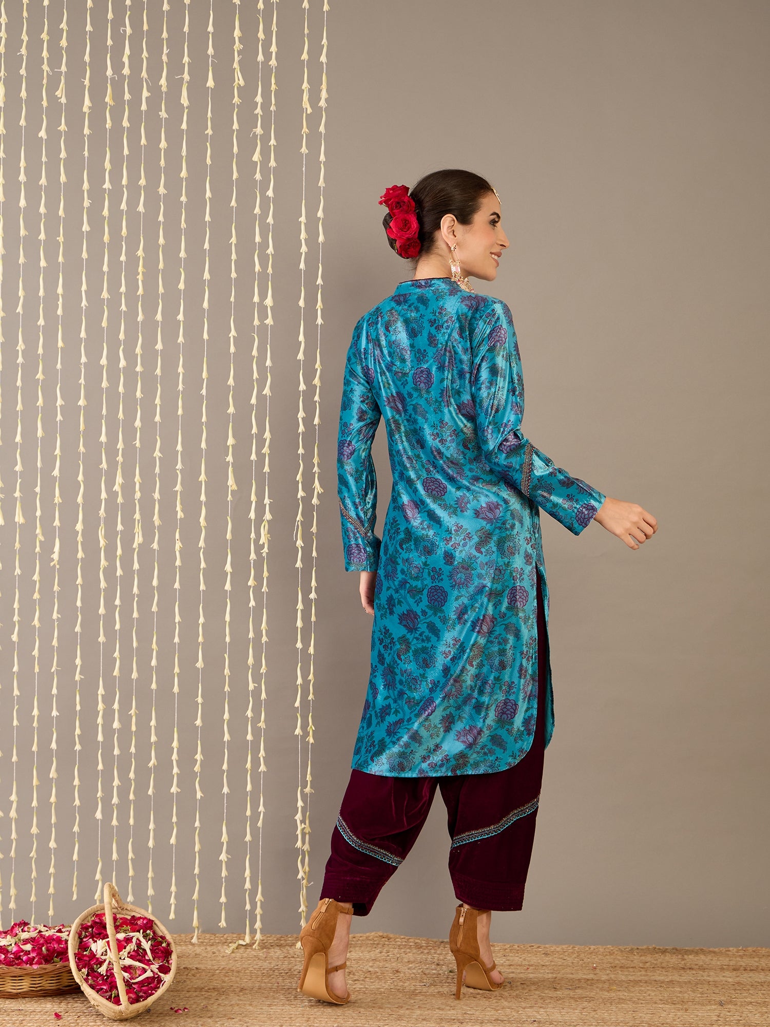 Make a statement this festive season with our Blue Printed Velvet Kurta Set, a perfect blend of traditional elegance and contemporary charm. Crafted in luxurious velvet, this kurta features a ban neck with a V-cut detail and a front button placket, adding a refined touch to the silhouette. The full-length sleeves provide a graceful look, making it suitable for festive and celebratory occasions.