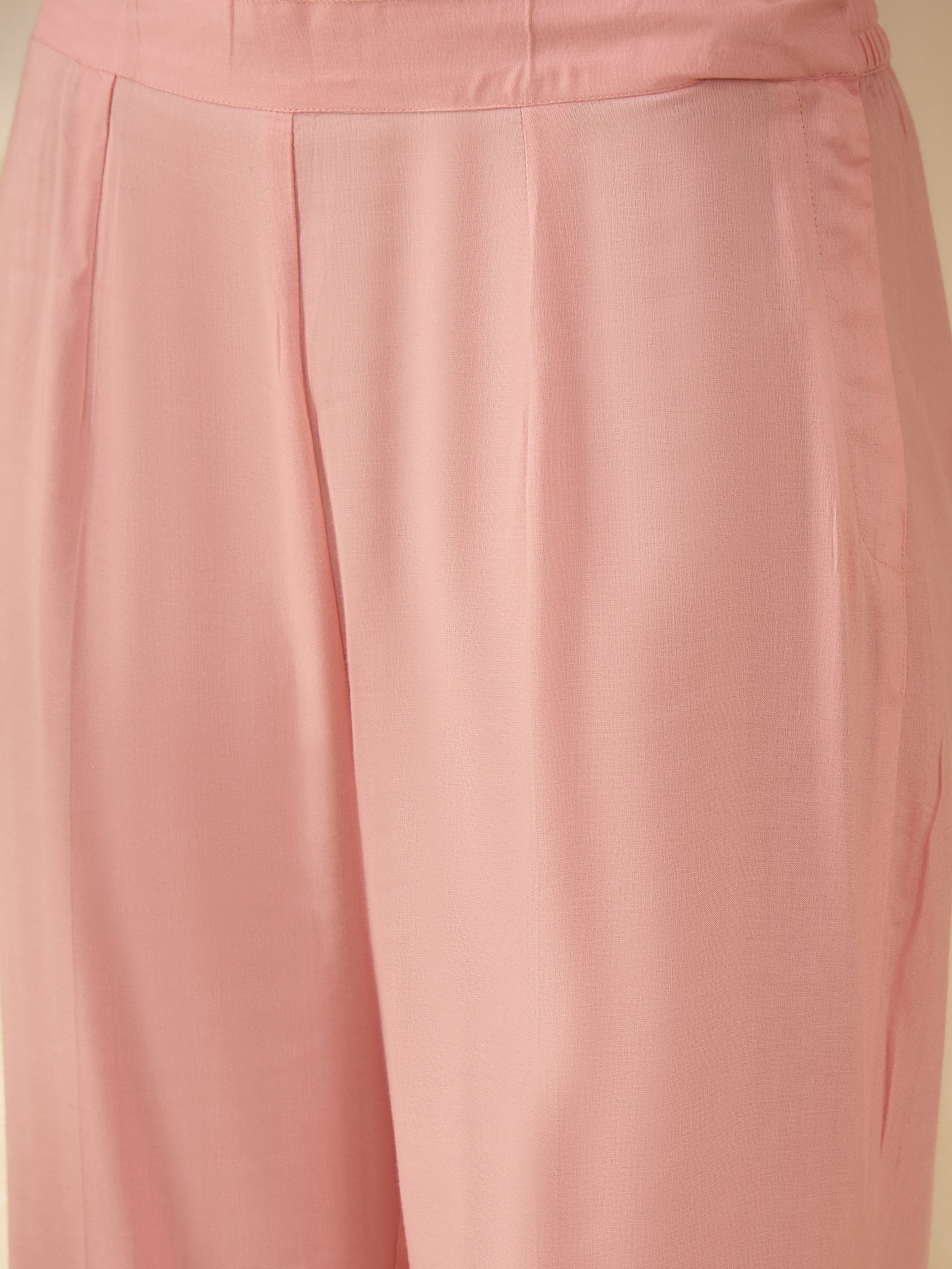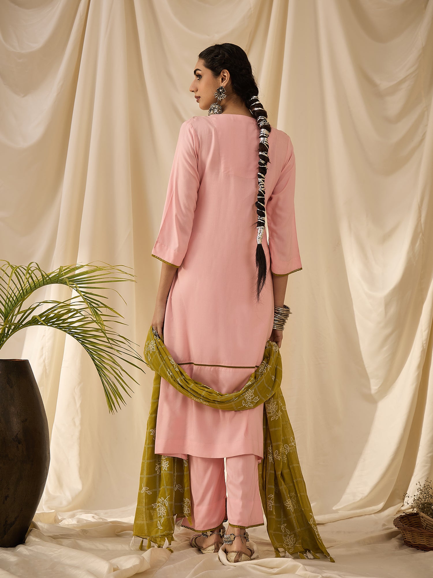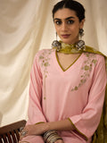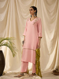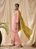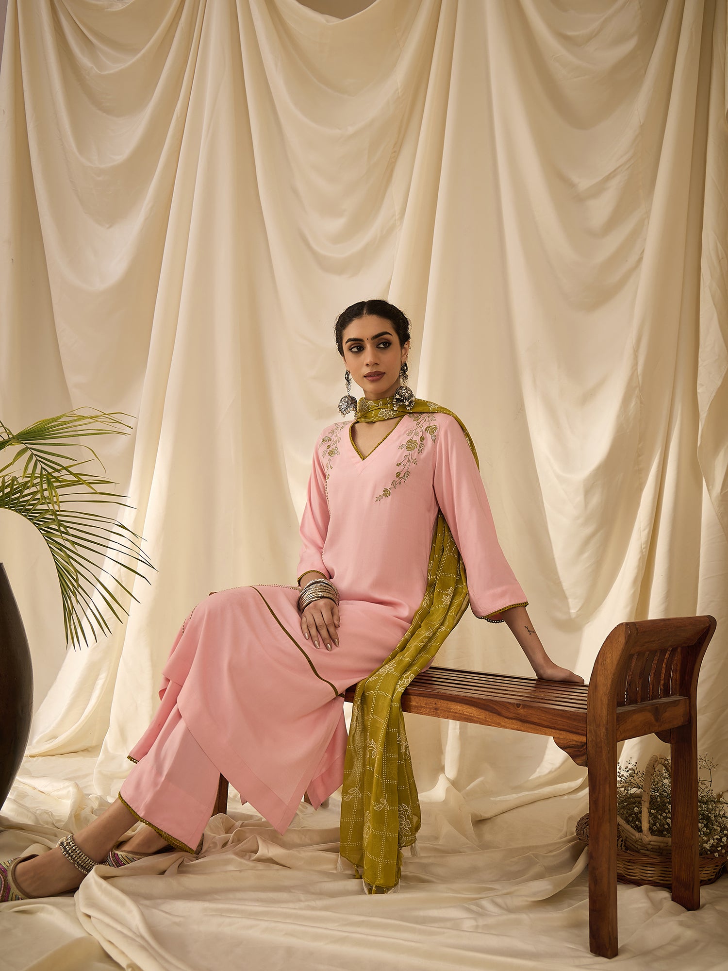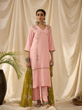 Stay stylish and comfortable this summer with this soothing kurta set, featuring contrast embroidery on the neck and delicate beading on the ghera and arms for an elegant touch. Paired with straight pants adorned with lace and a round cut, and a mulmul printed contrasting dupatta, this ensemble is the perfect blend of grace and summer-friendly comfort.