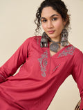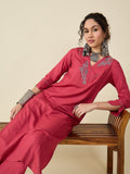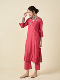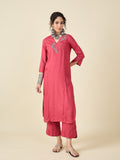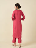 This smart casual kurta set boasts soothing lace work with intricate detailing on the neck, adding a touch of elegance. The kurta is paired with straight pants featuring lace accents and a stylish round button cut, offering a perfect blend of comfort, sophistication, and modern charm.