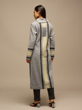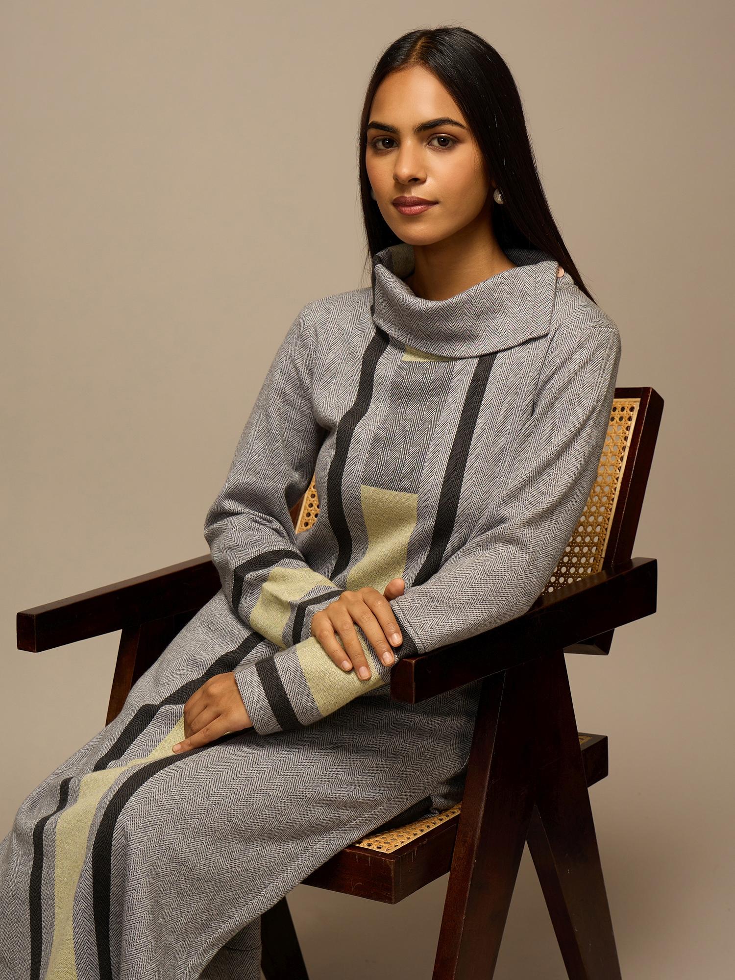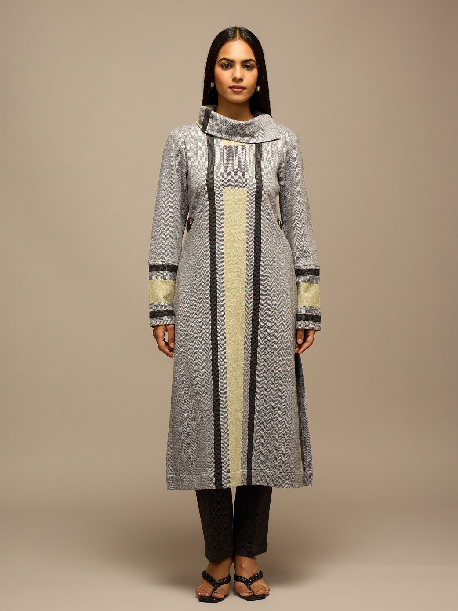 Upgrade your casual and office wardrobe with this charcoal knitted kurta set, designed for both comfort and effortless style. The draped high-neck collar and full sleeves lend a sophisticated yet relaxed appeal, while the sea green stripe on the front adds a modern, contemporary touch.