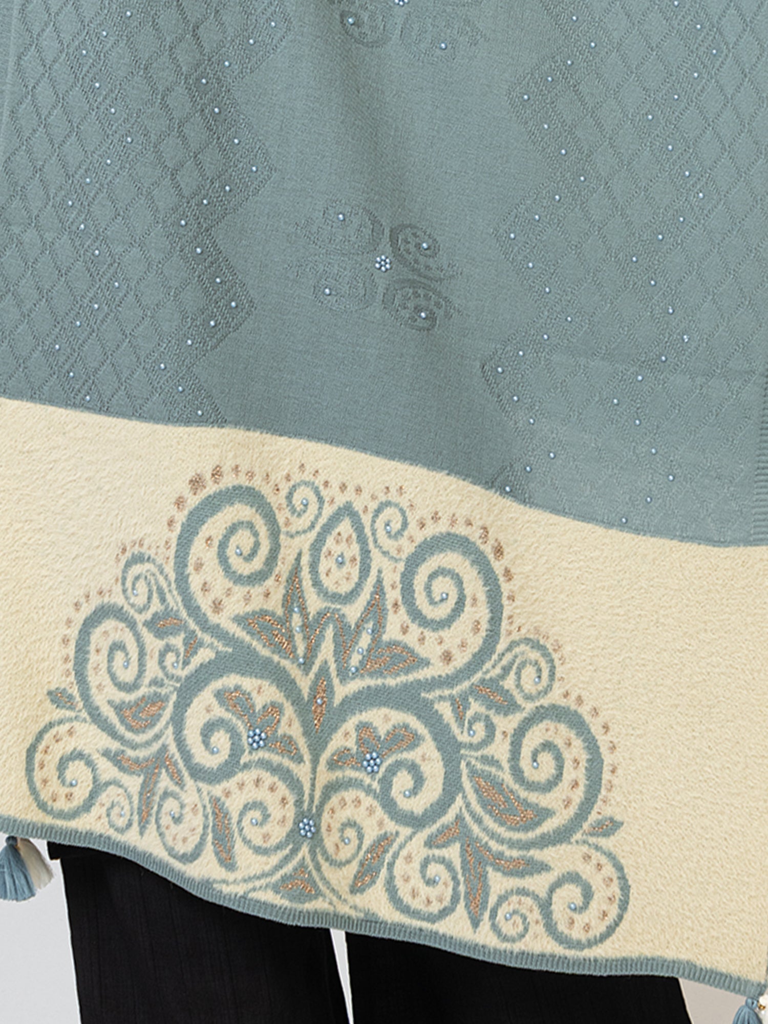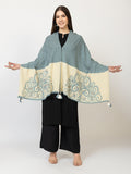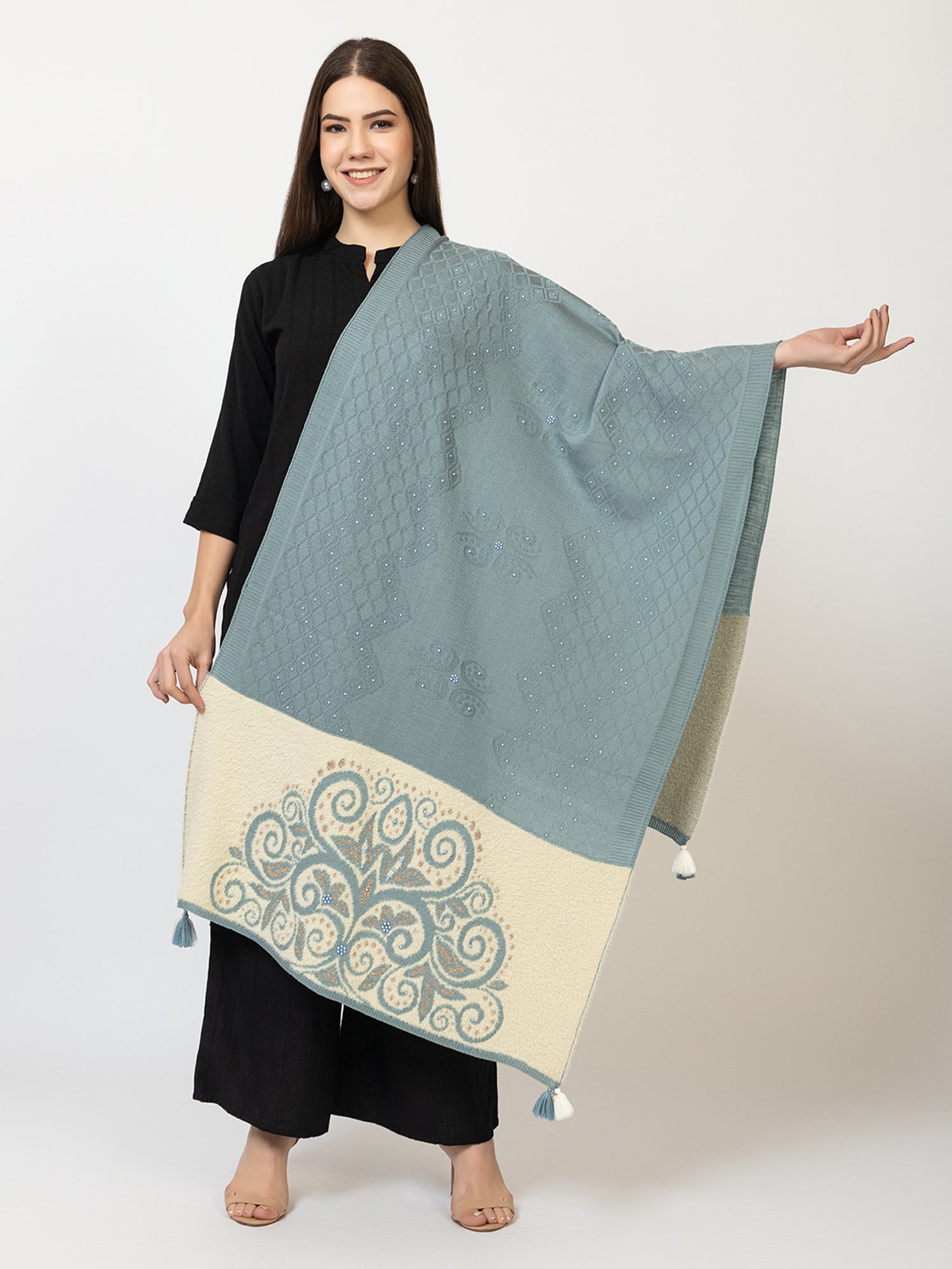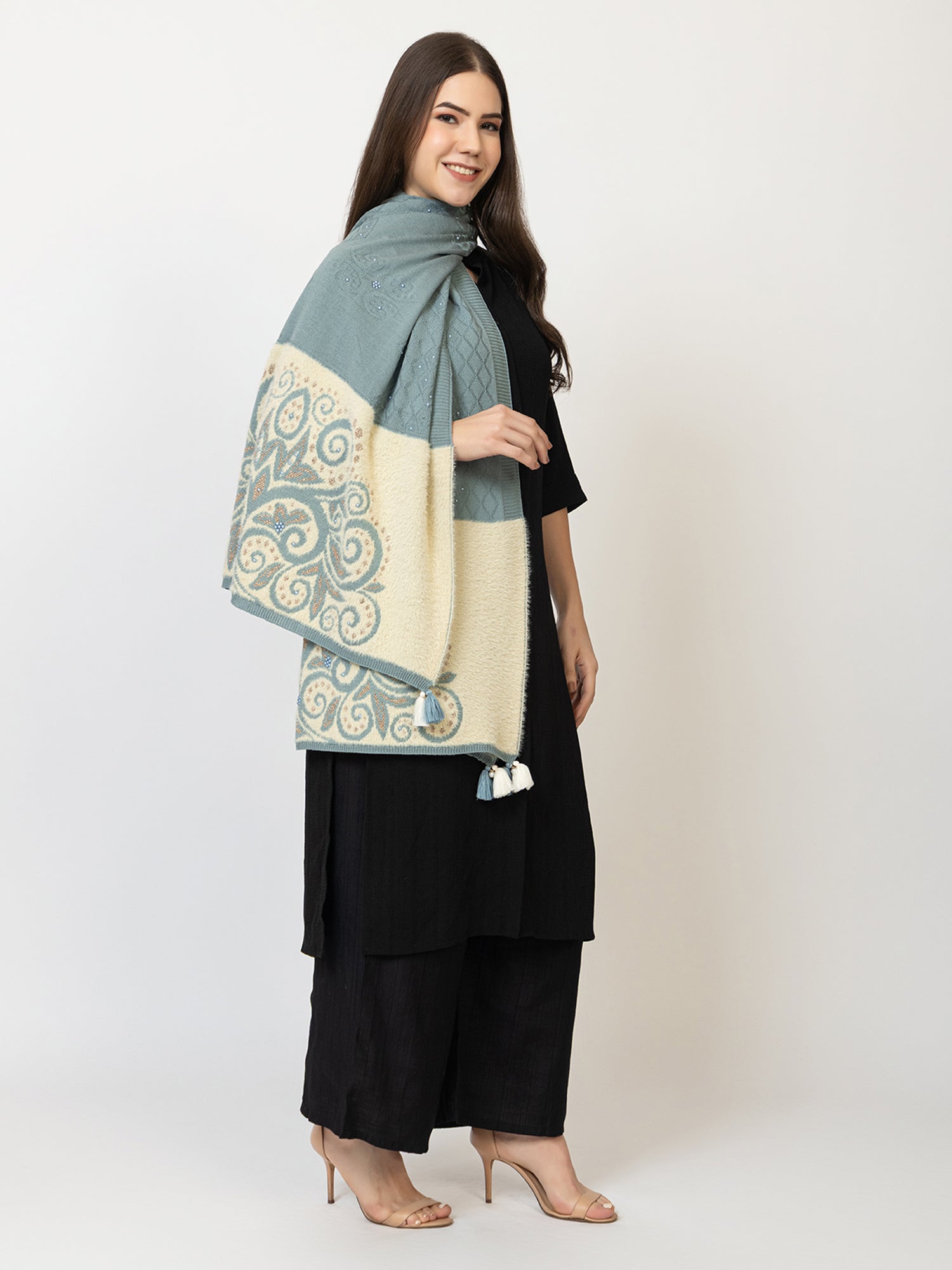 Wrap yourself in the soothing elegance of The Blue Ivory Woollen Embroidered Shawl, designed to keep you warm in style. The upper section features a textured blue knit with subtle detailing, while the lower ivory panel showcases intricate scrolling motifs inspired by classic Kashmiri artistry. Finished with soft tassels, this shawl pairs beautifully with both ethnic silhouettes and contemporary outfits.
