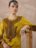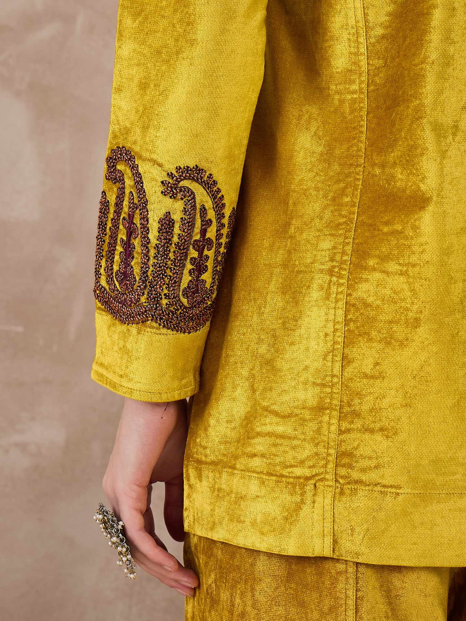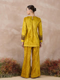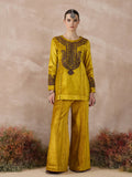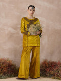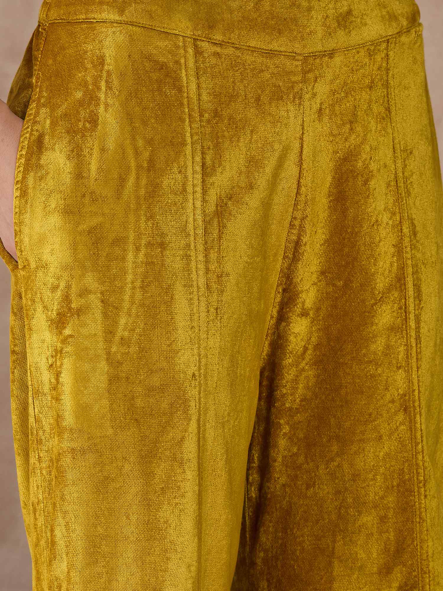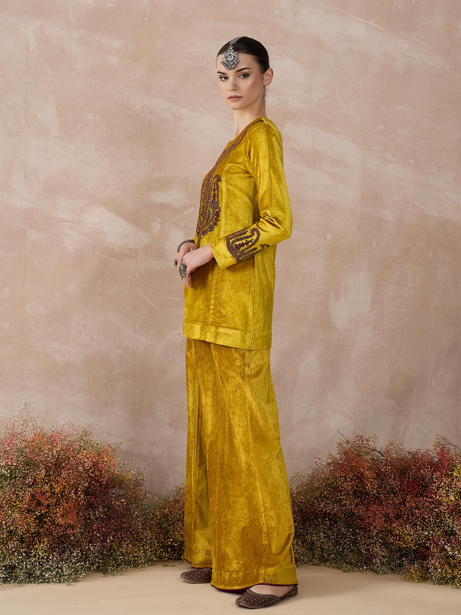 Turn heads this festive season with this yellow palazzo set crafted in luxurious viscose velvet. The kurta features a flattering V-neckline and full sleeves, accentuated with intricate dori and zari work for an elegant and festive touch. Designed for both style and comfort, the set includes matching palazzos that offer a relaxed yet refined silhouette. Perfect for parties and celebrations, this ensemble blends traditional craftsmanship with modern flair.