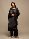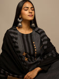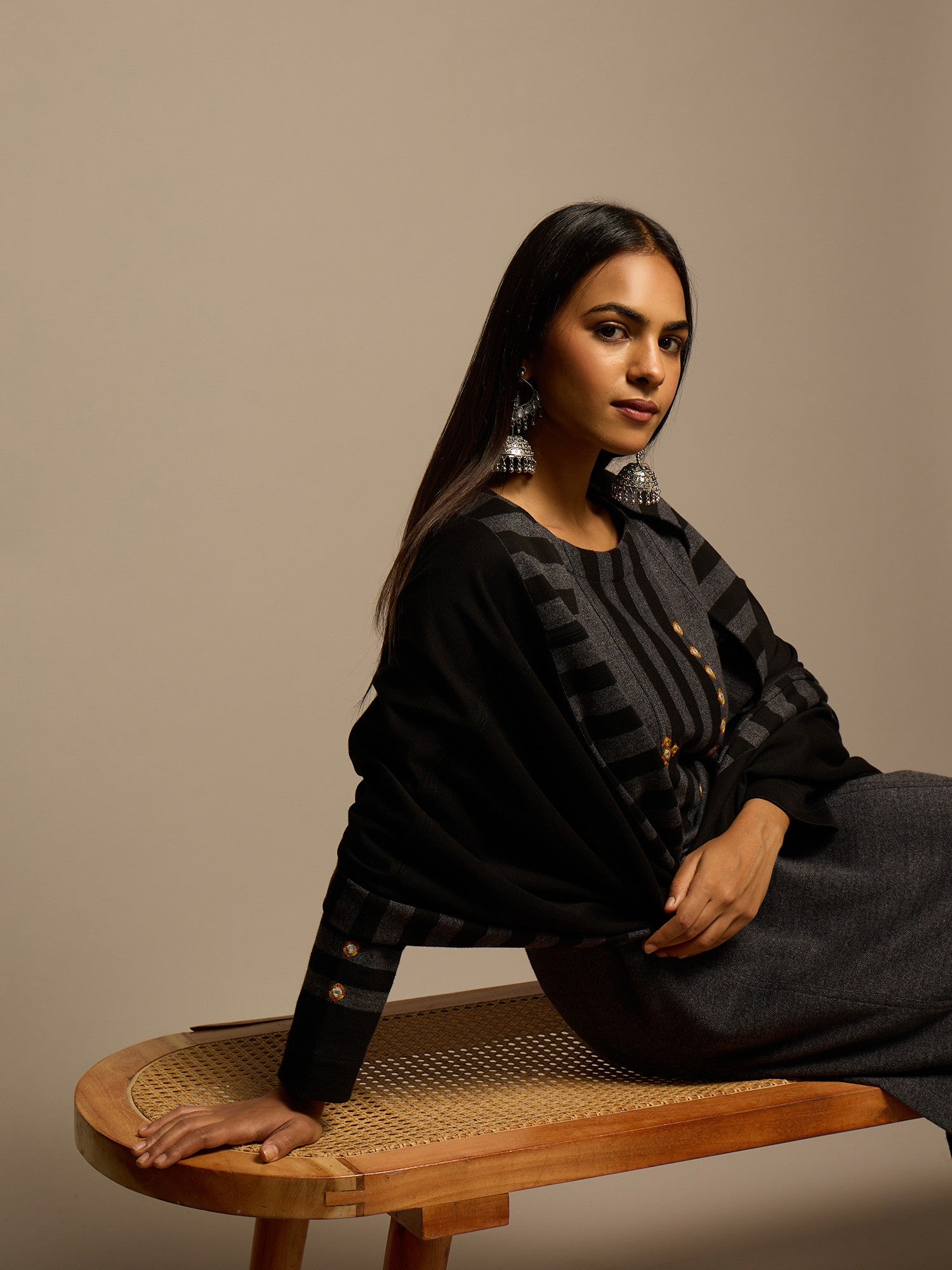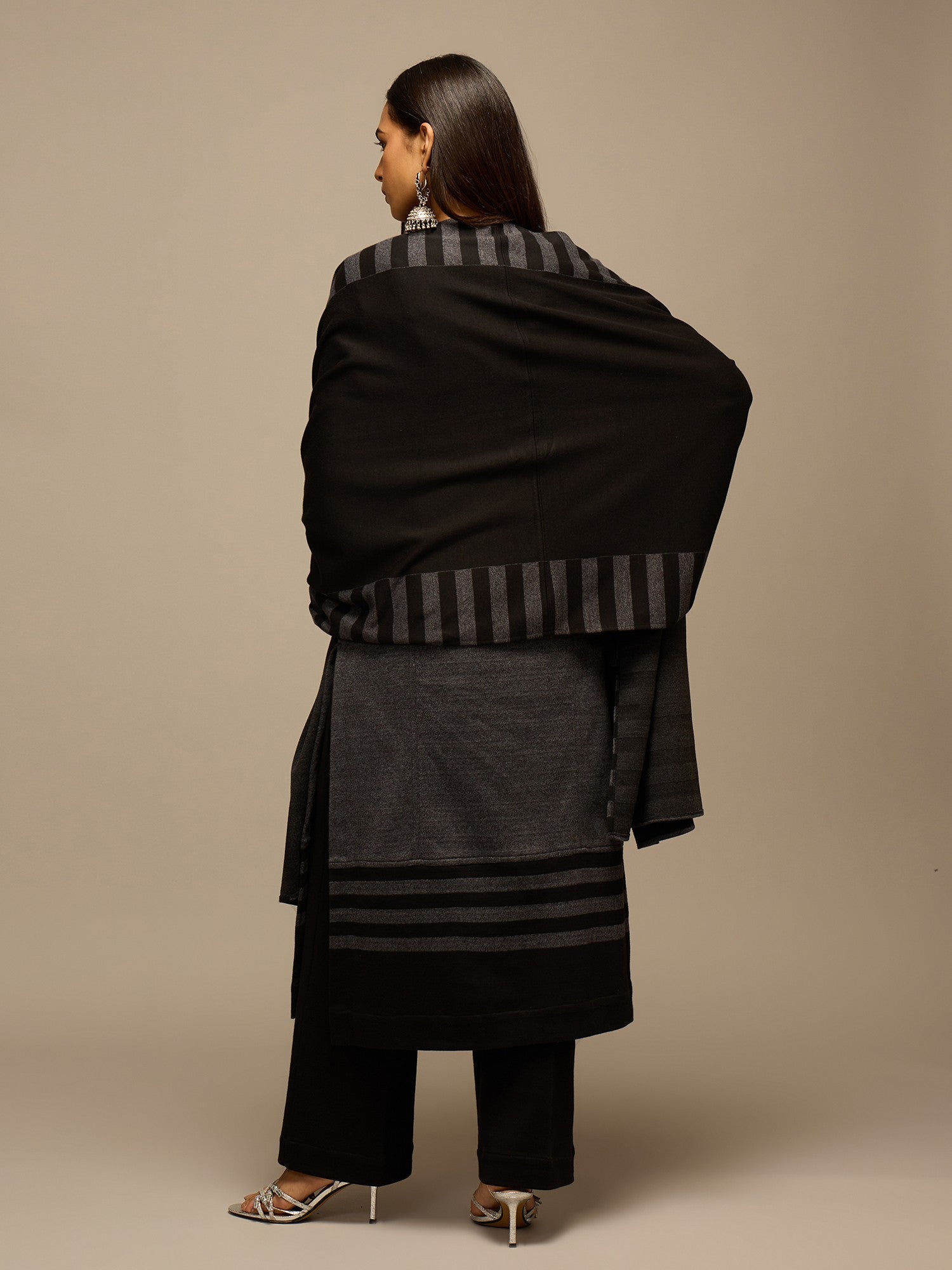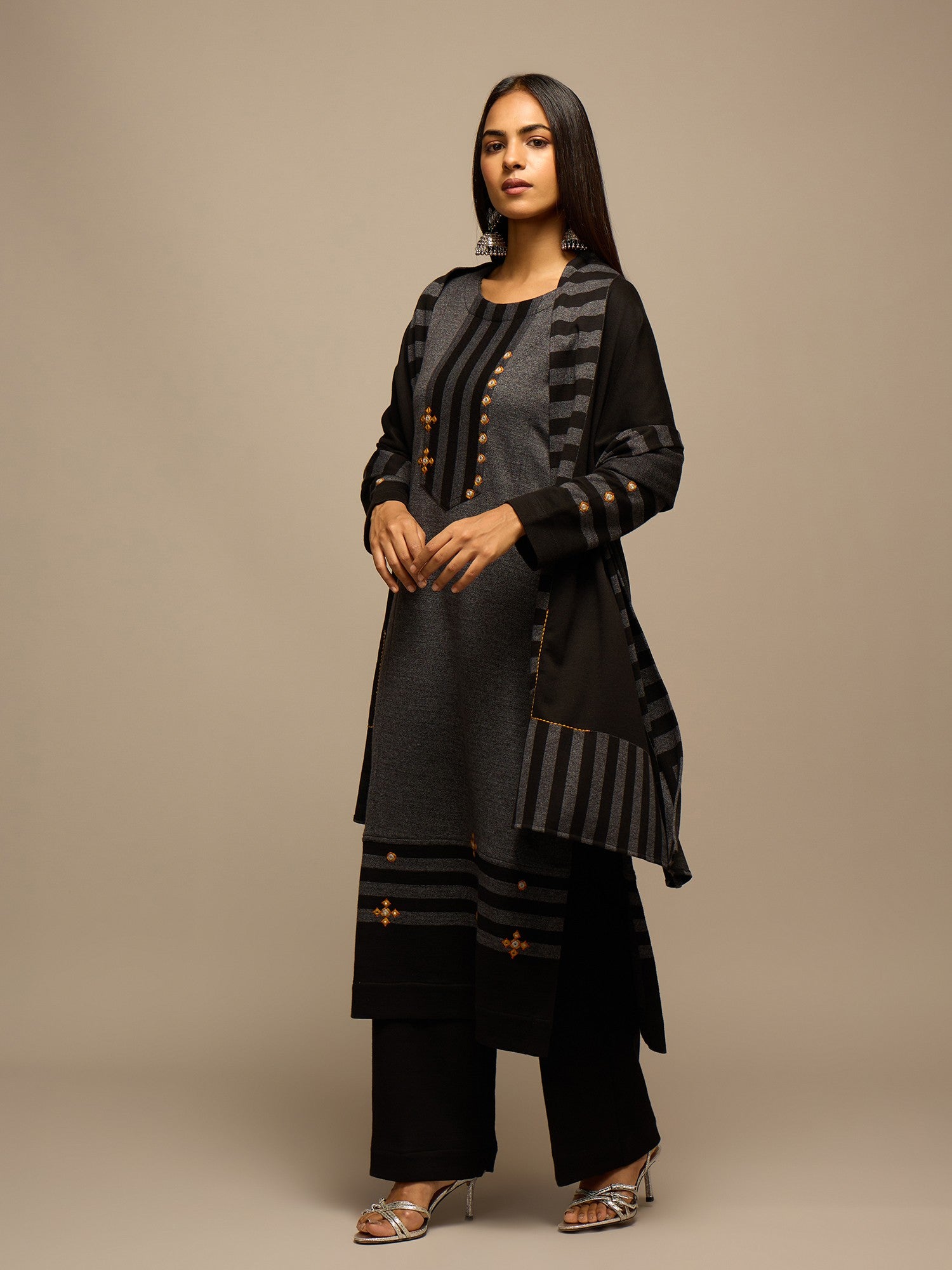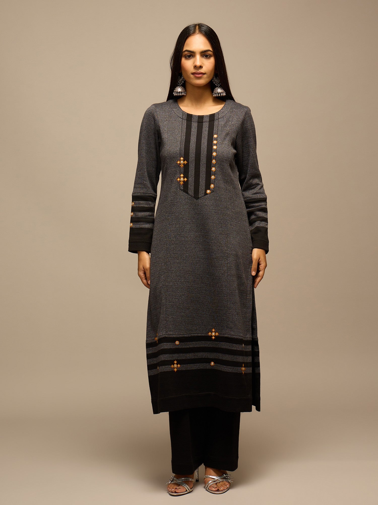 Step into subtle sophistication with this beautifully crafted knitted kurta set in a graceful grey hue, highlighted with black striped ghera for a touch of modern contrast. The round neckline is delicately adorned with mirror work detailing, adding just the right amount of shimmer, while similar accents at the hem bring an artisanal charm to the ensemble.