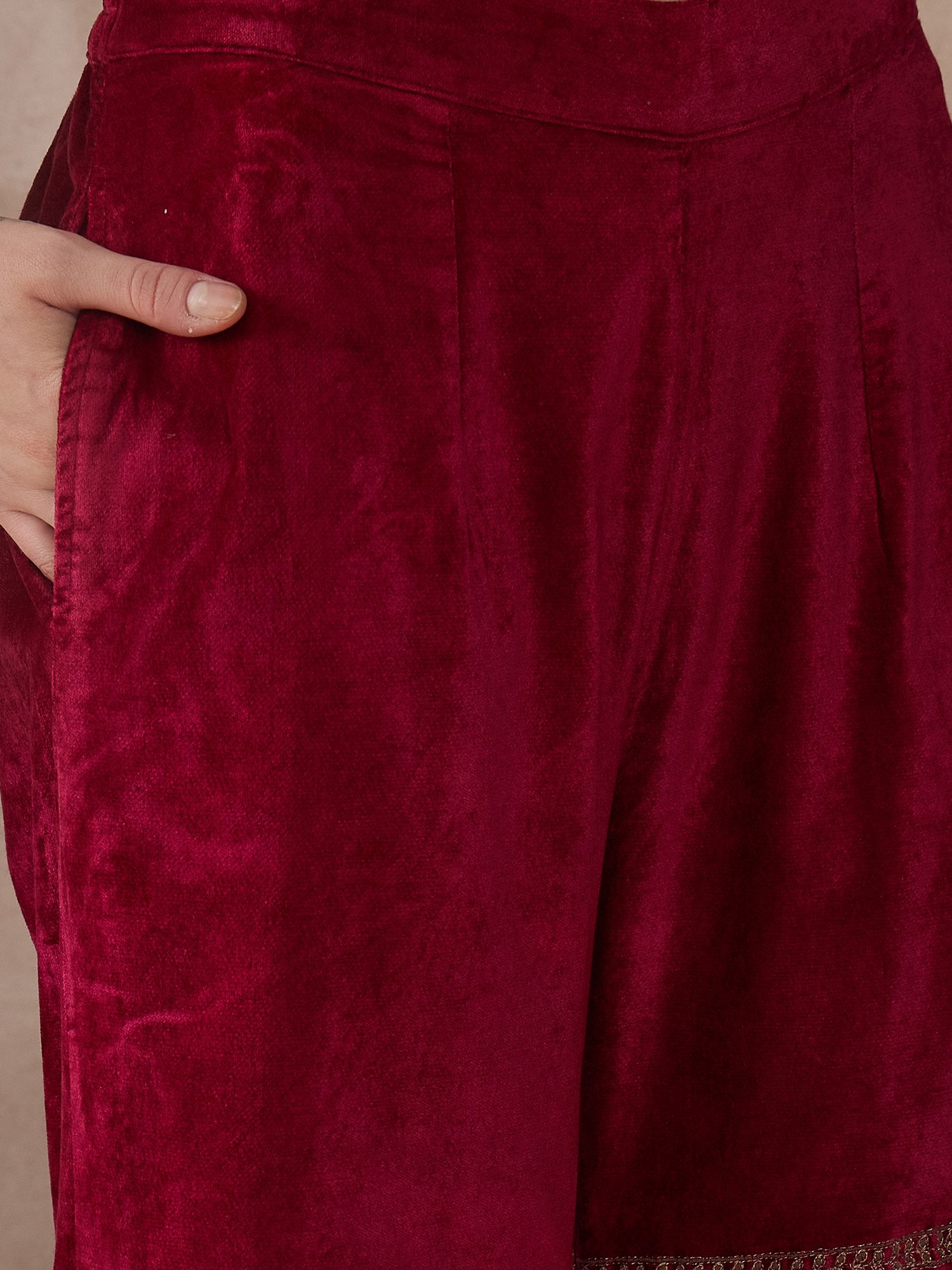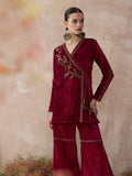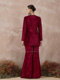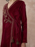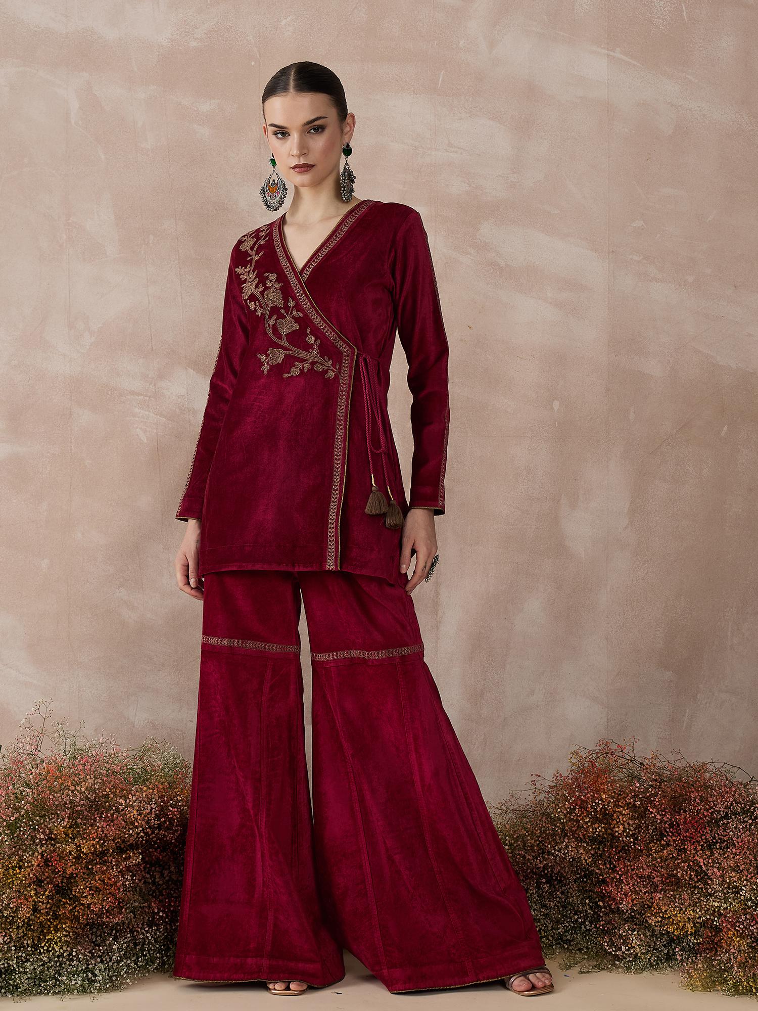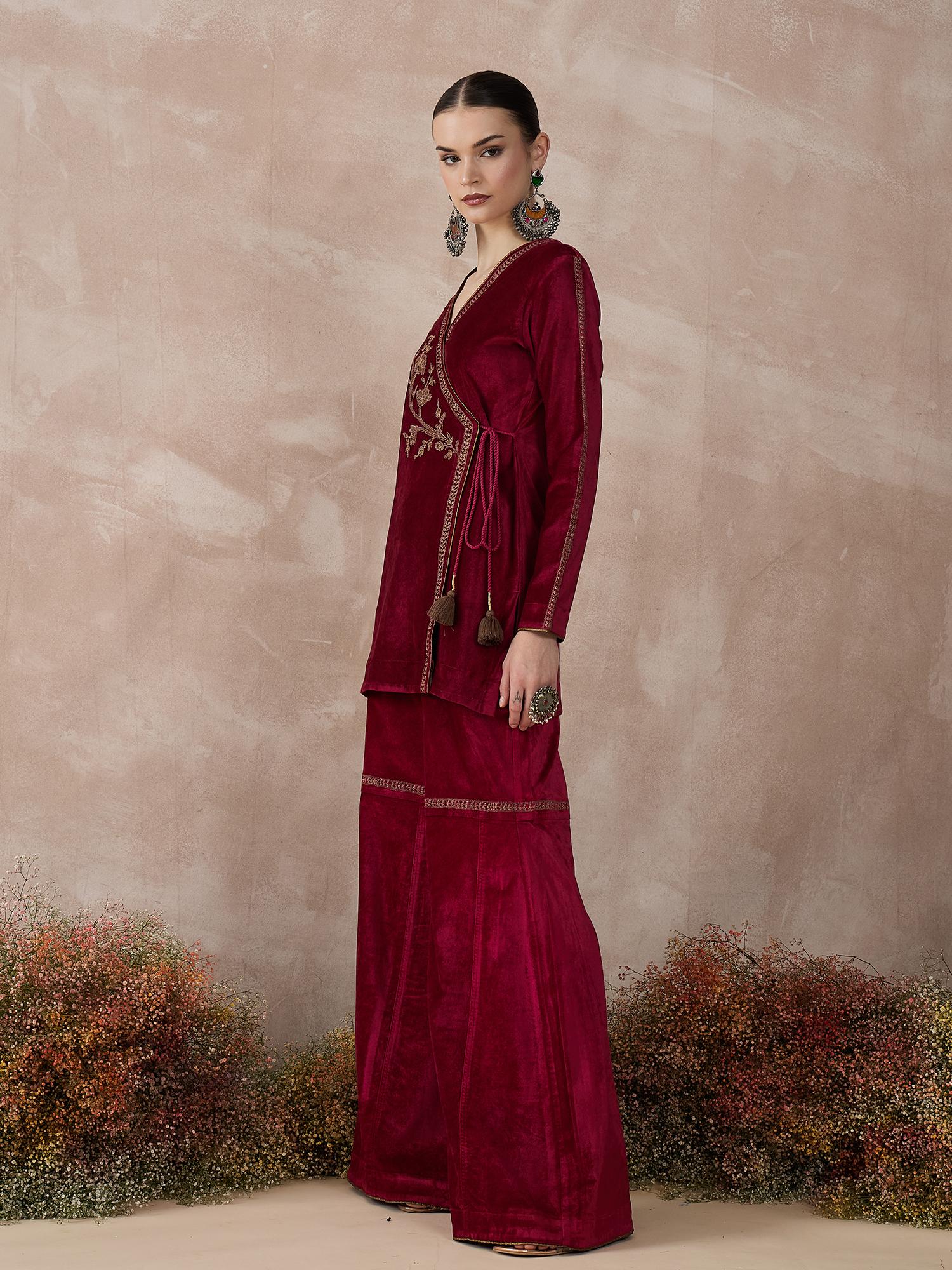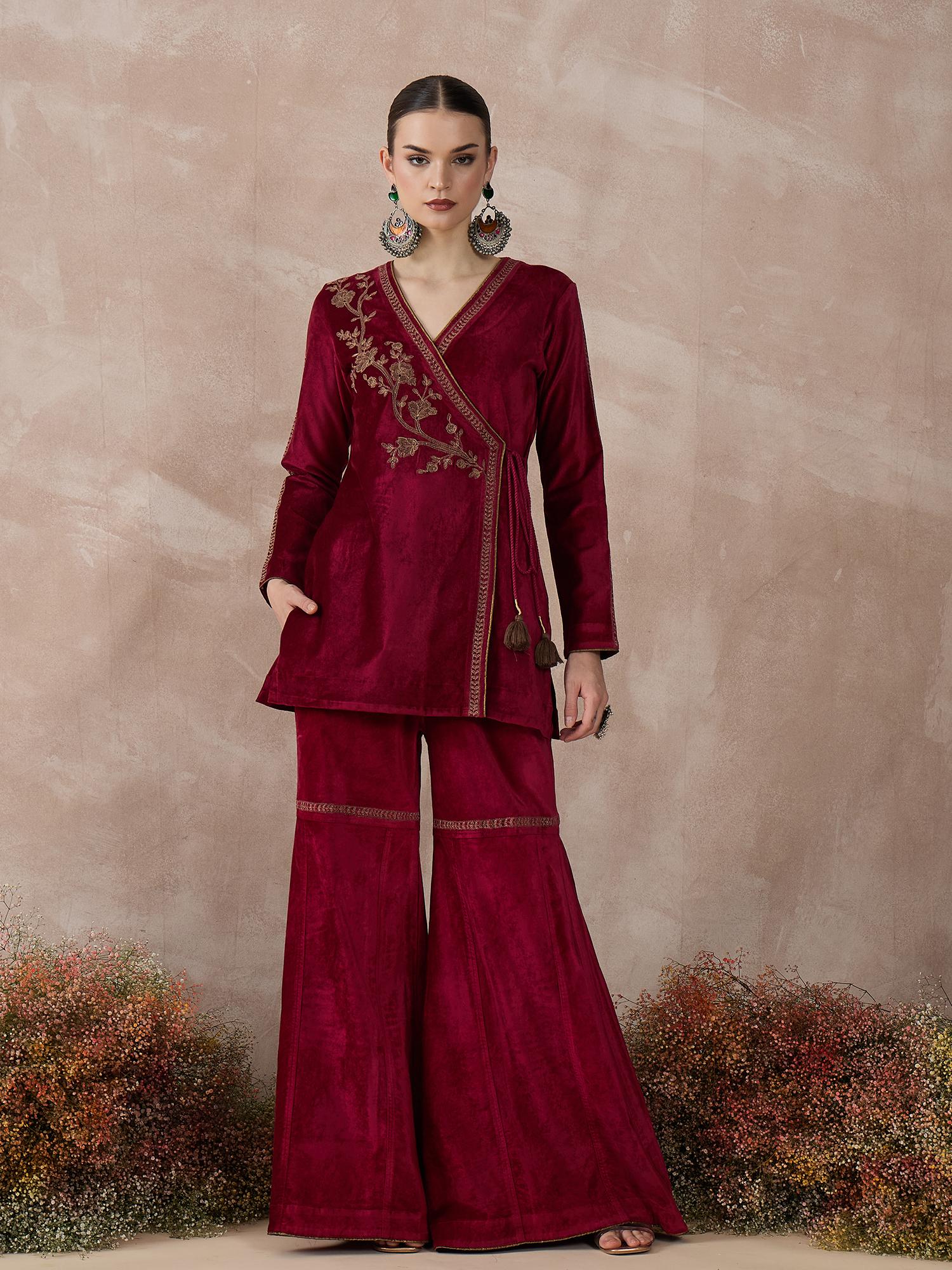 Turn heads this festive season with this exquisite dark pink sharara set, crafted from luxurious viscose velvet for a rich and elegant appeal. The Angarakha-style kurta features delicate dori and tassel detailing, blending traditional charm with modern aesthetics. A V-neckline is adorned with intricate jaal embroidery, complemented by detailed embroidery on the hems, sleeves, and sharara, highlighting artisanal craftsmanship.