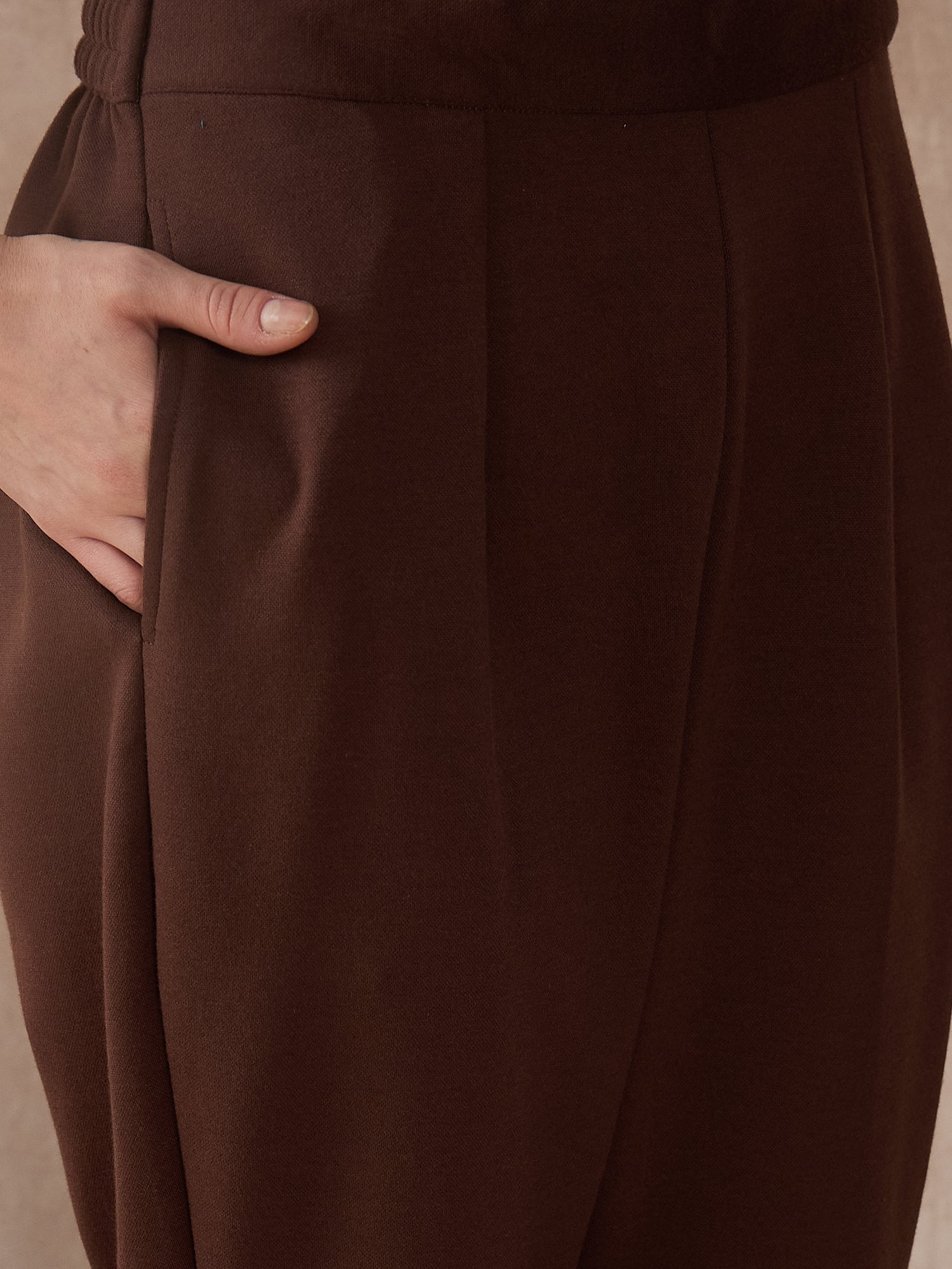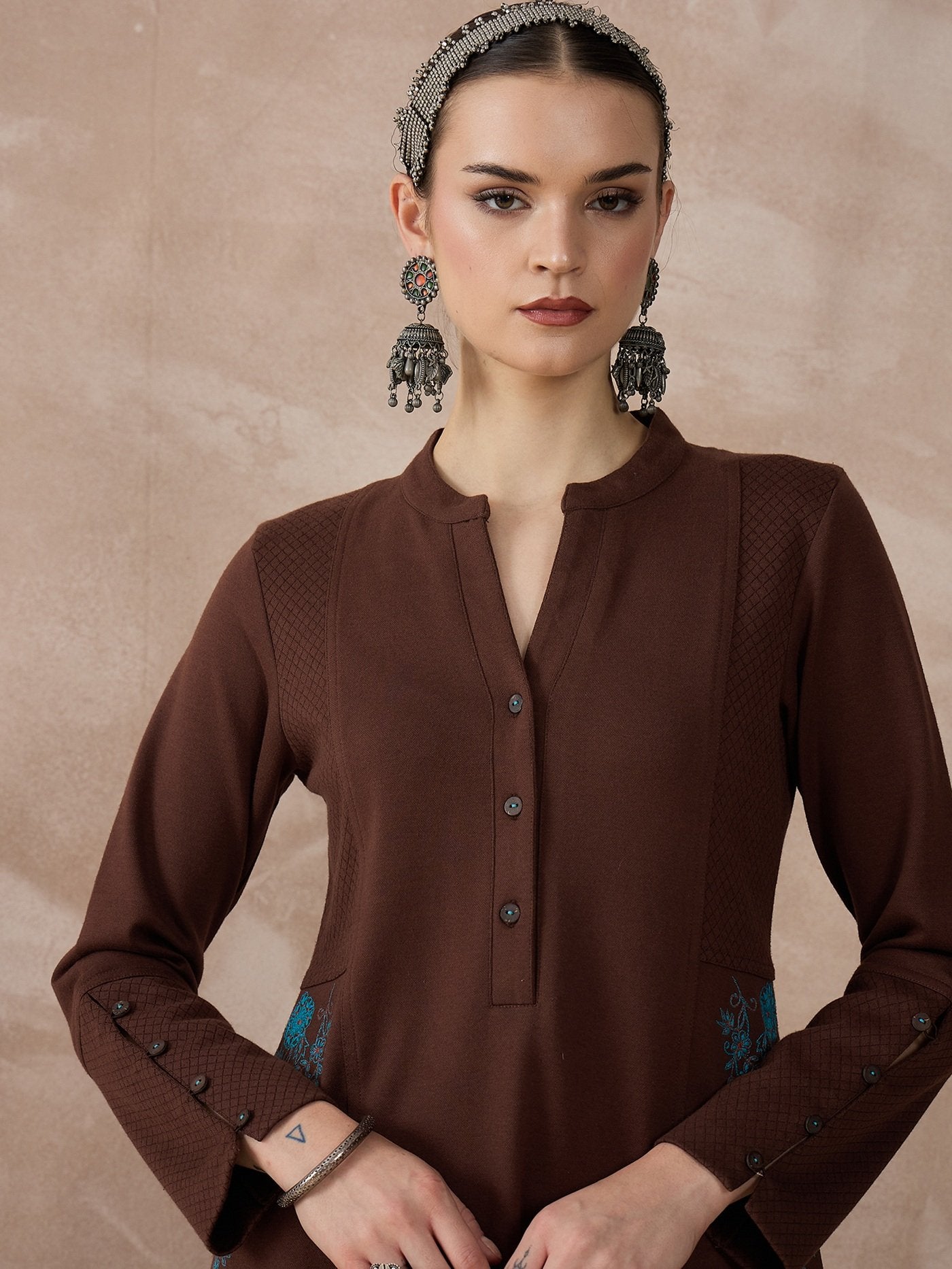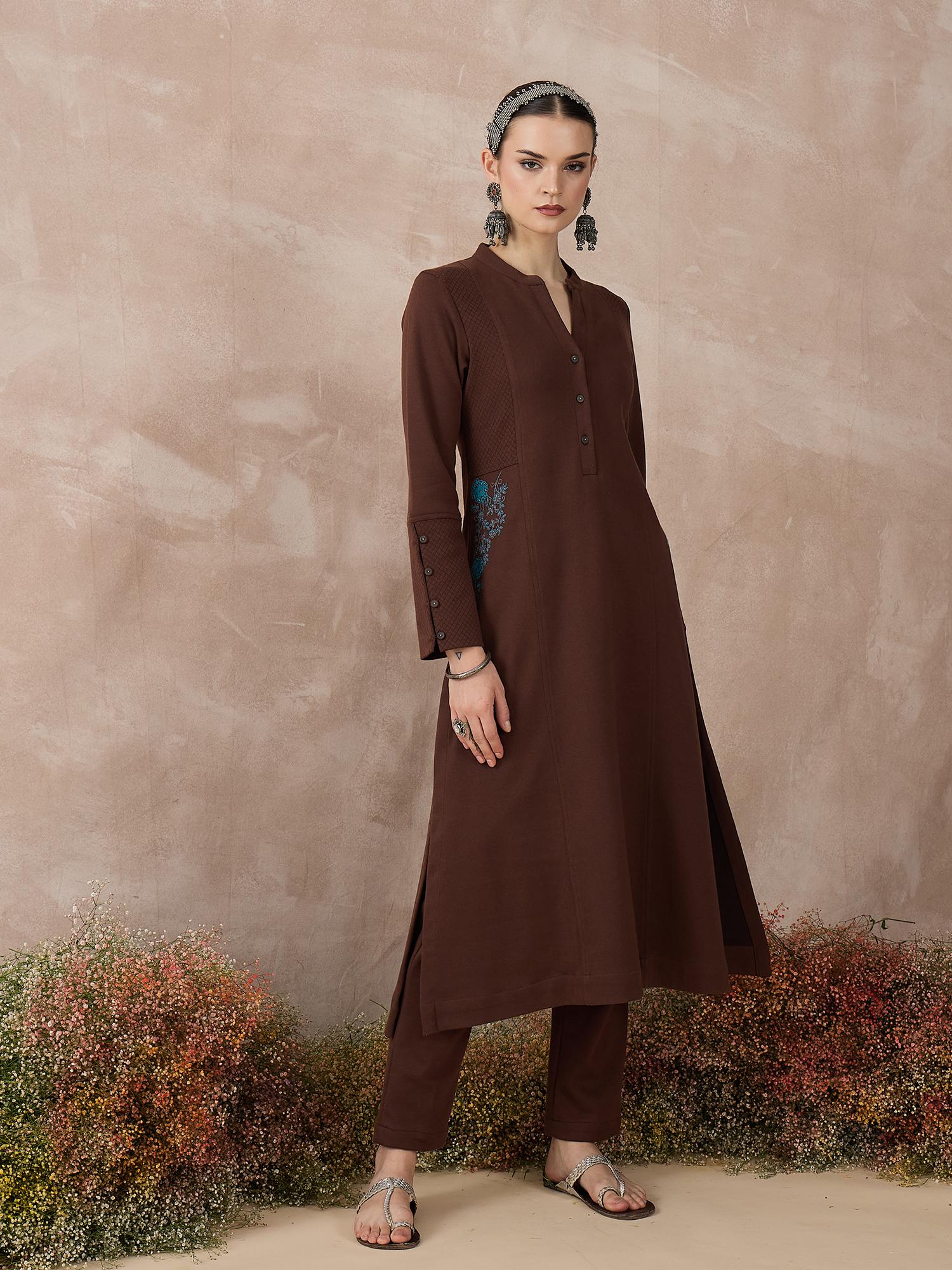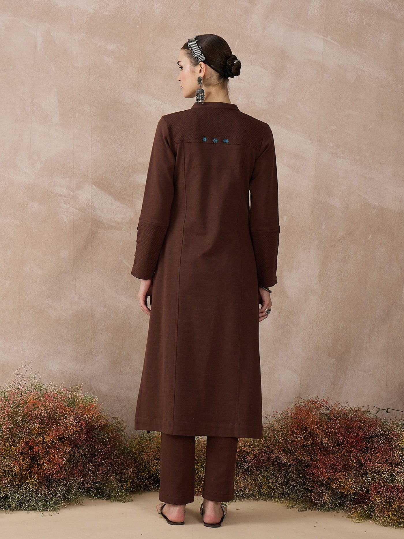 Embrace timeless sophistication with this earthy brown A-line kurta set, crafted from soft knitted cotton for all-day comfort. The kurta features a refined ban neckline with a subtle V-cut, lending a touch of modern grace. Delicate contrast embroidery near the waistline enhances its chic appeal, while the regular fit ensures effortless ease and movement.