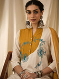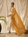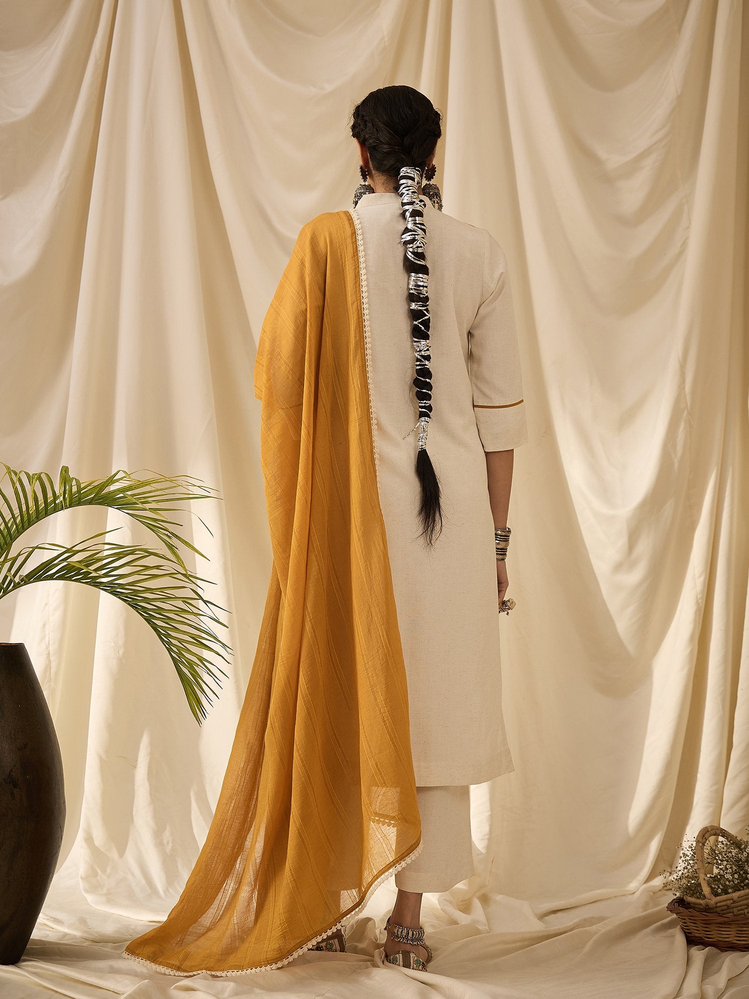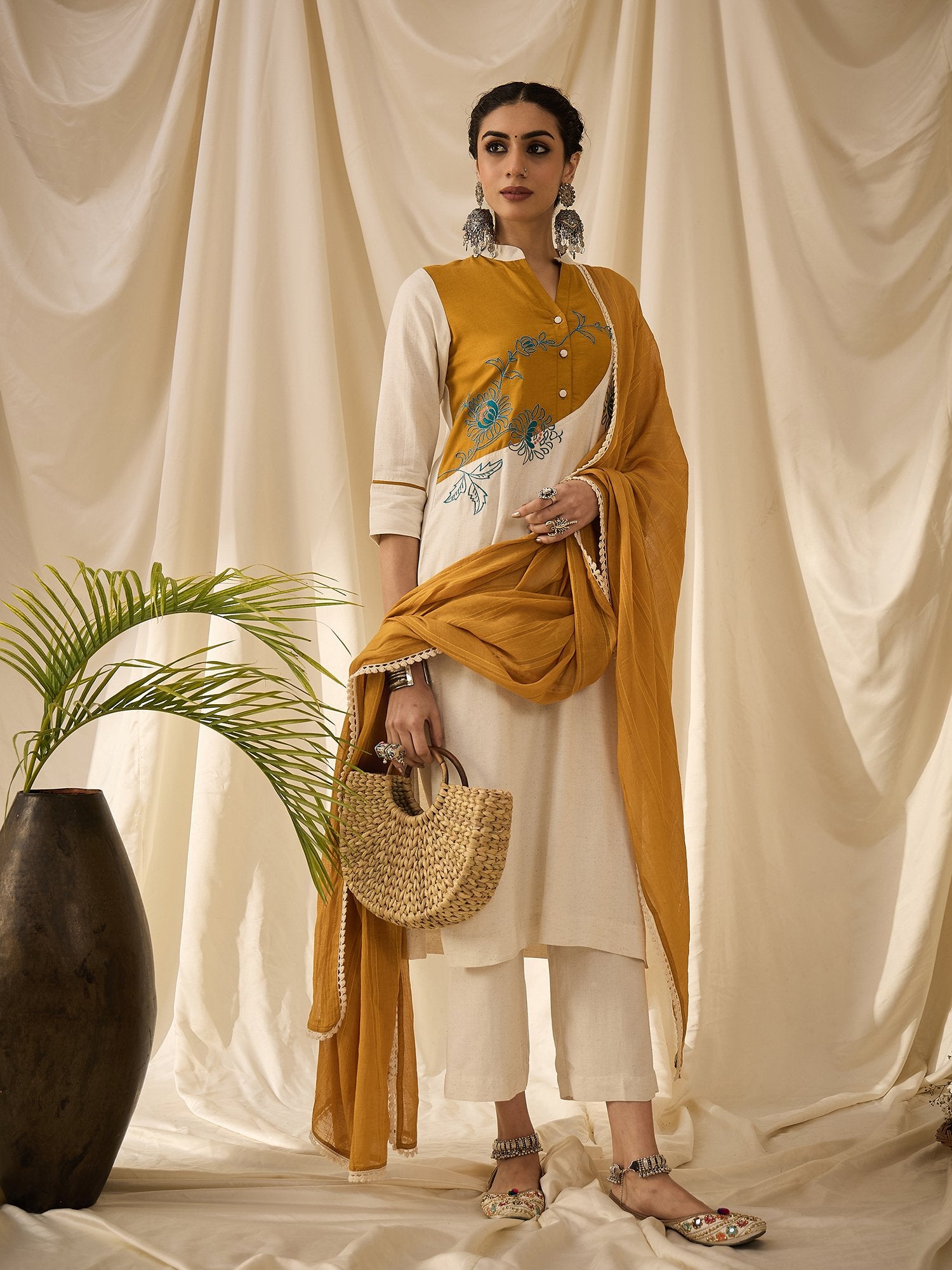 This cotton doria kurta set features a contrast dupatta and straight pants, complemented by a front contrast yoke with intricate embroidery. The soothing design ensures comfort, while the delicate detailing adds an elegant touch, making it perfect for both casual and semi-formal occasions.