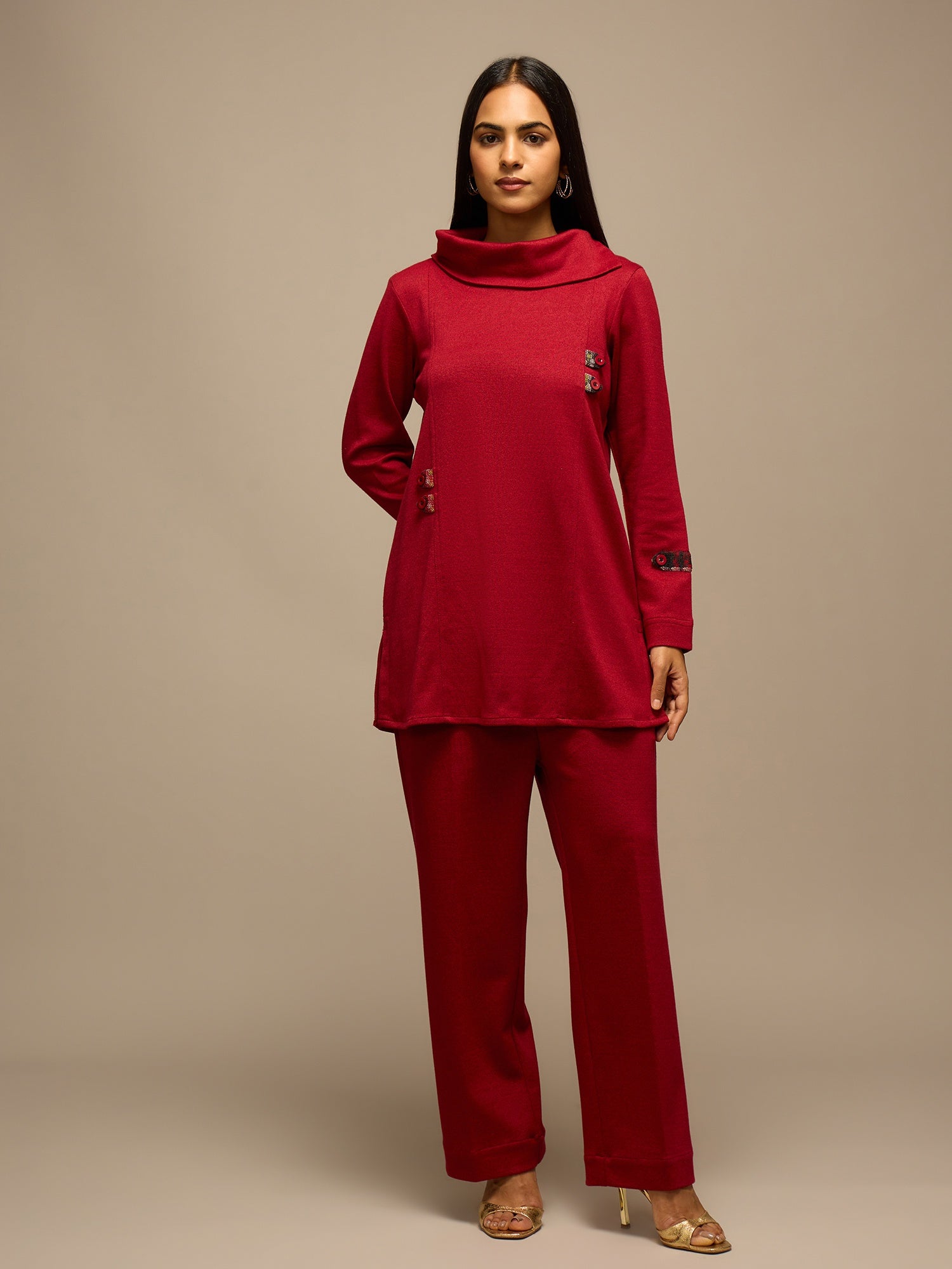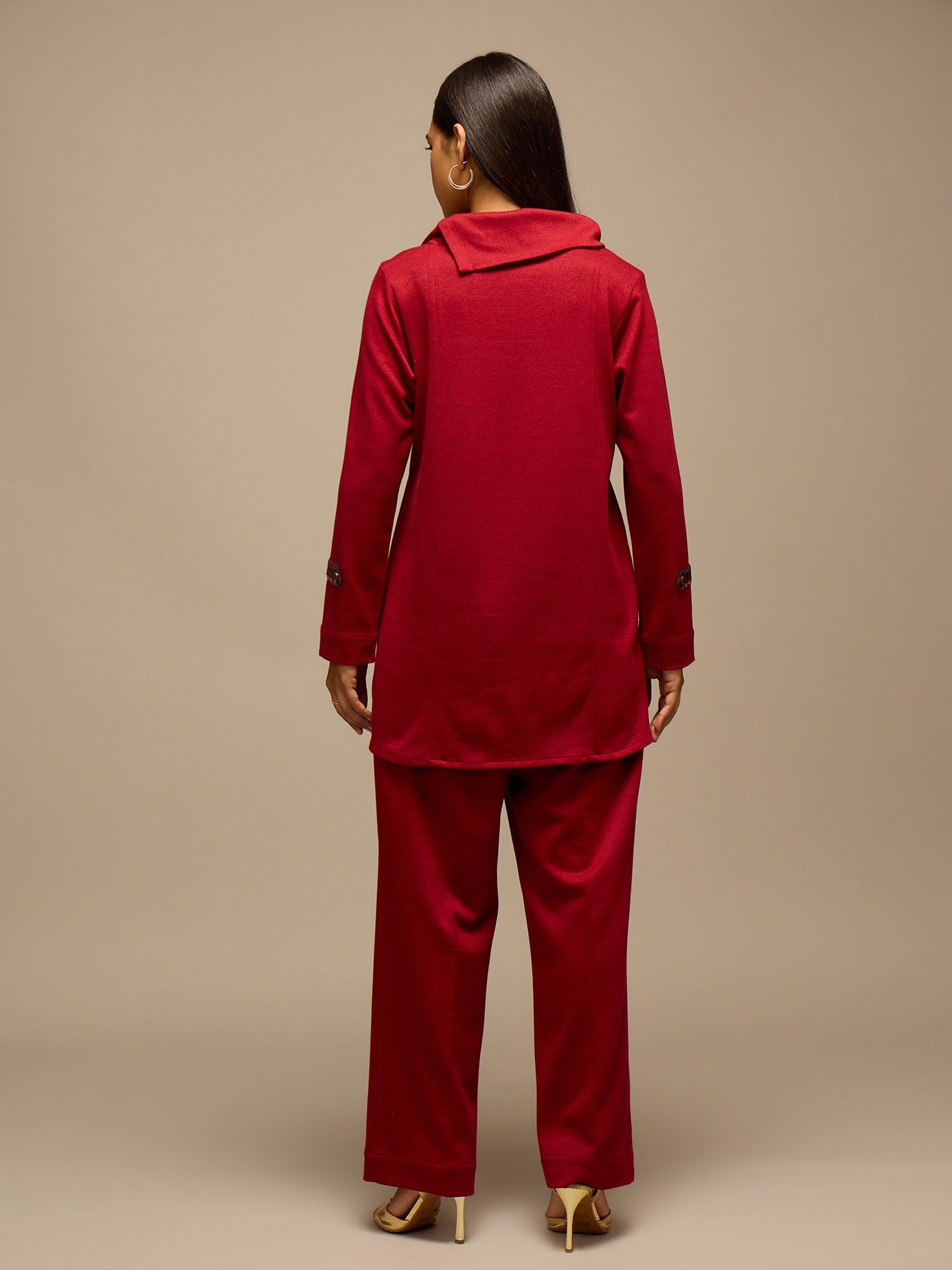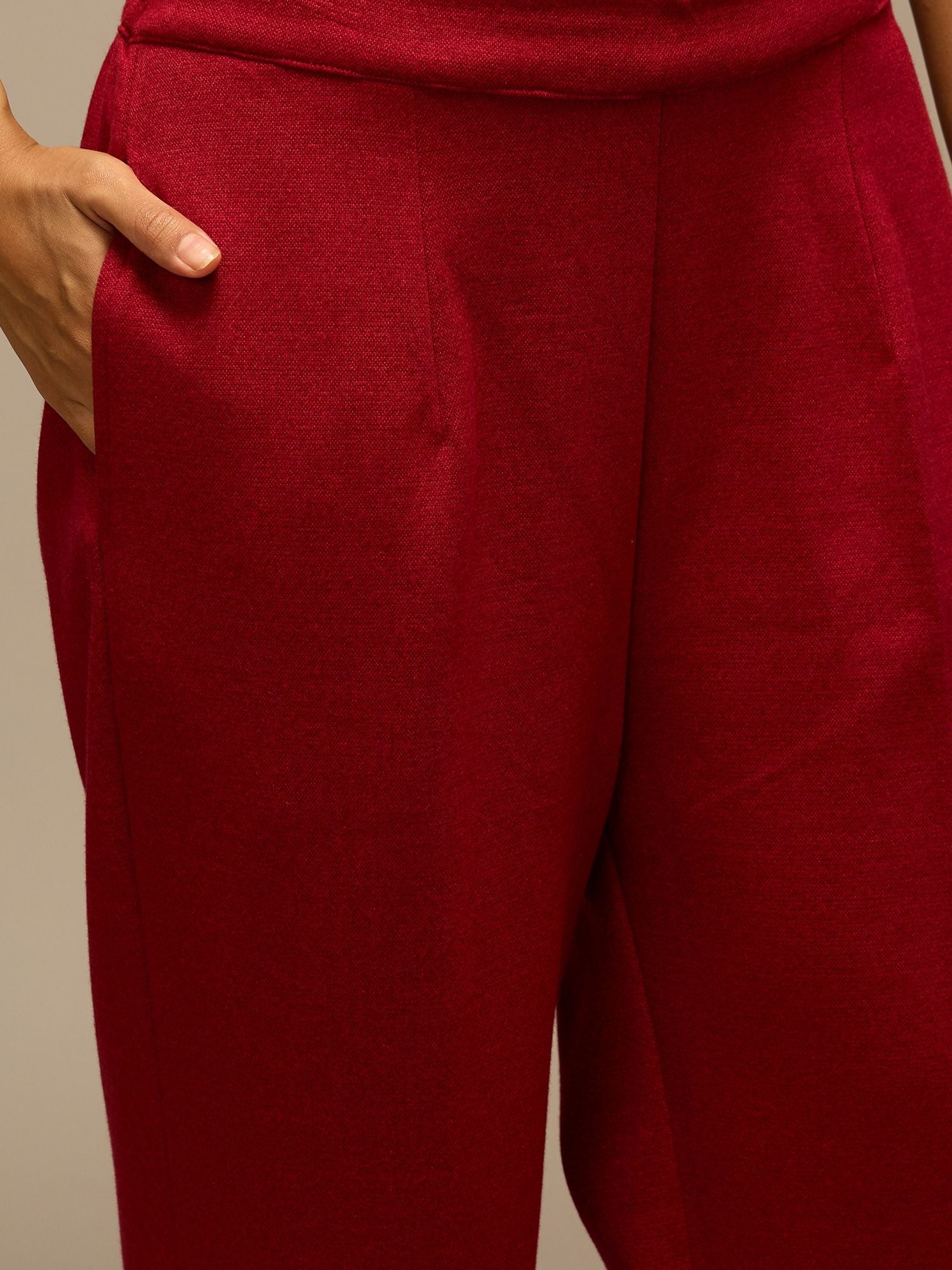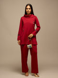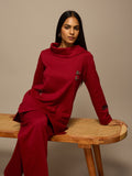 Step into smart elegance with this red knitted co-ord set, designed for comfort and style. Crafted from high-quality knitted cotton, the regular-fit ensemble features a high neck top with full sleeves, accentuated by subtle tweed detailing for a refined, sophisticated look.