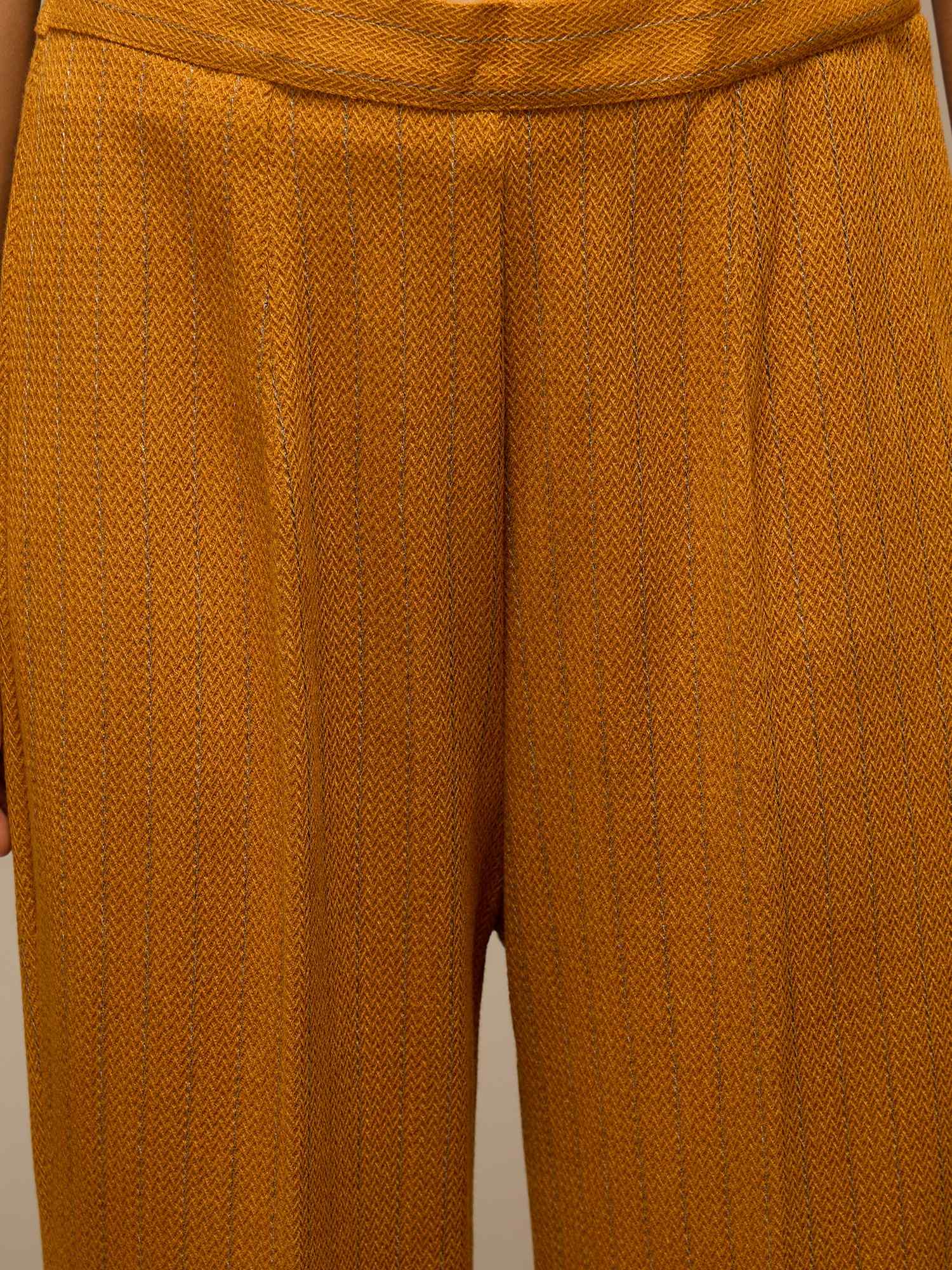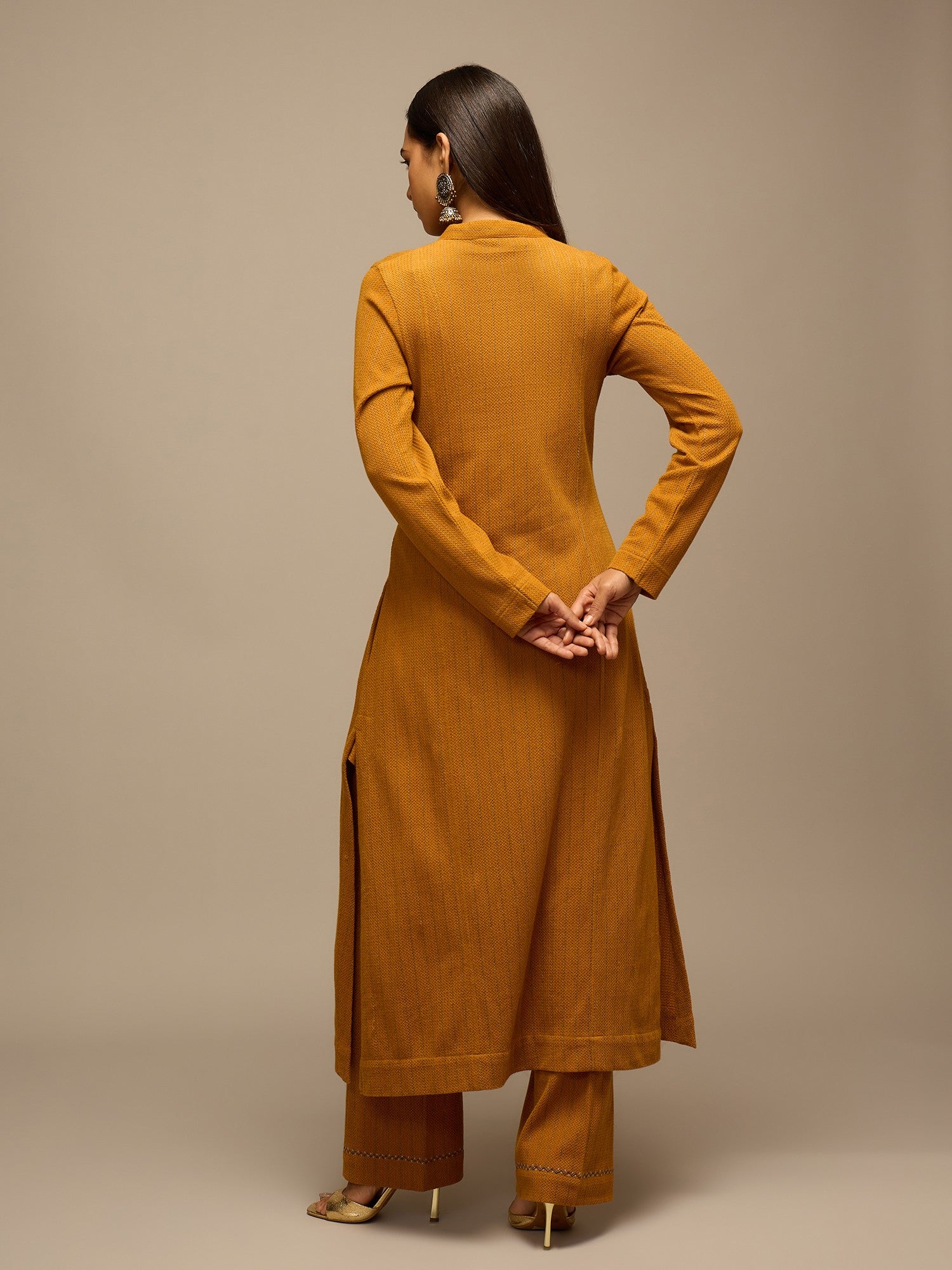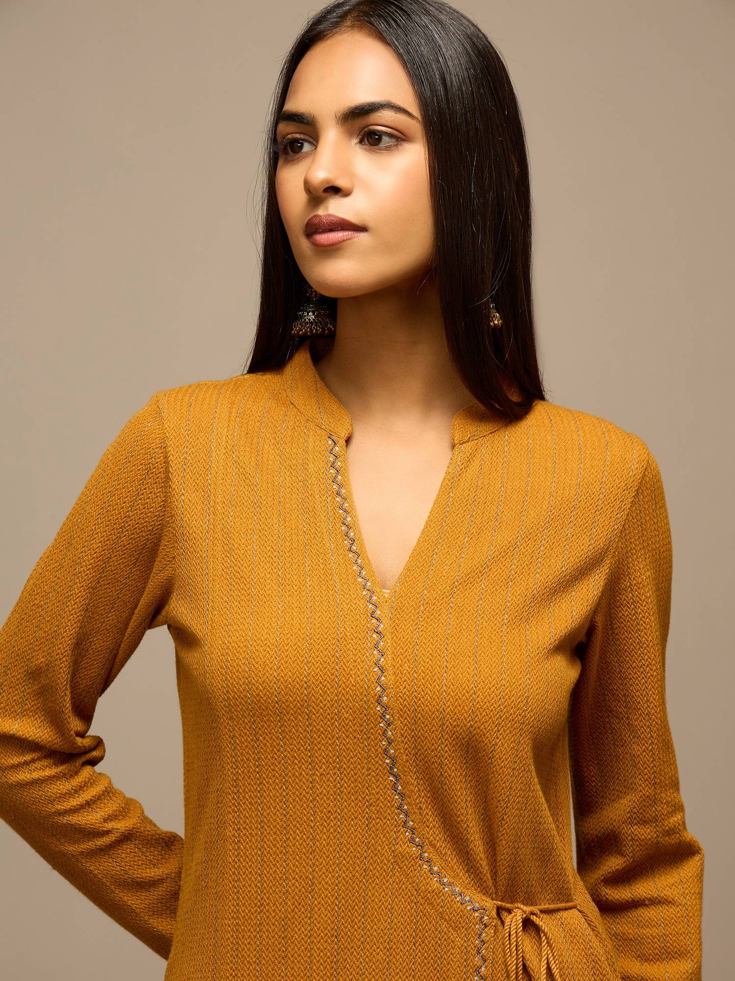 Elevate your everyday style with this elegant mustard kurta set, crafted from a soft, breathable fabric with subtle woven texture. The kurta features a refined V-neck with a mandarin collar and an asymmetric wrap-style front, highlighted by delicate thread work and tassel tie-up detailing on the side. Designed for effortless comfort, it comes with full sleeves, side pockets, and a straight relaxed silhouette that flatters all body types.
