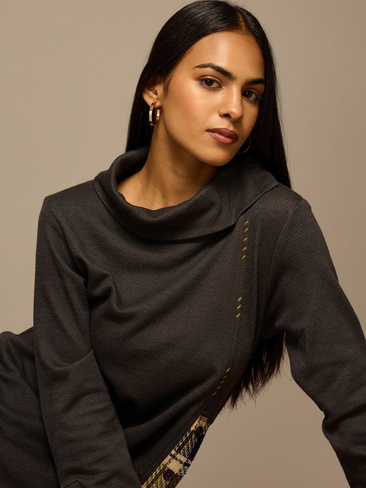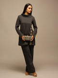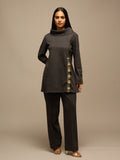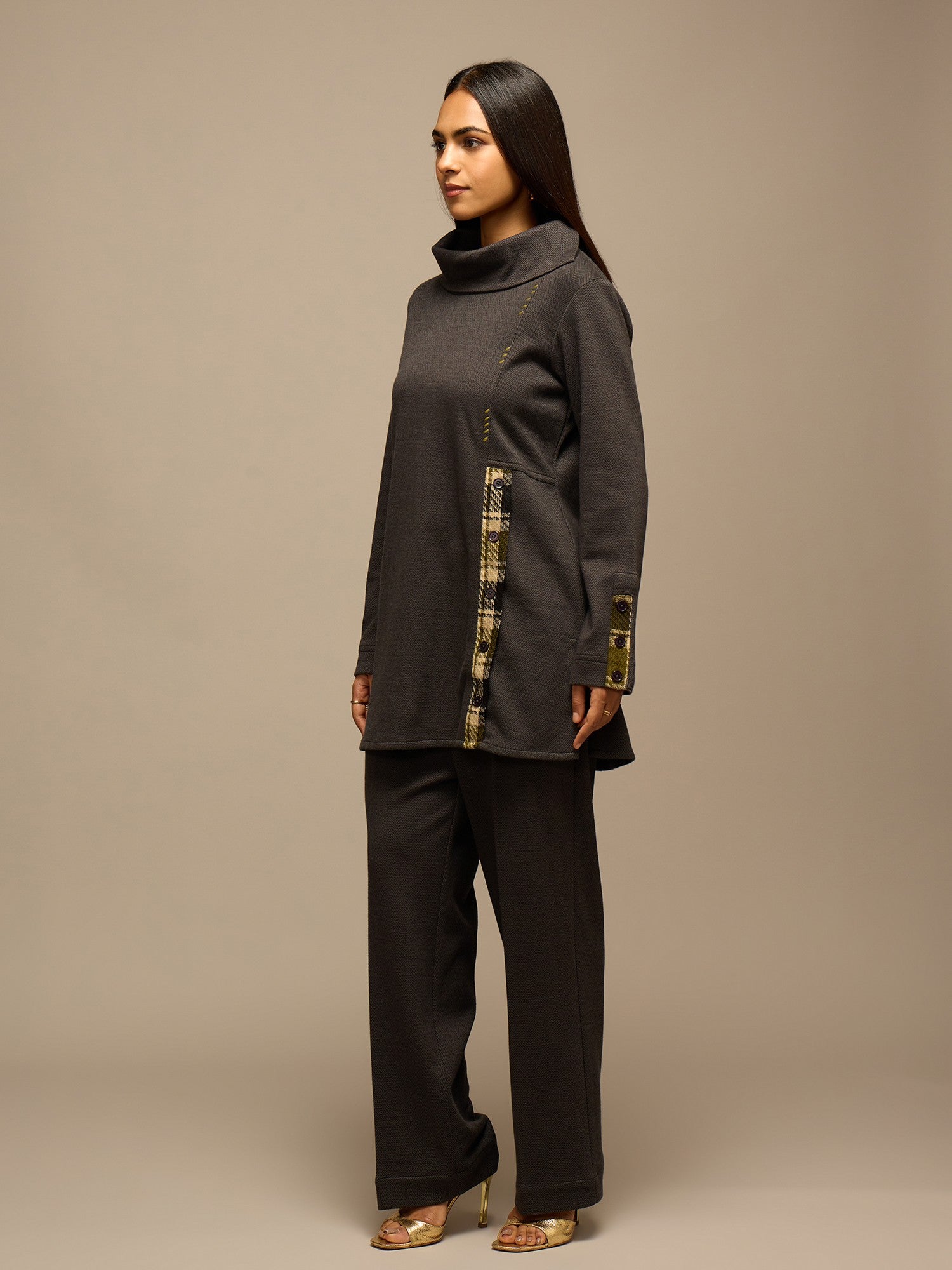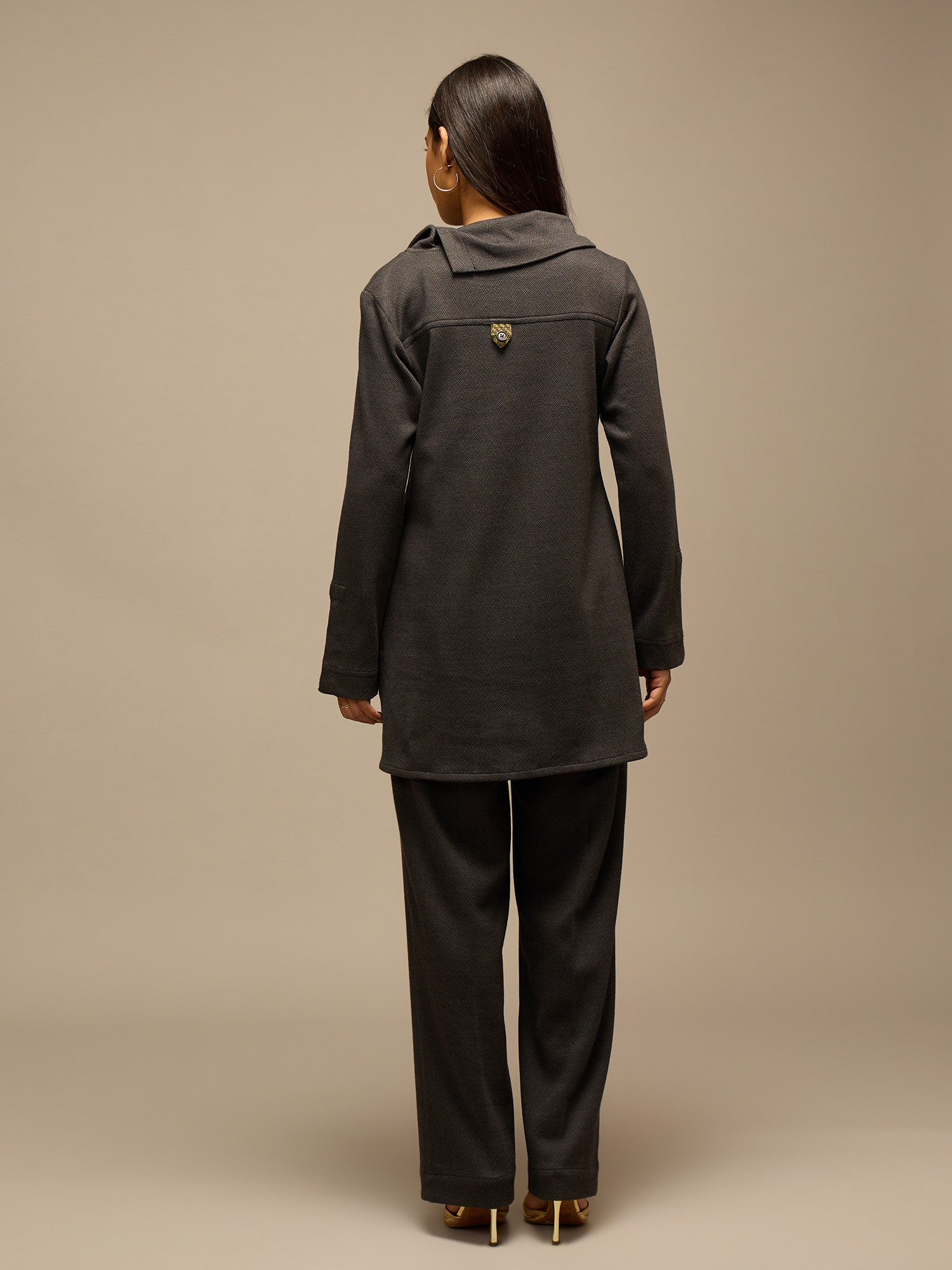 Upgrade your casual wardrobe with this chic grey knitted co-ord set, designed for effortless style and comfort. The draped high-neck collar and full sleeves add a refined touch, while the tweed-style top with subtle embroidery hints elevates its charm.