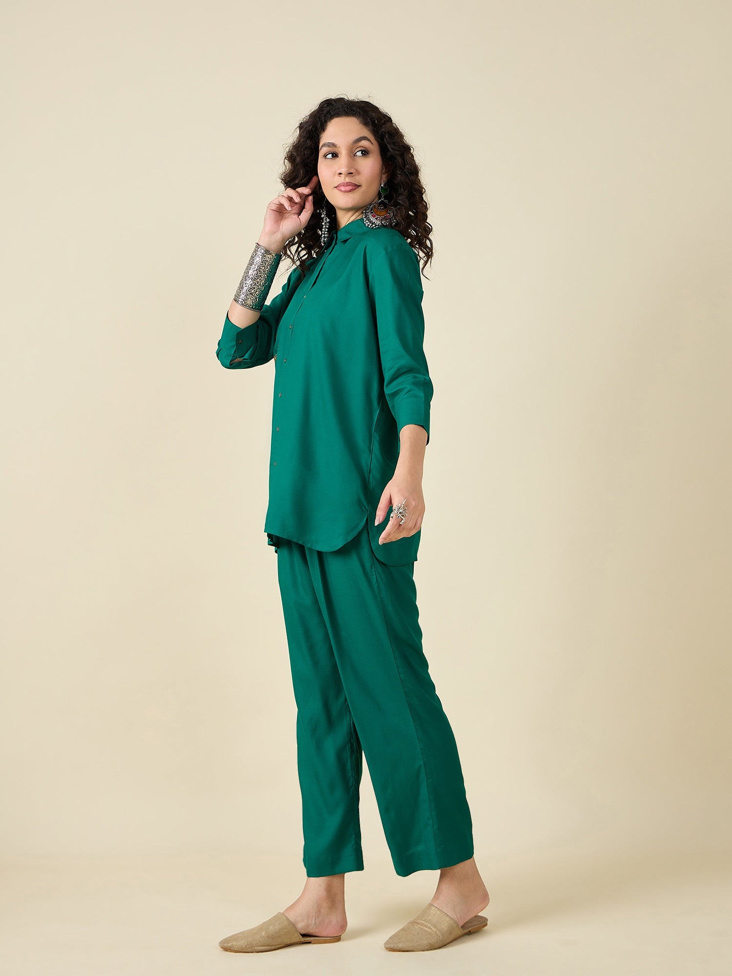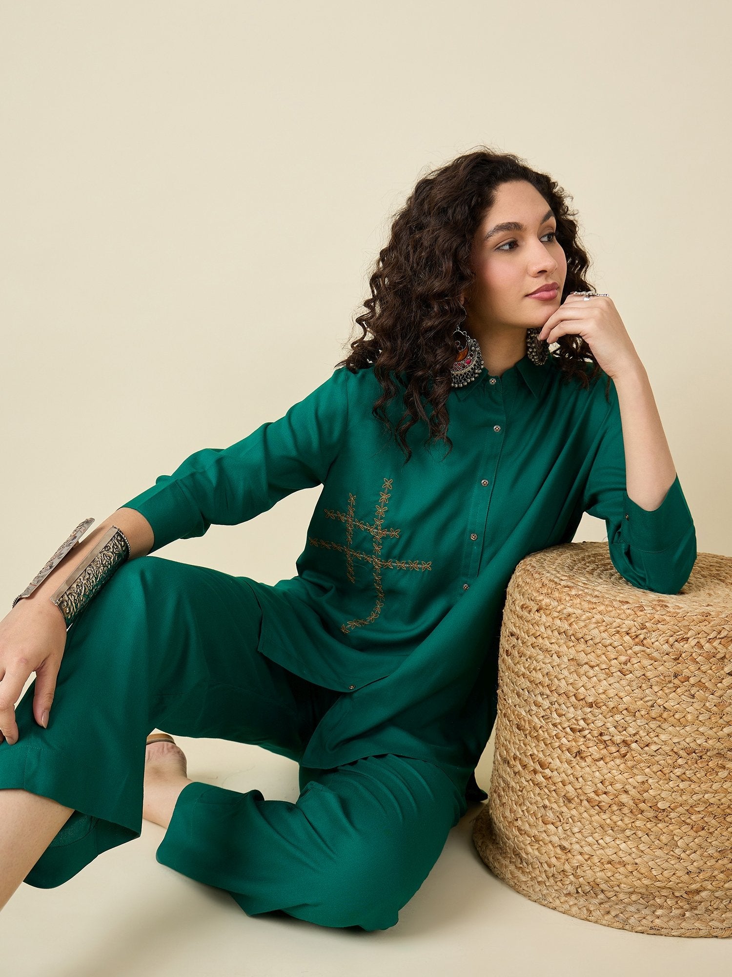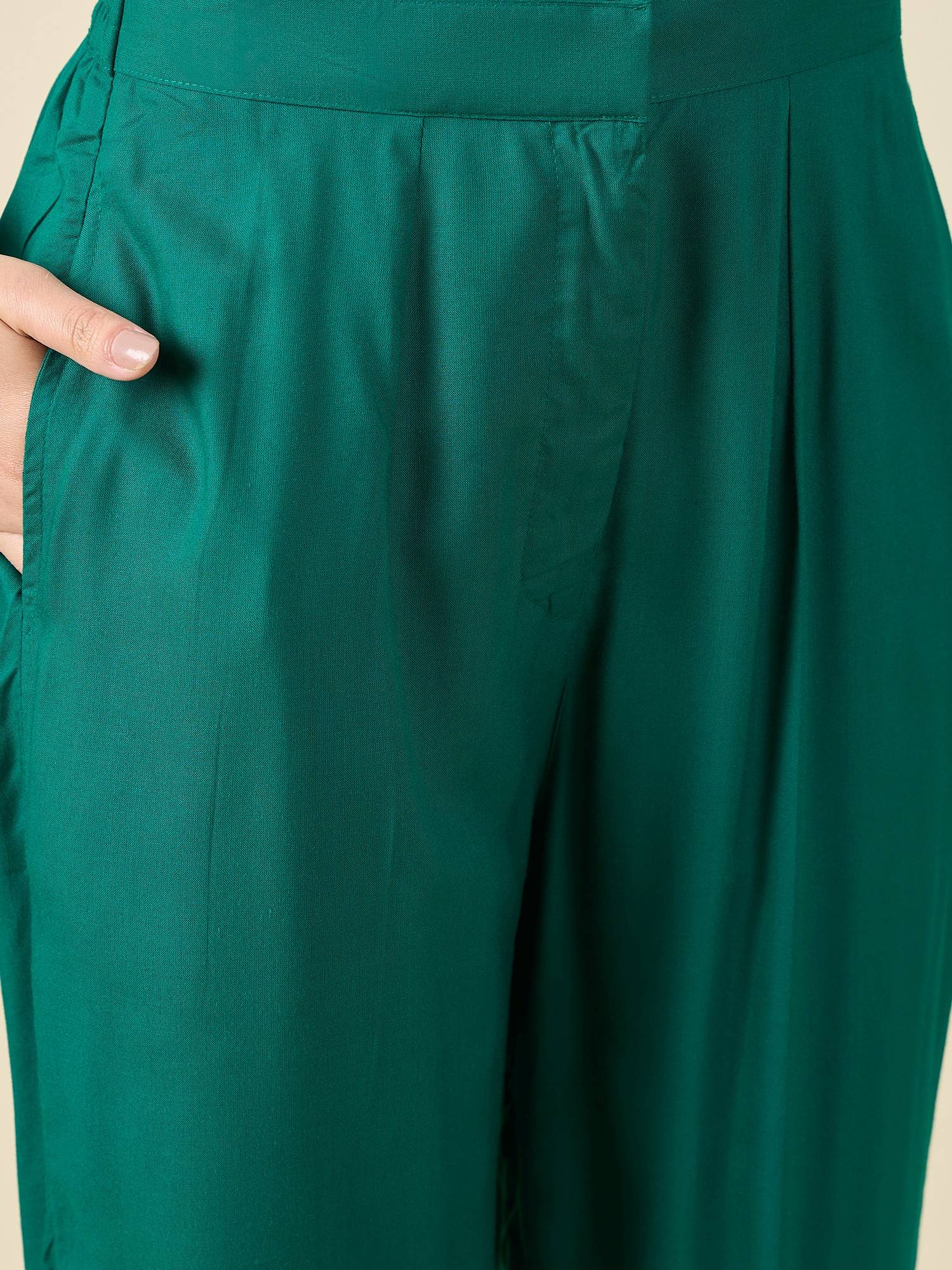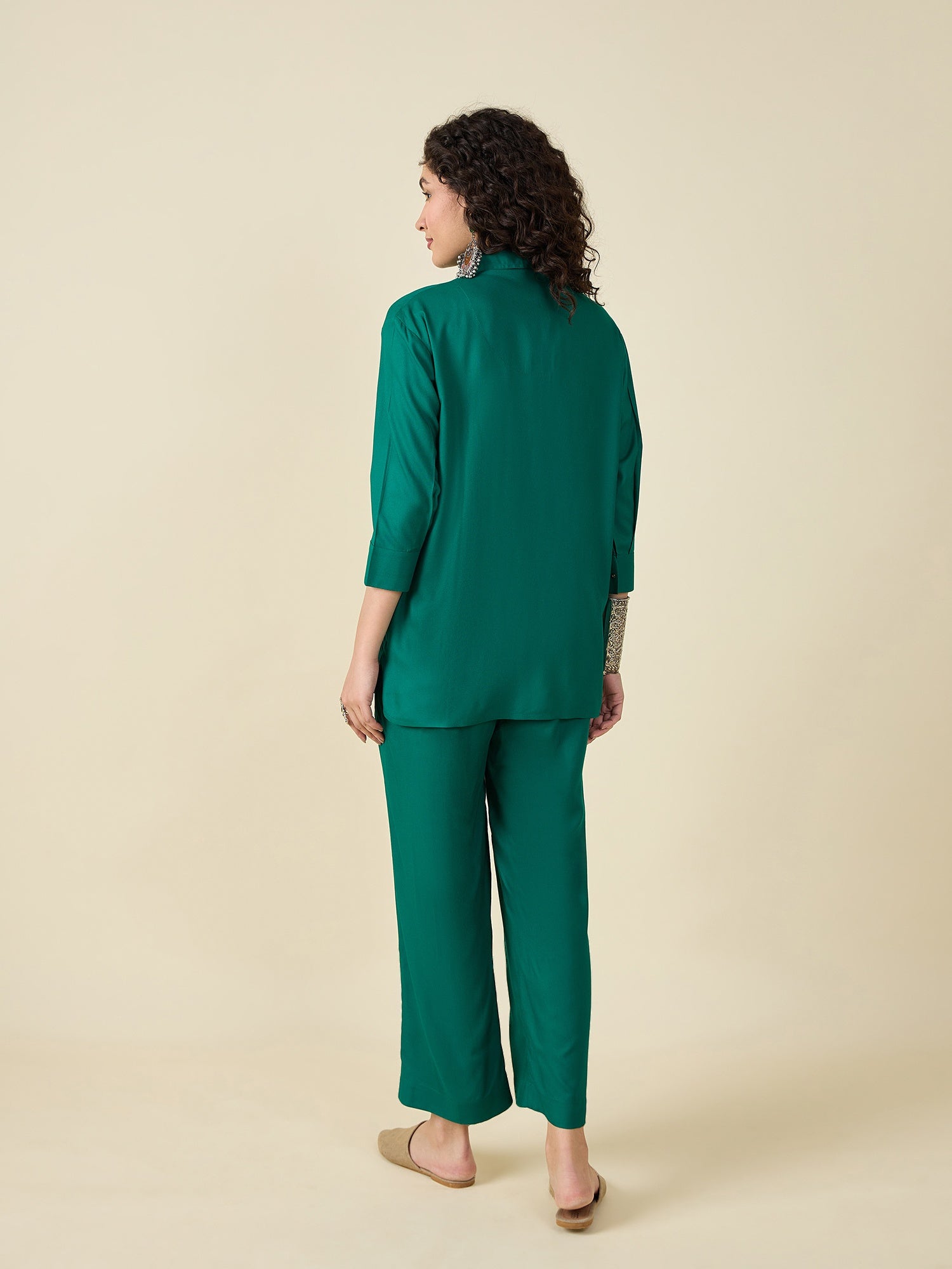 A refined blend of tradition and trend, this green kurta set features kaaj tanke-inspired embroidery with sleek button detailing. Paired with comfortable straight pants, it's perfect for smart, casual elegance.