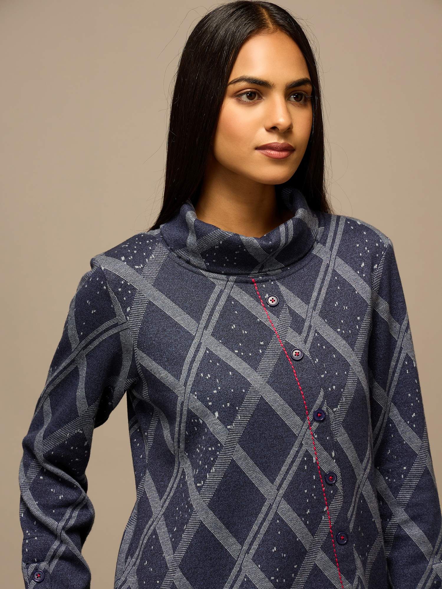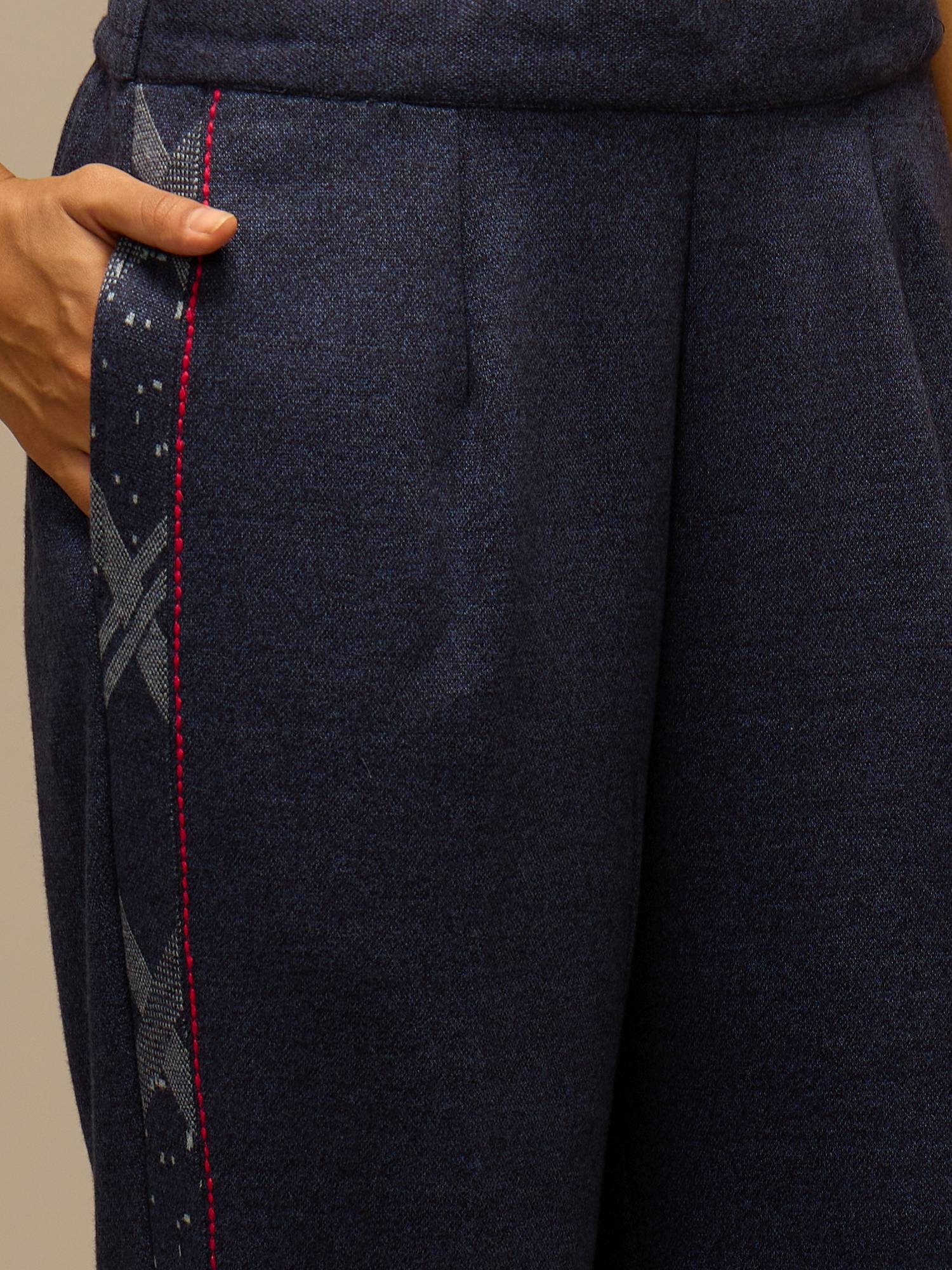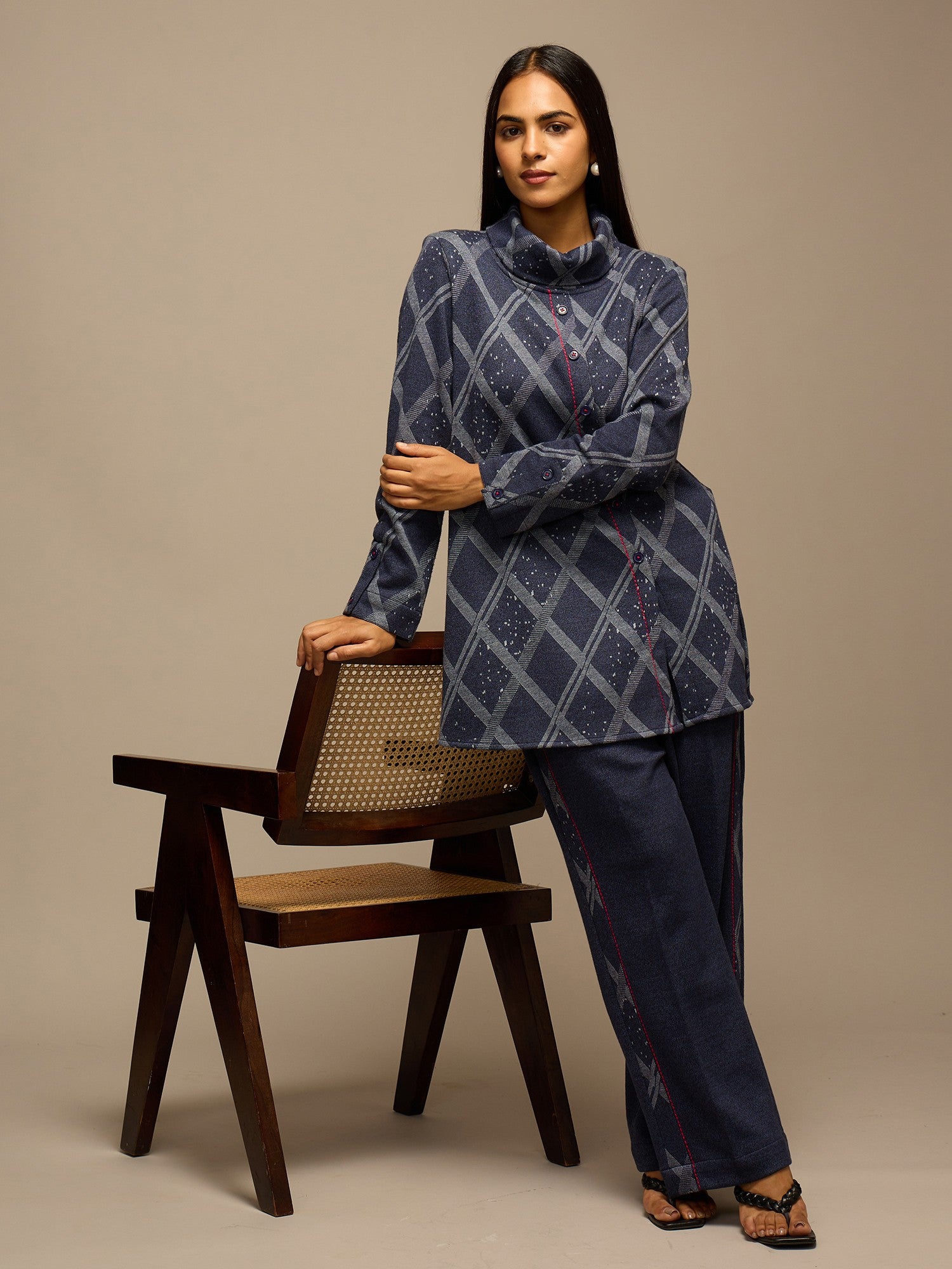 Step out in effortless style with this Indigo Knitted Co-Ord Set, designed to blend comfort and contemporary fashion. Crafted from high-quality knitted cotton, the regular-fit ensemble features a high neck top with full sleeves, enhanced by bright Chawal Tanka embroidery for a unique and elegant touch.