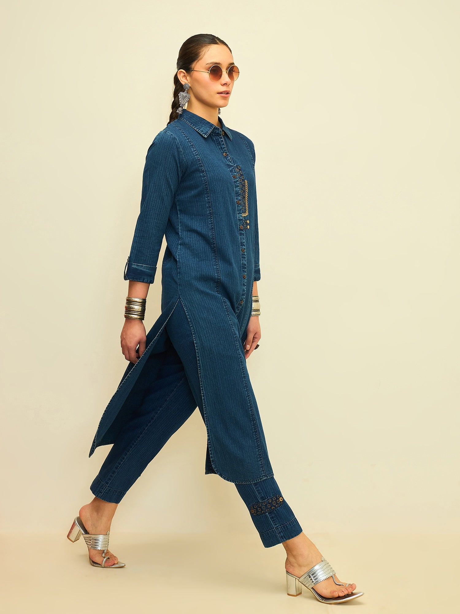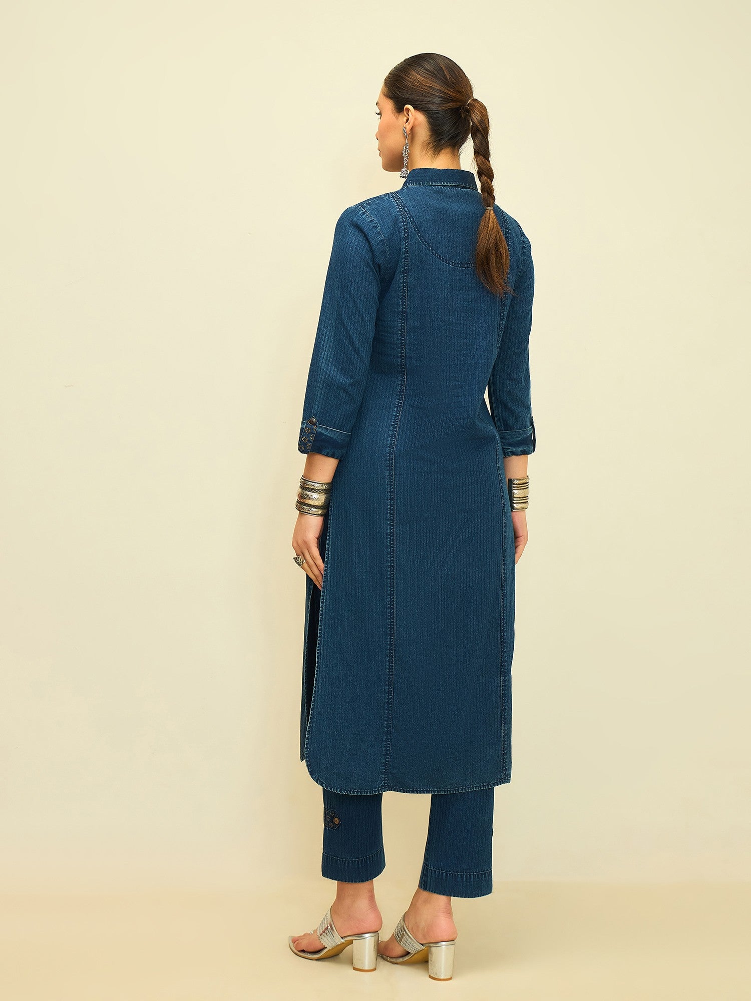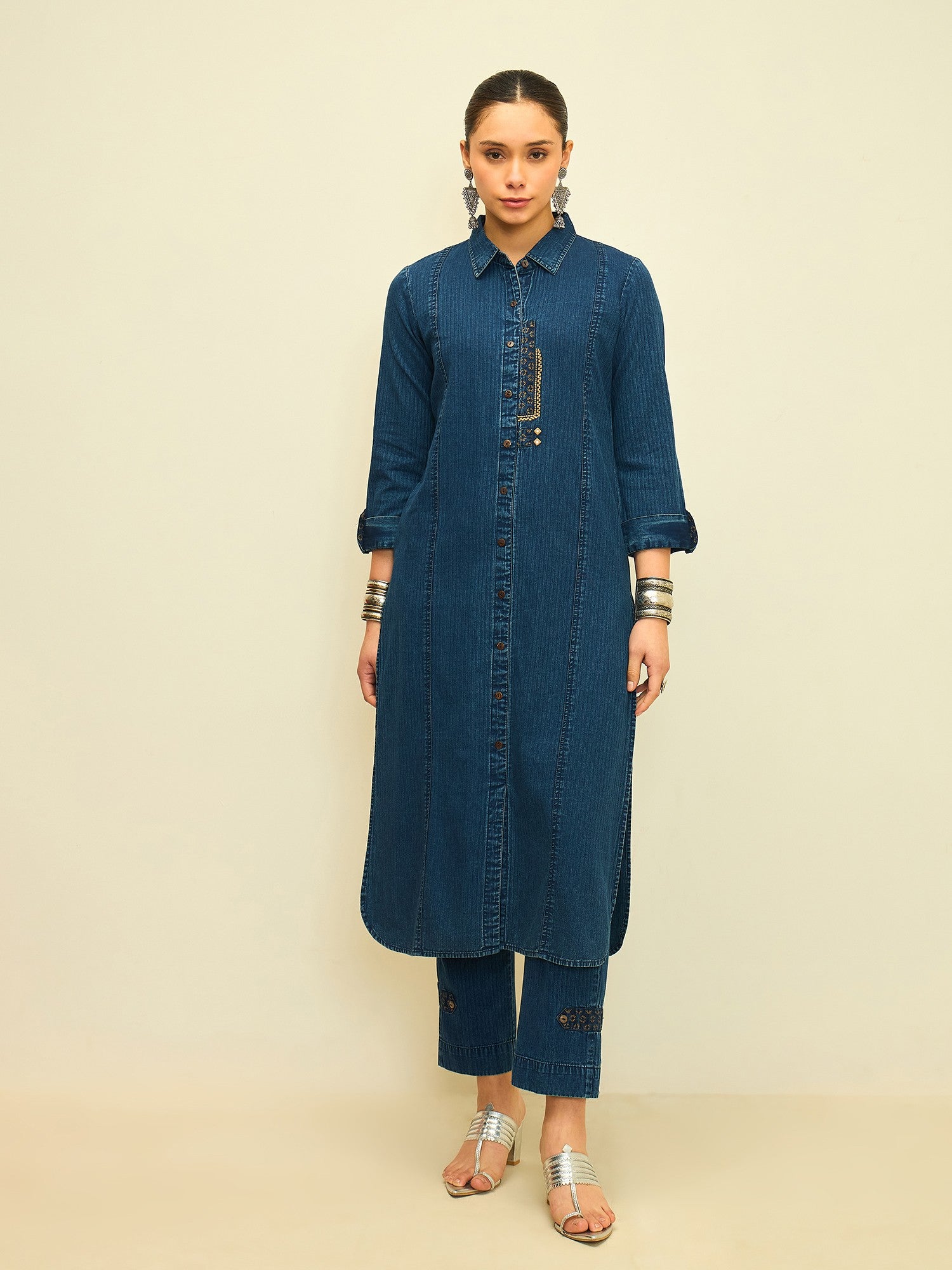 Crafted from soft, breathable denim, the kurta is paired with relaxed straight-fit pants finished with minimal accents. Clean lines and a timeless colour palette make this set ideal for workdays, casual outings, or understated statement dressing.