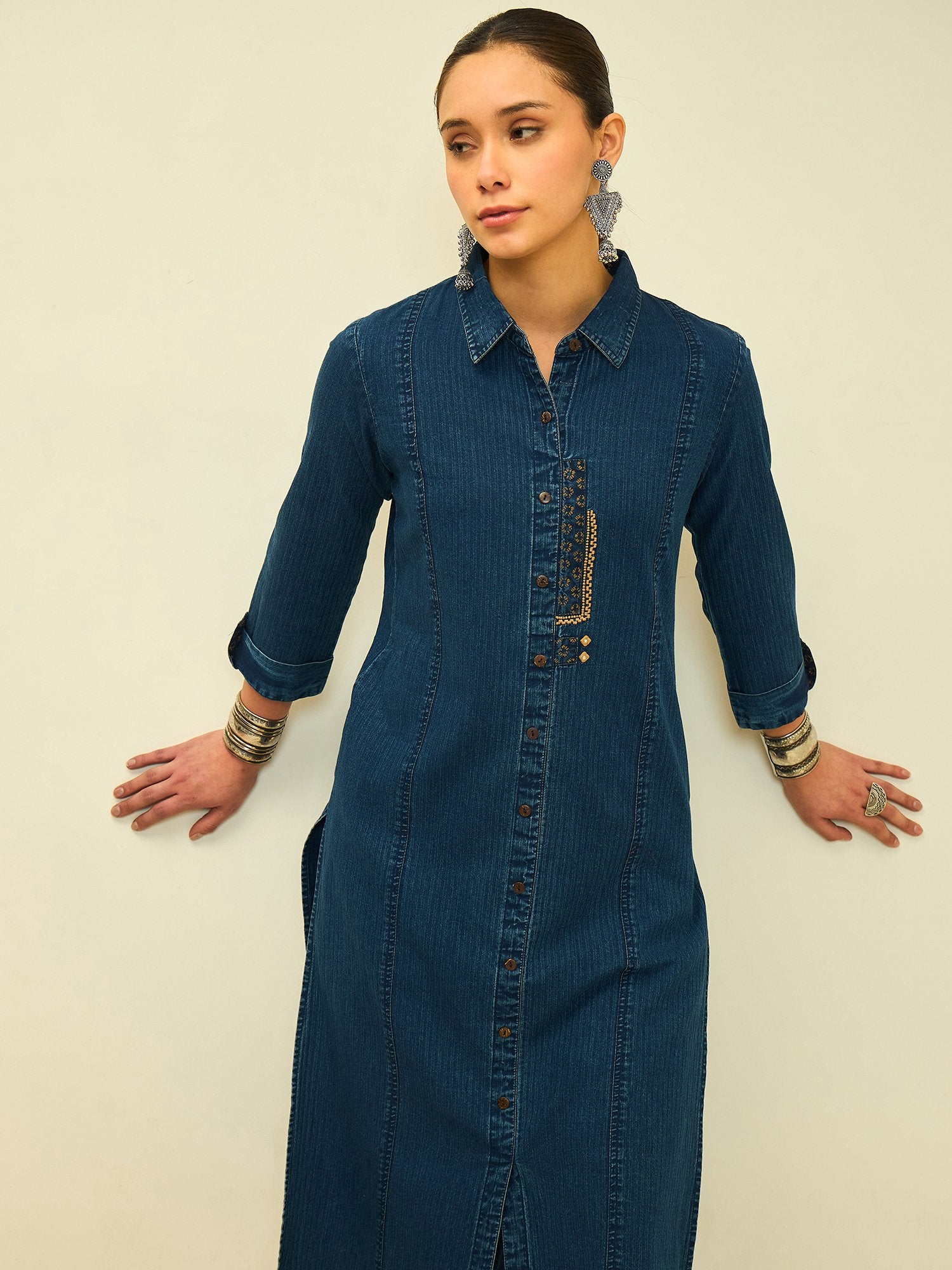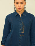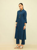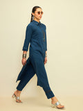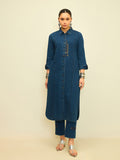 Refine your everyday wardrobe with this indigo denim kurta set, designed for effortless structure and modern ease. The straight-cut kurta features a classic shirt collar, full button-down placket, and subtle embroidered detailing that adds depth without overpowering the silhouette.