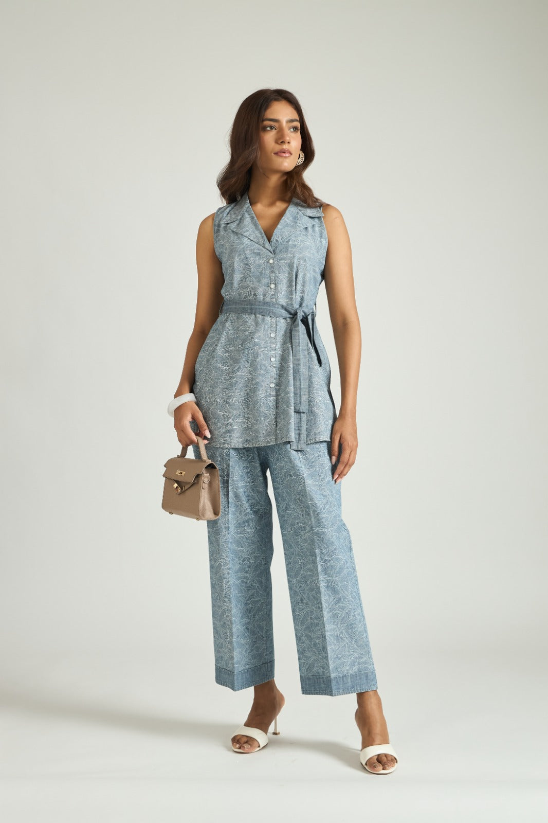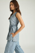 Crafted in structured denim, the sleeveless top features a sharp collar neckline and a flattering tie-up detail at the waist that adds shape to the silhouette. Paired with relaxed straight pants, the ensemble strikes a perfect balance between comfort and polished style.