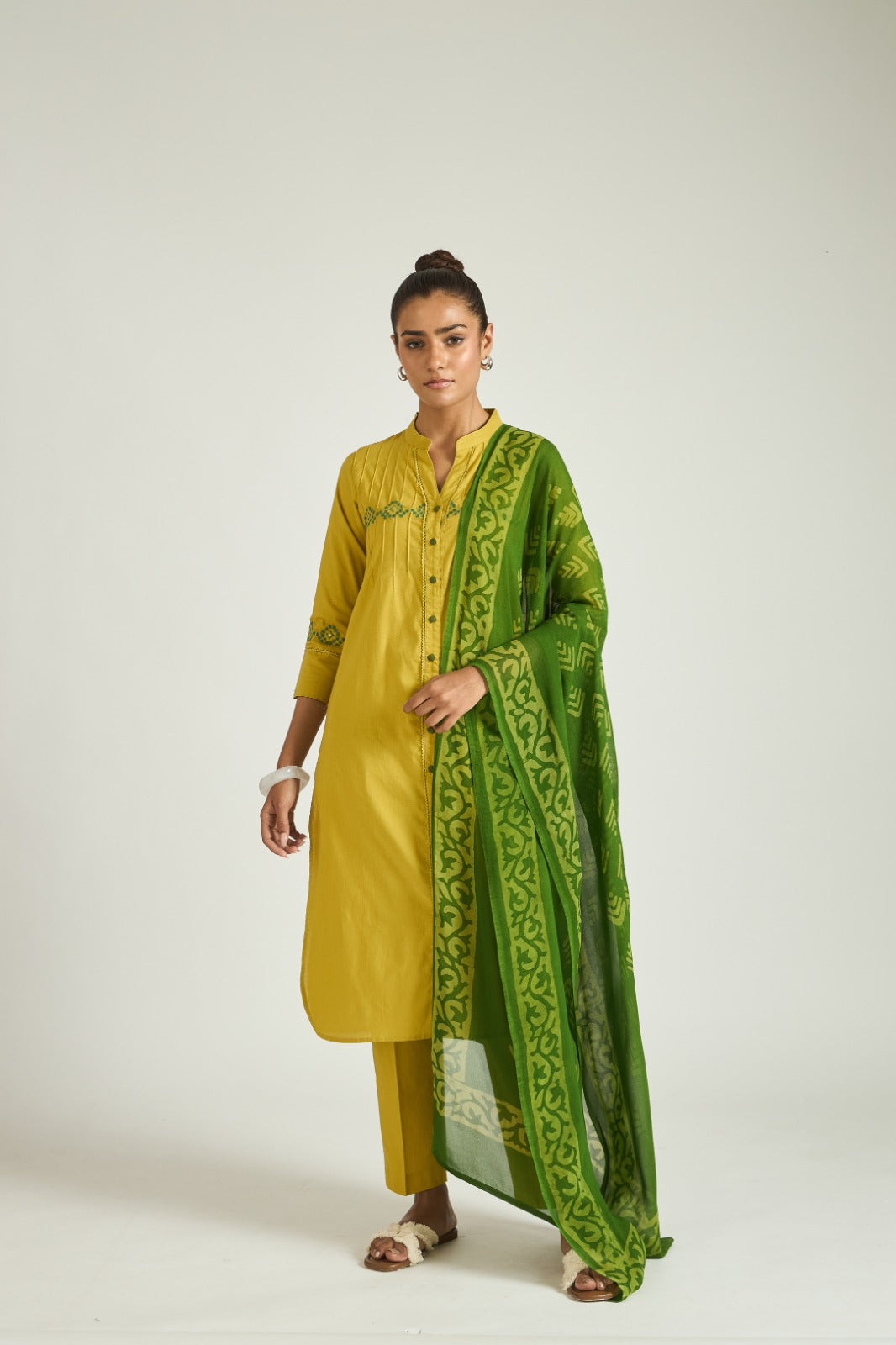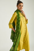 Crafted in breathable cotton, the kurta offers comfort and ease with a naturally relaxed fall. Paired with straight pants and a striking green printed dupatta, the ensemble creates a beautiful contrast that feels both traditional and contemporary.