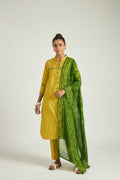 Radiant and refreshing, this kurta set brings together vibrant color with graceful craftsmanship. The warm mustard hue of the kurta is accented with delicate embroidery along the neckline and sleeves, creating a look that feels lively yet refined.