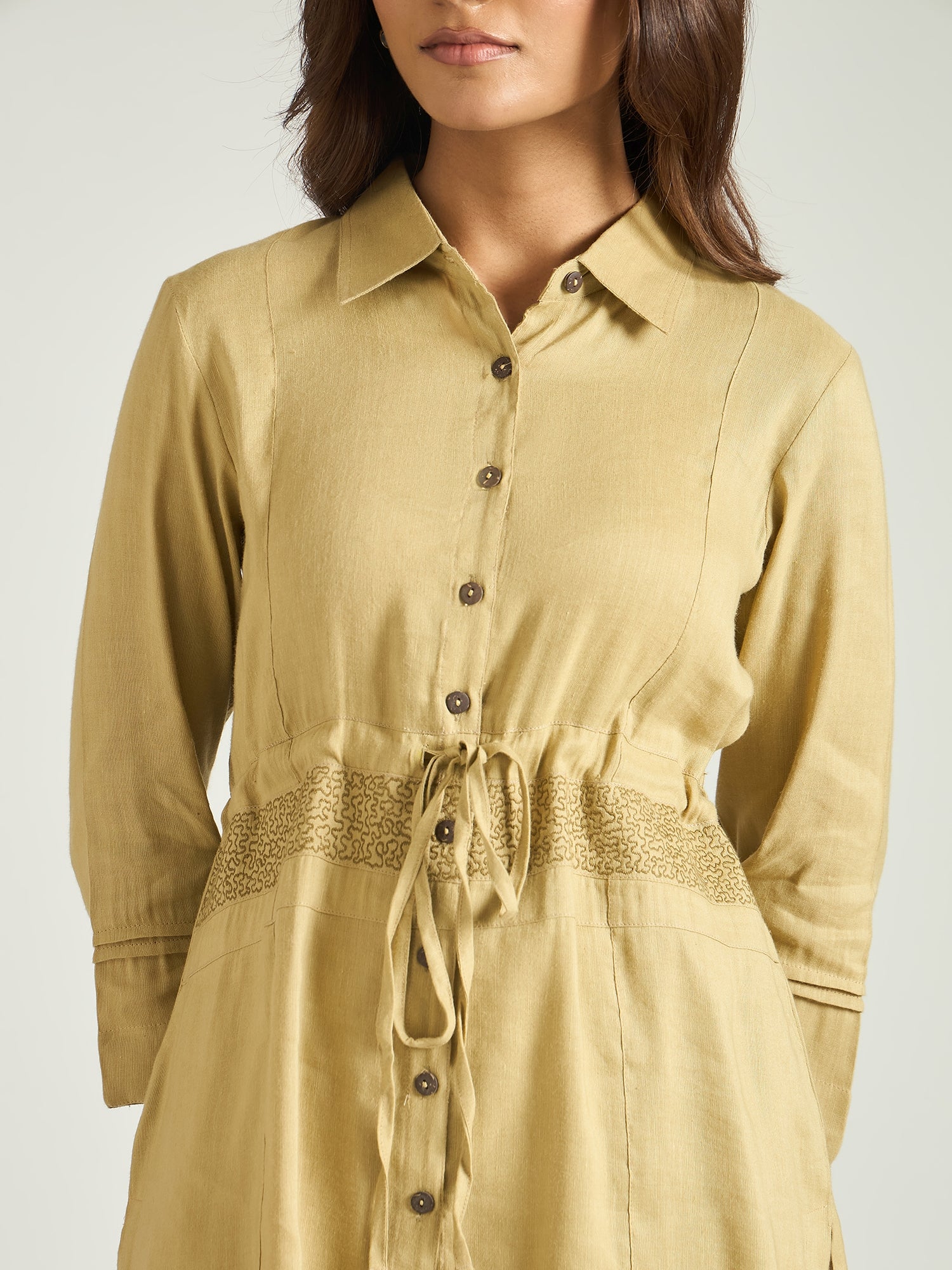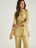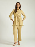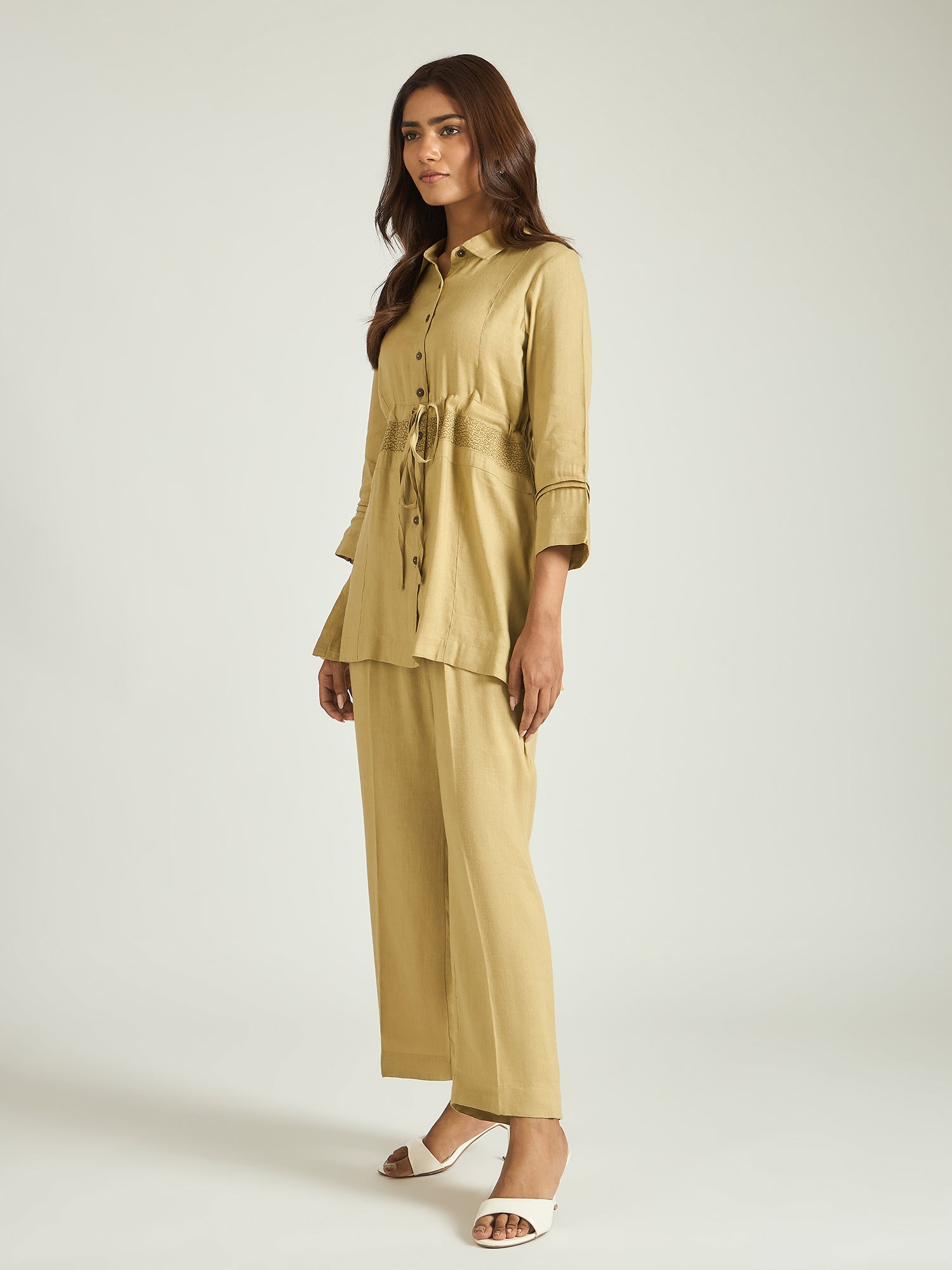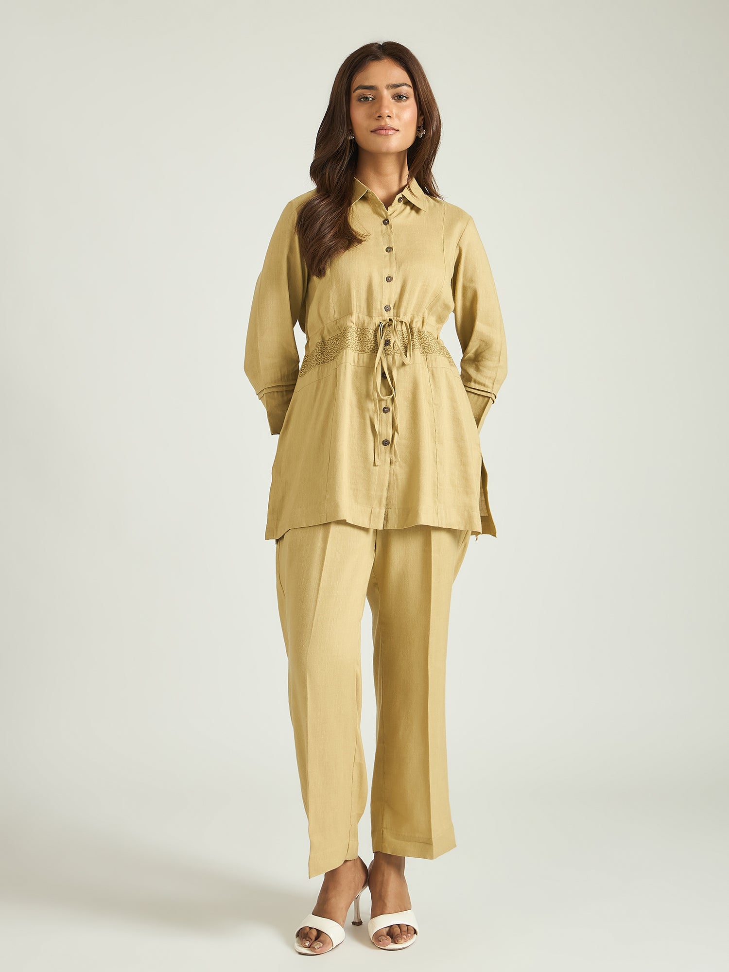 Crafted in breathable linen, the shirt-style top features a classic collar neckline and a subtle drawstring detail at the waist that creates a flattering shape. Paired with relaxed straight trousers, the set balances ease and polish—perfect for elevated everyday dressing.