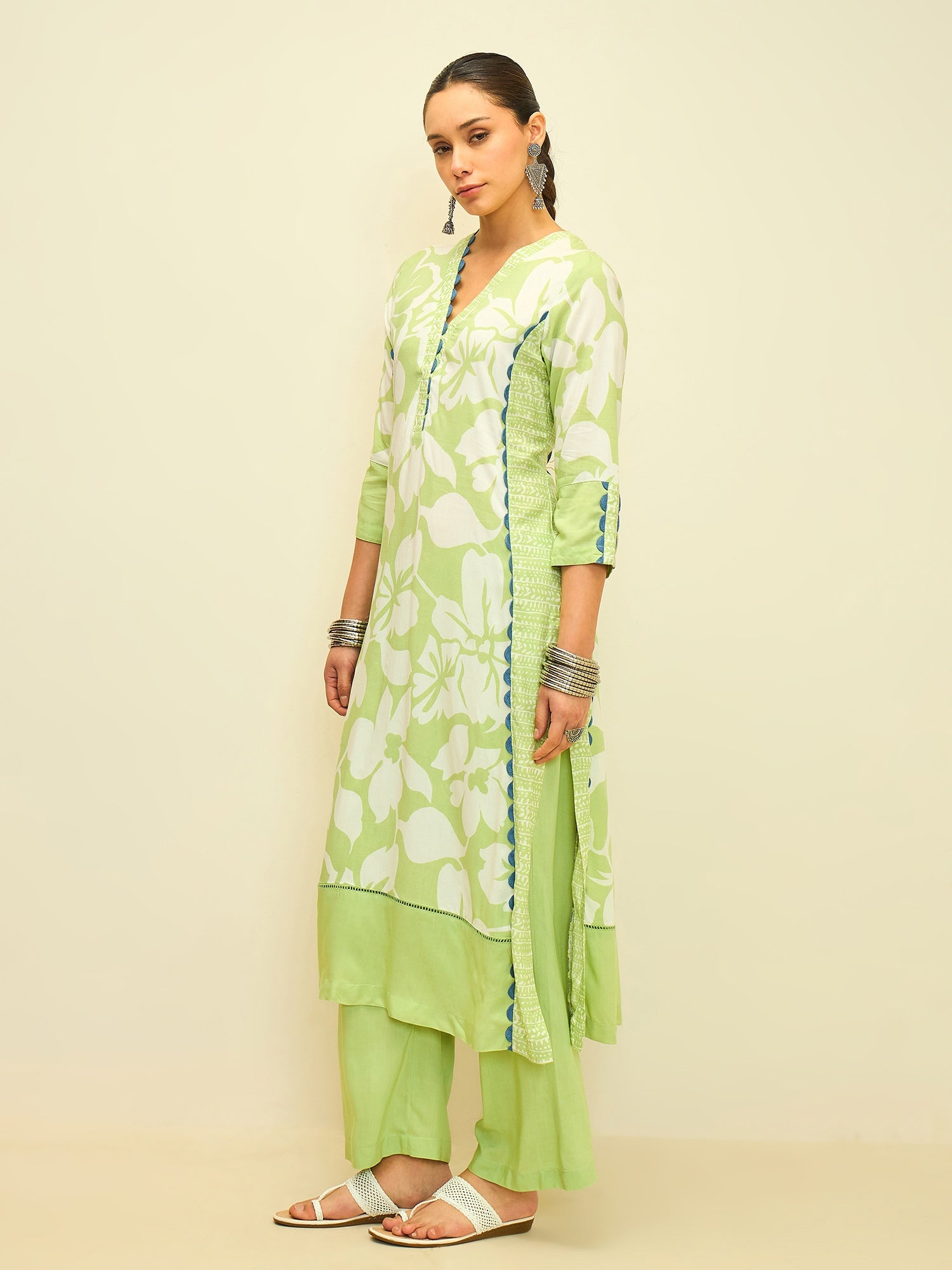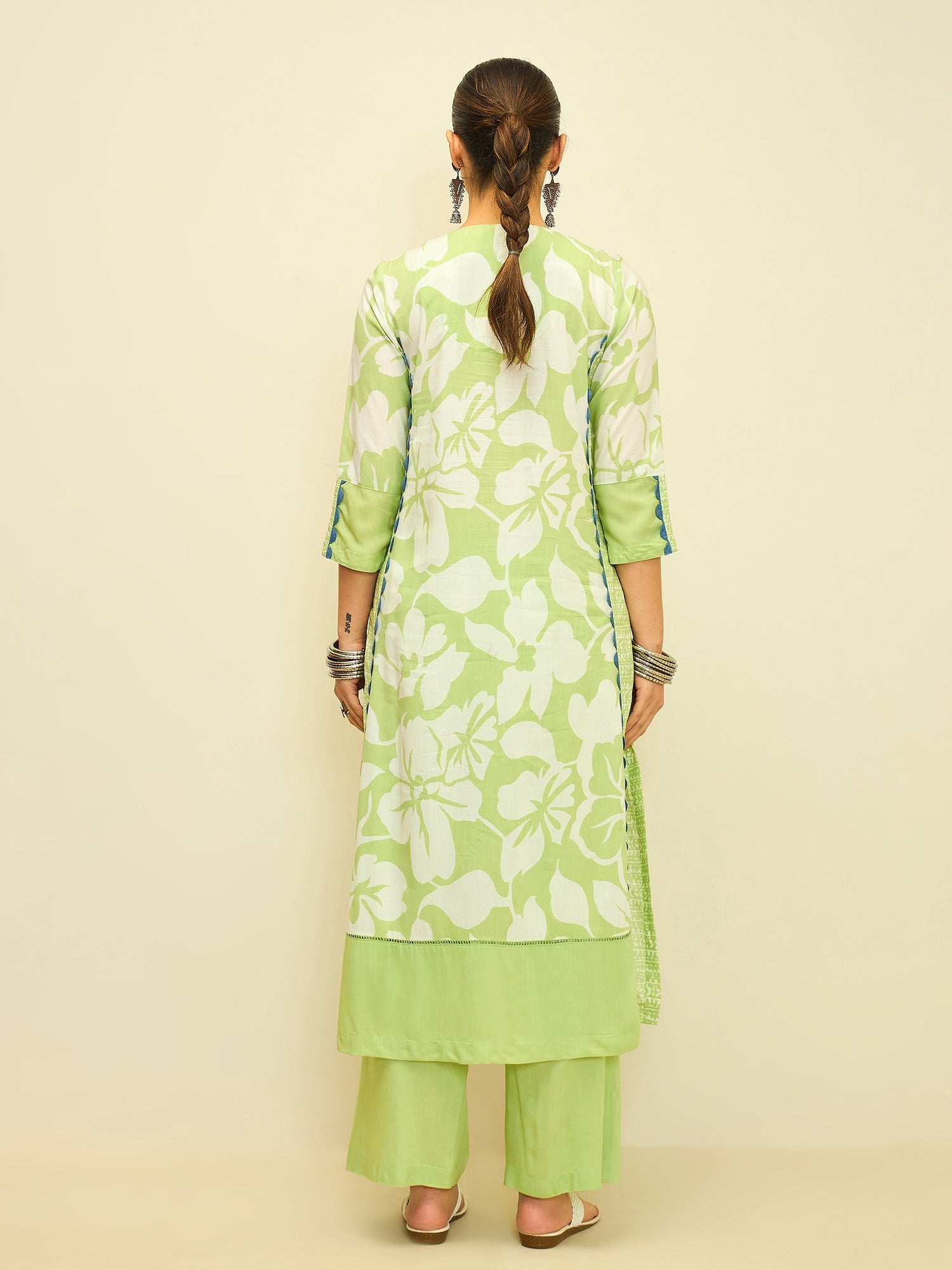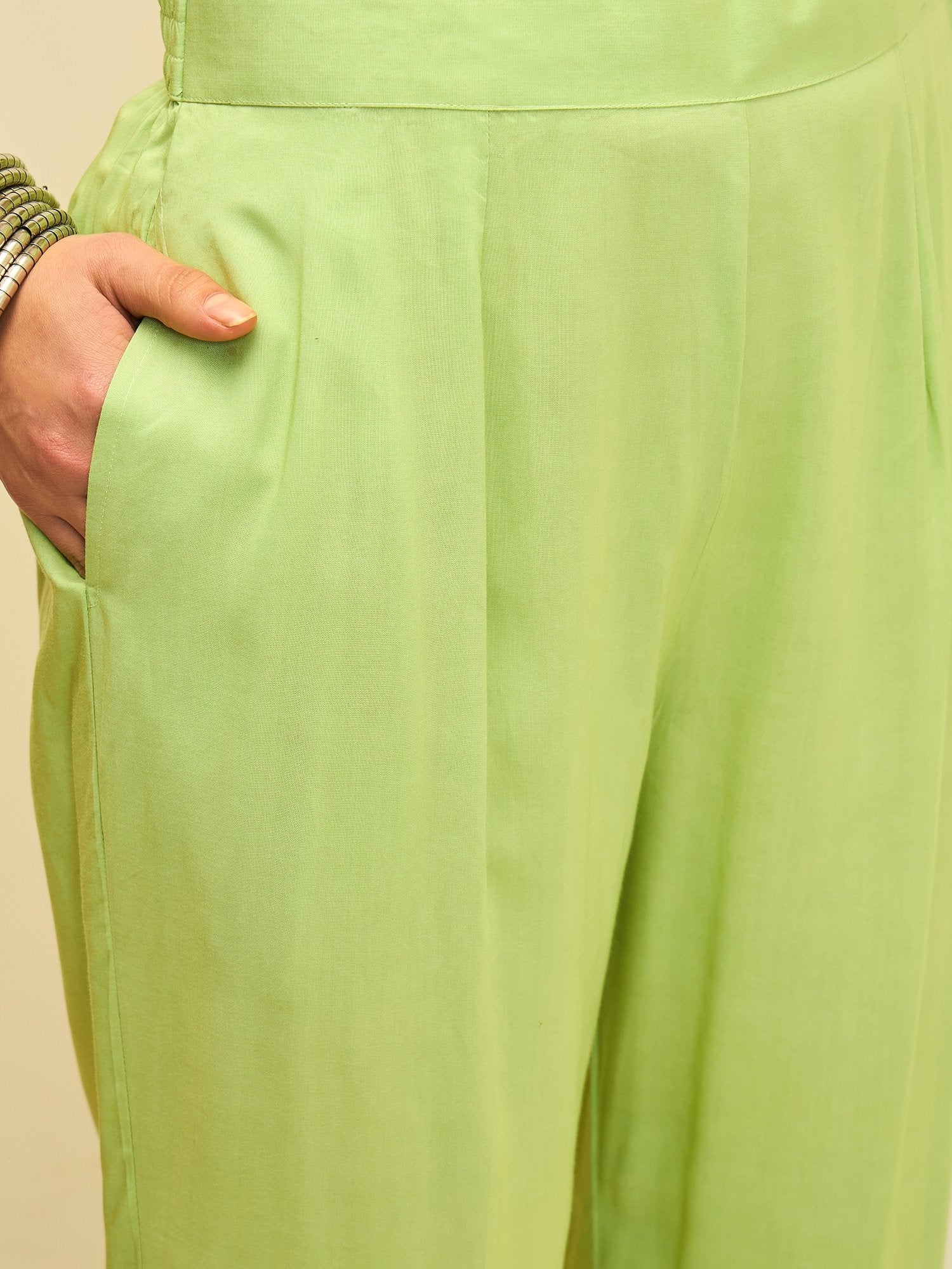 Crafted in smooth modal satin, the kurta offers a fluid drape and a soft sheen that elevates its everyday appeal. Paired with relaxed straight pants, the ensemble strikes the perfect balance between comfort and contemporary style.
