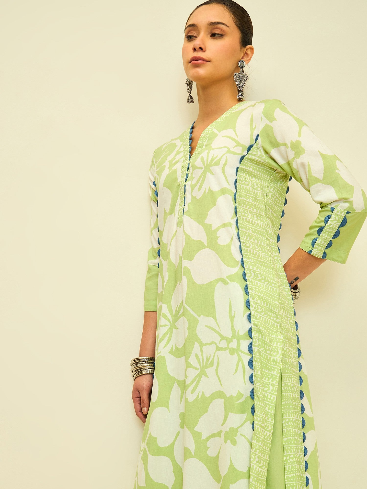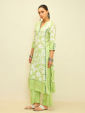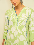 Fresh and vibrant, this kurta set brings together soft floral charm with a modern silhouette. The lively lime hue is adorned with bold floral prints, creating a look that feels bright, youthful, and effortlessly elegant.