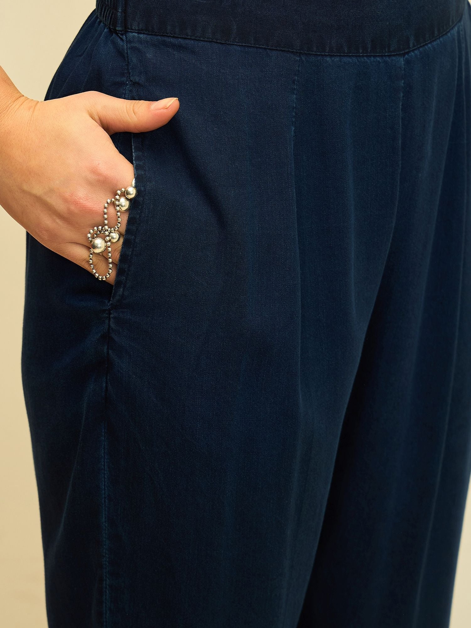 Crafted in rich indigo denim, the vertical contrast stitch detailing elongates the frame and adds a refined design edge. Paired with relaxed straight-fit pants, this set is designed for effortless movement and everyday statement dressing.