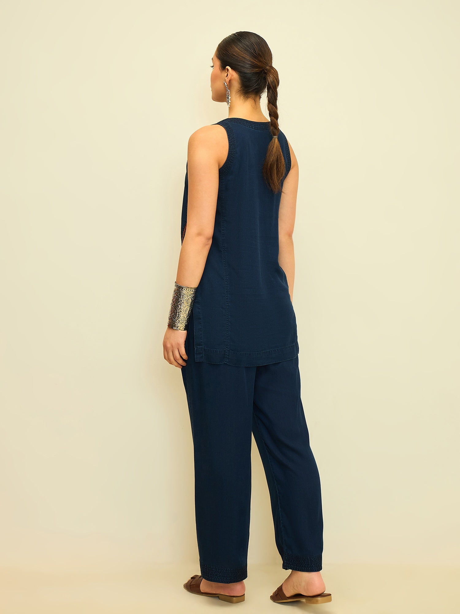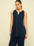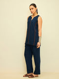 Clean tailoring meets subtle contrast in this contemporary denim co-ord. The sleeveless silhouette with a round neckline and soft V-slit creates a structured yet breathable shape, perfect for warm days and layered styling.