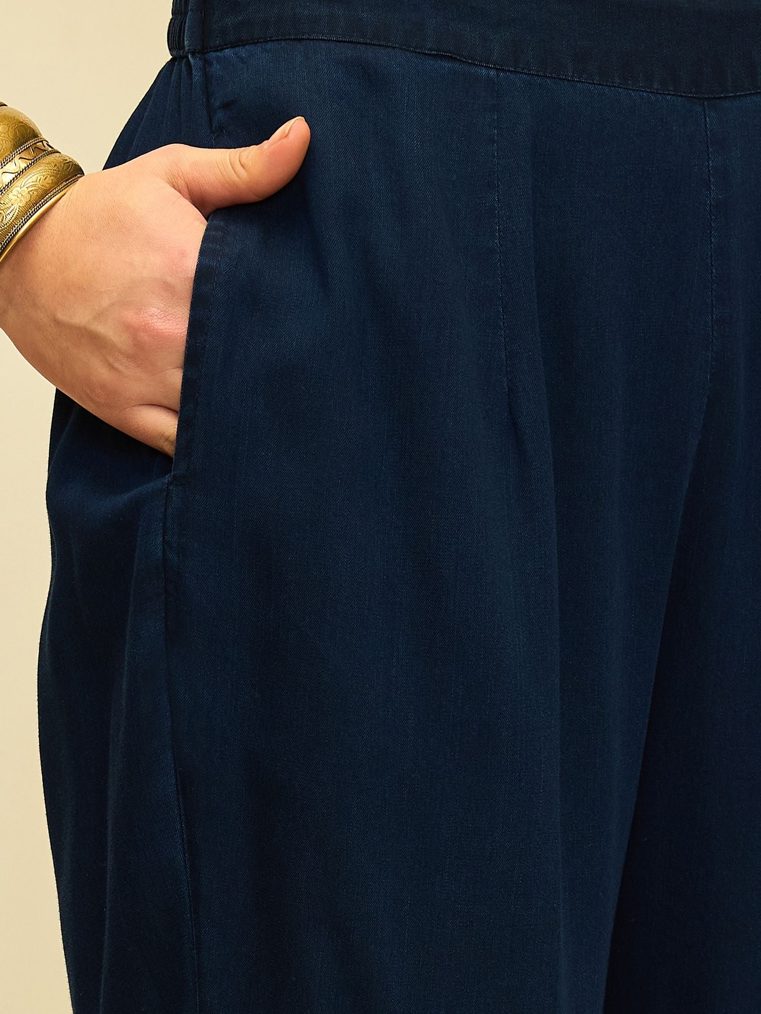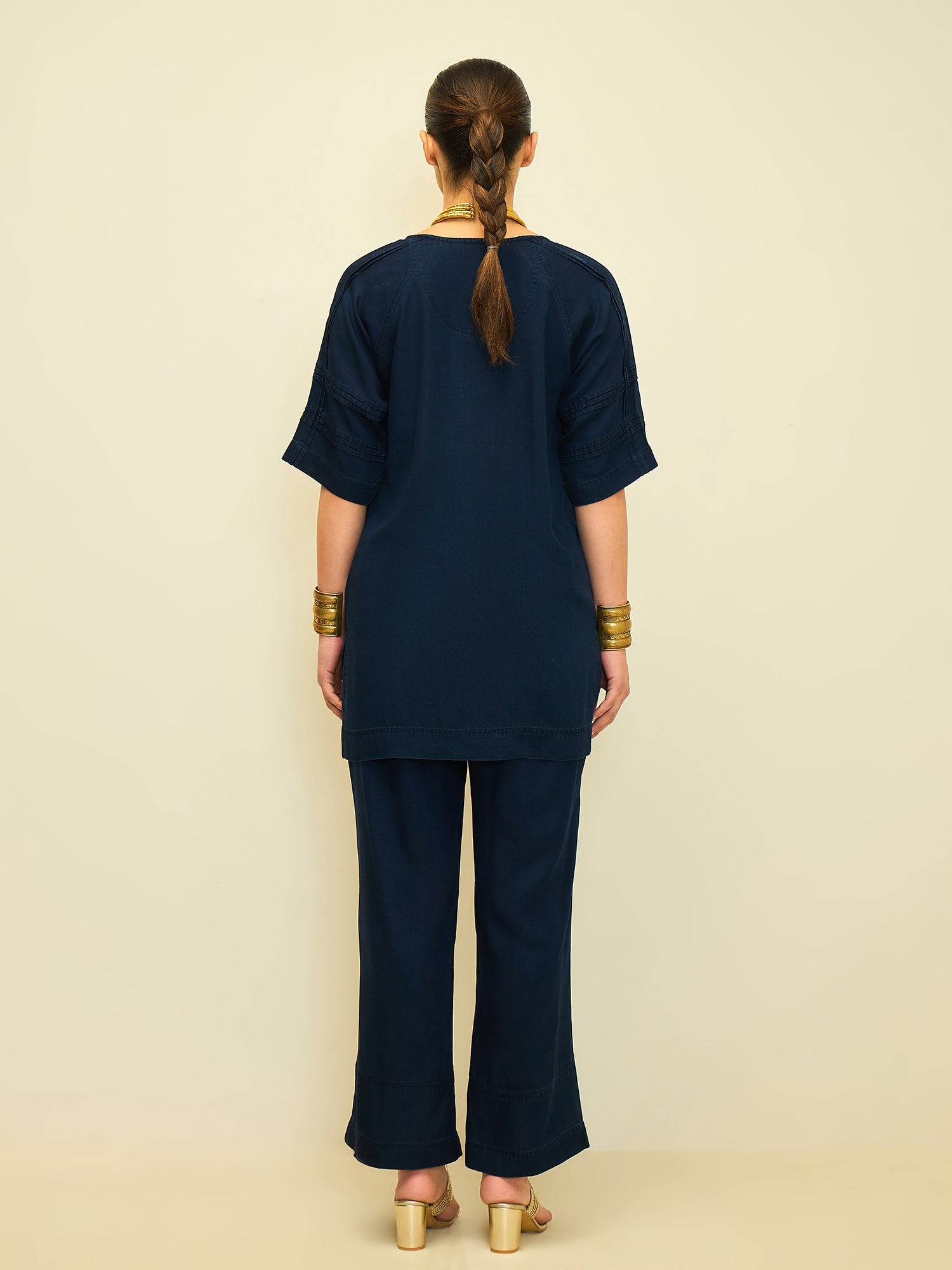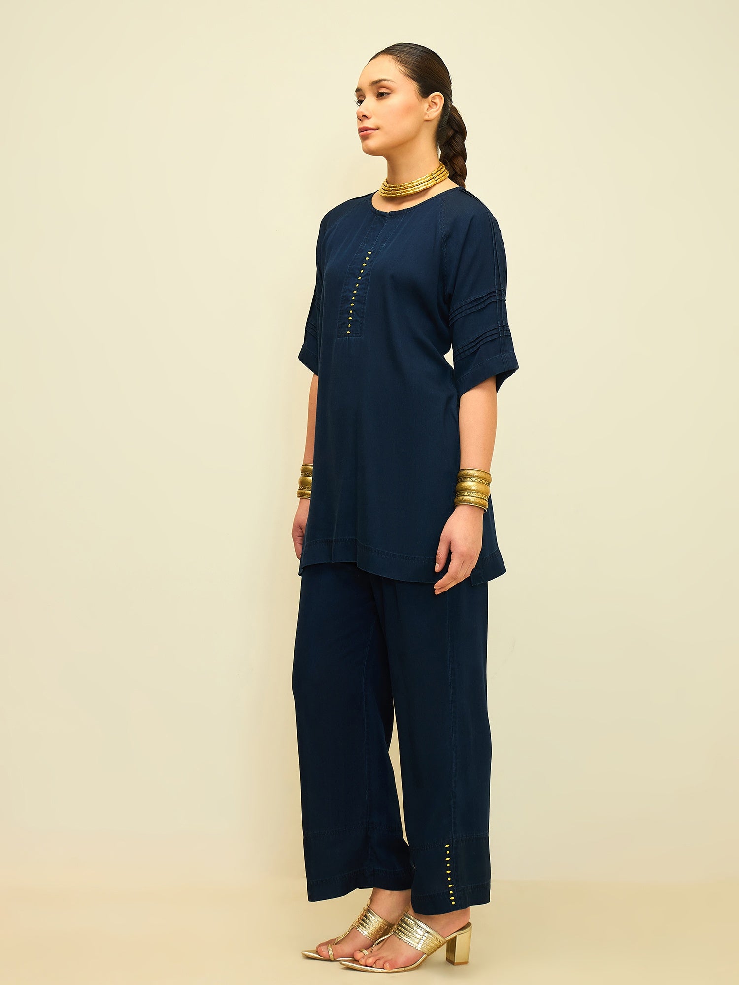 Paired with straight-fit pants finished with coordinated stud detailing at the hem, this ensemble is designed for effortless power dressing. The deep indigo tone makes it versatile, while the silhouette keeps it modern and easy.